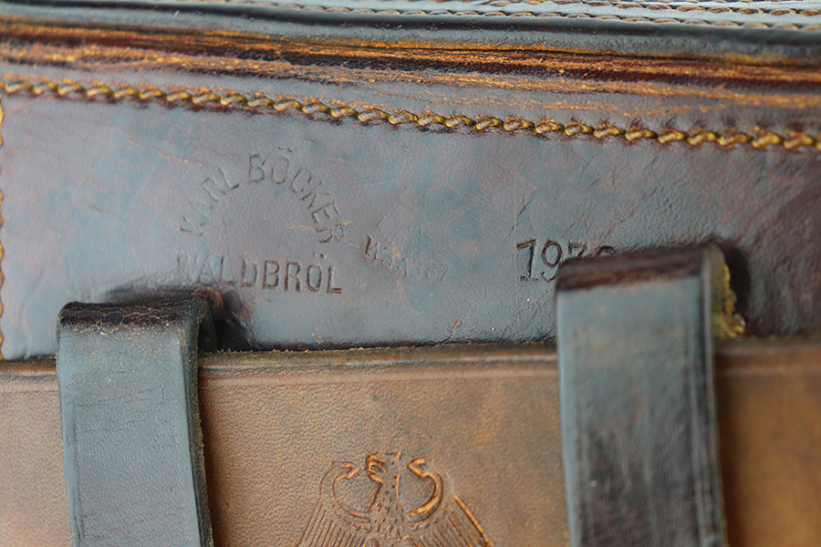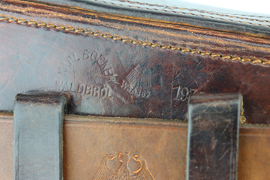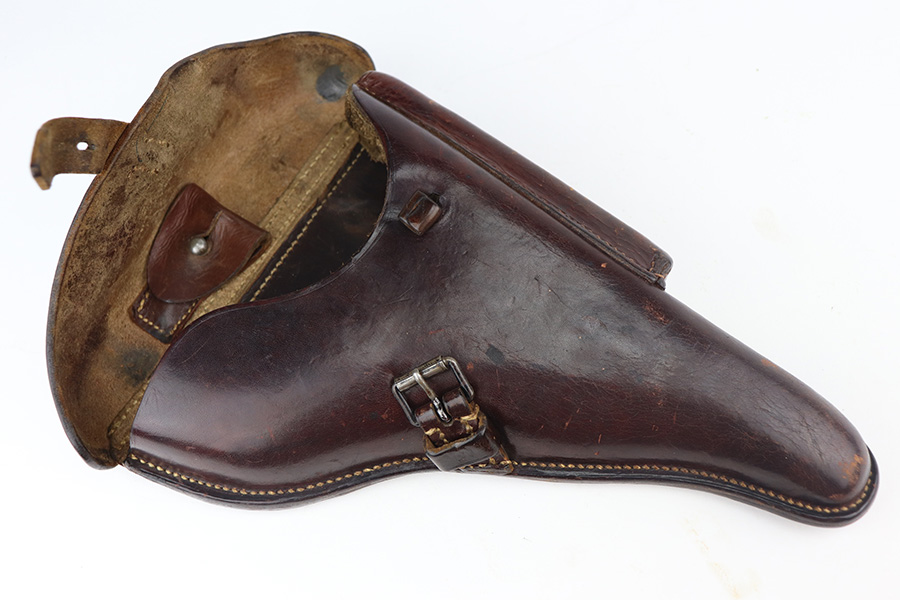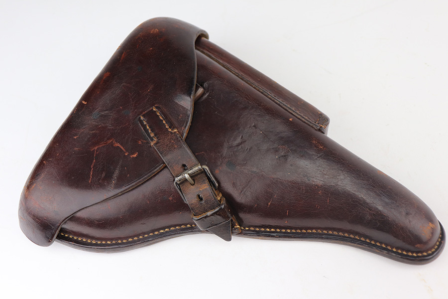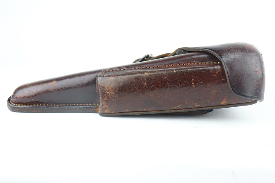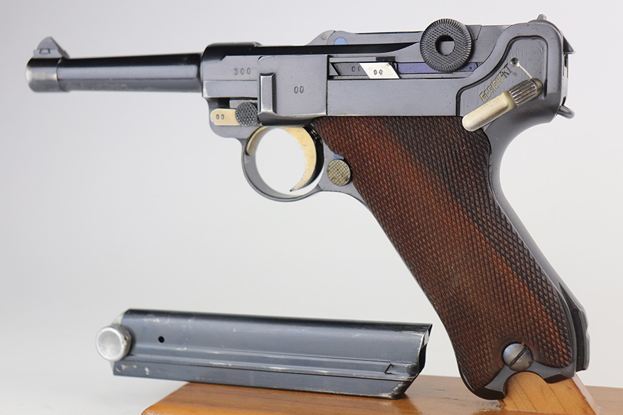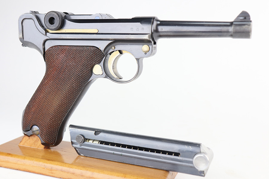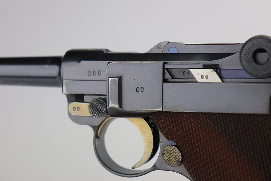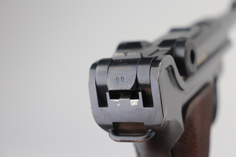 6/21/21 – This is an excellent example of a Mauser Luger issued to the Nazi military in 1936. The gun is matching and has the proper “Eagle 63” military proofs. The rig comes with an original matching magazine and an excellent 1936-dated holster. The gun has retained about 97% of its original finish. There is very minor wear on the side plate, side rails and around the muzzle. Some tiny handling marks on the right side rail and front strap. Some very tiny freckling on the straps. Excellent matching grips with a tiny chip at the bottom of the left grip. Excellent, shiny bore with a hint of freckling in the grooves. The leather piece with the holster is just to hold the shape of the belt loops.