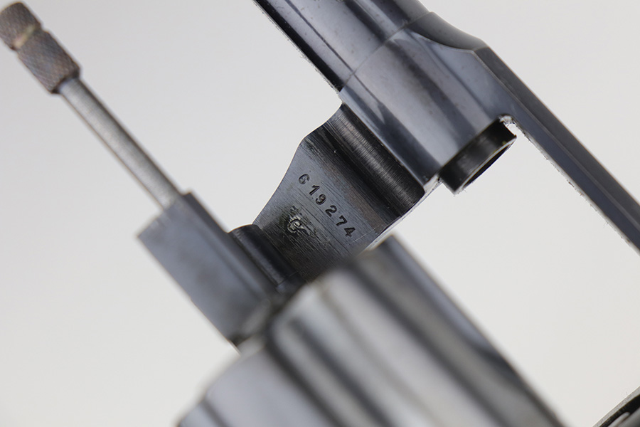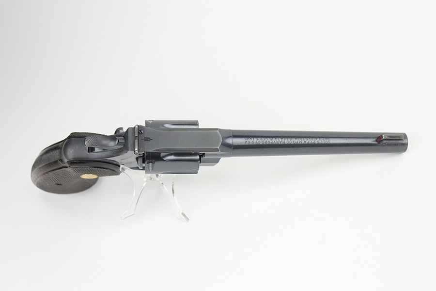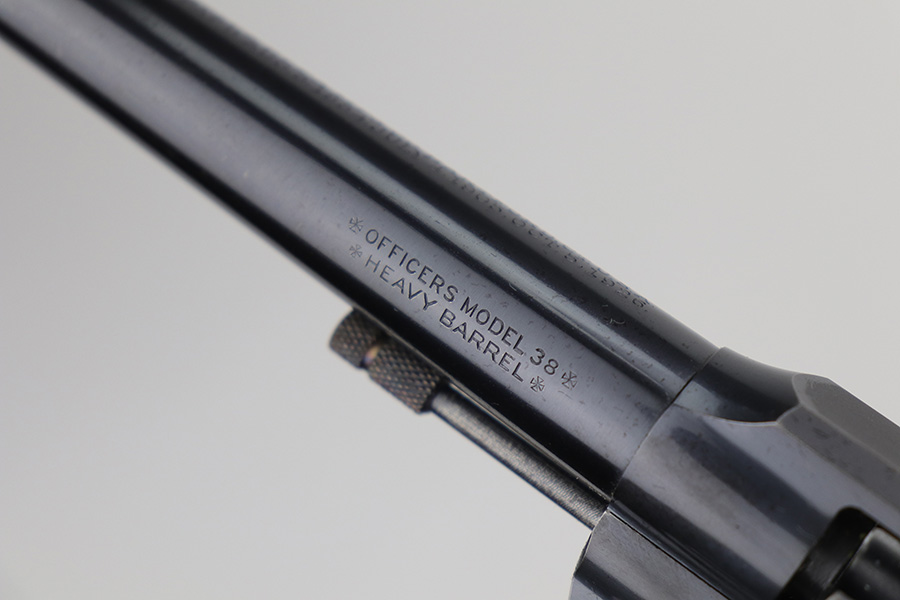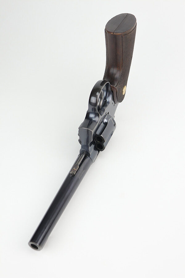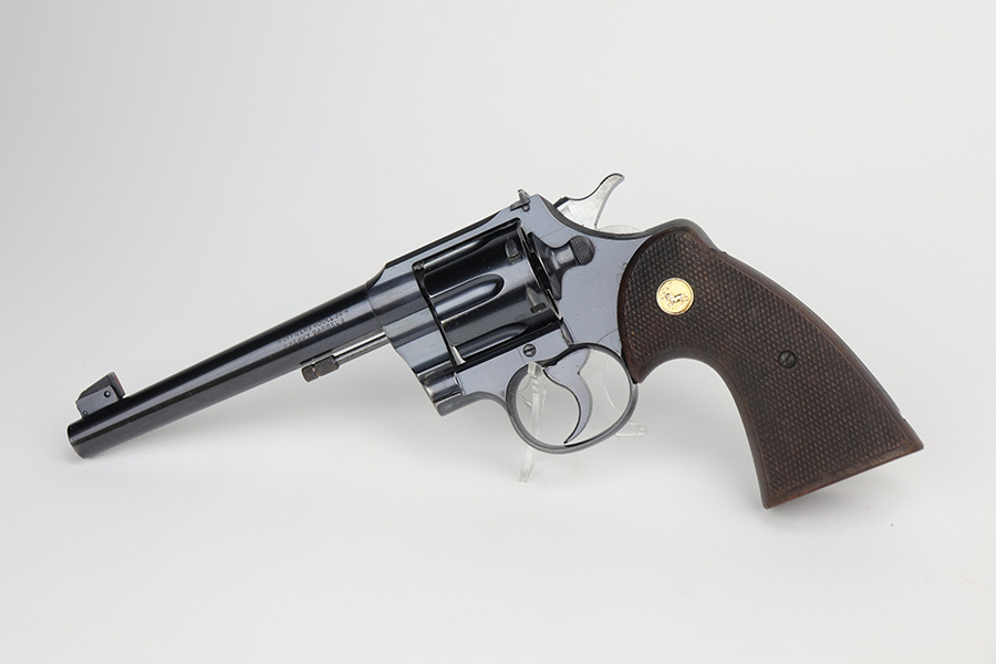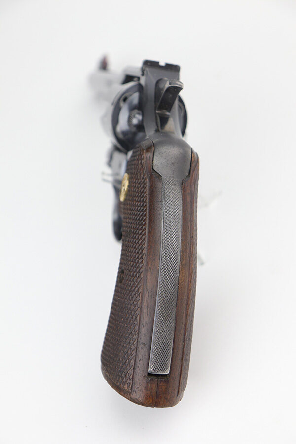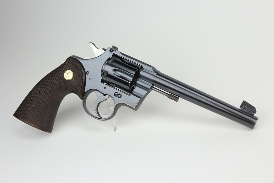 10/29/21 – This is an excellent example of a Colt Officers Model Target Revolver manufactured in 1937. It is chambered in .38 Caliber and has a 6″ heavy barrel. It is all matching and has retained about 95% of its beautiful Colt bluing. There is very minor wear on the front edges of the frame, around the muzzle, and hints of wear on the high edges of the cylinder. A few light handling marks on the underside of the trigger guard and a light roll mark on the cylinder. Some dulling in the finish and tiny dots of oxidation on the back strap. The cylinder is tight and the action is smooth. There are tiny dots of oxidation on the barrel and on the right side of the frame. Comes with excellent walnut grips. The bore is mint.