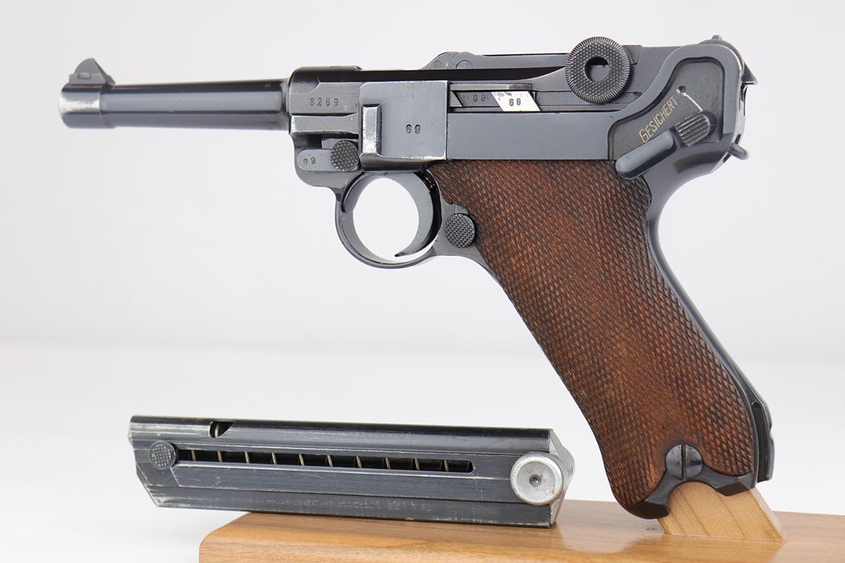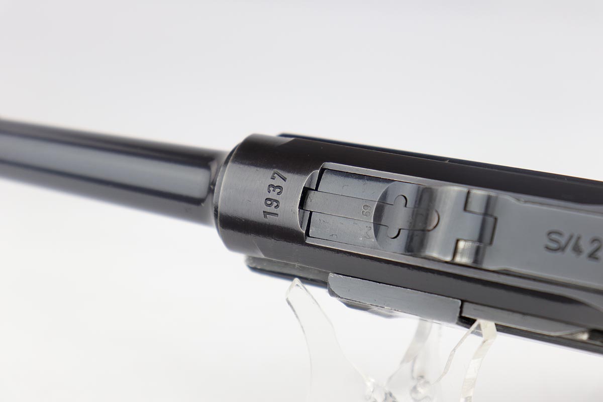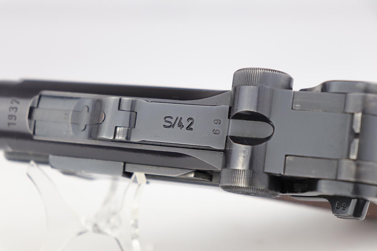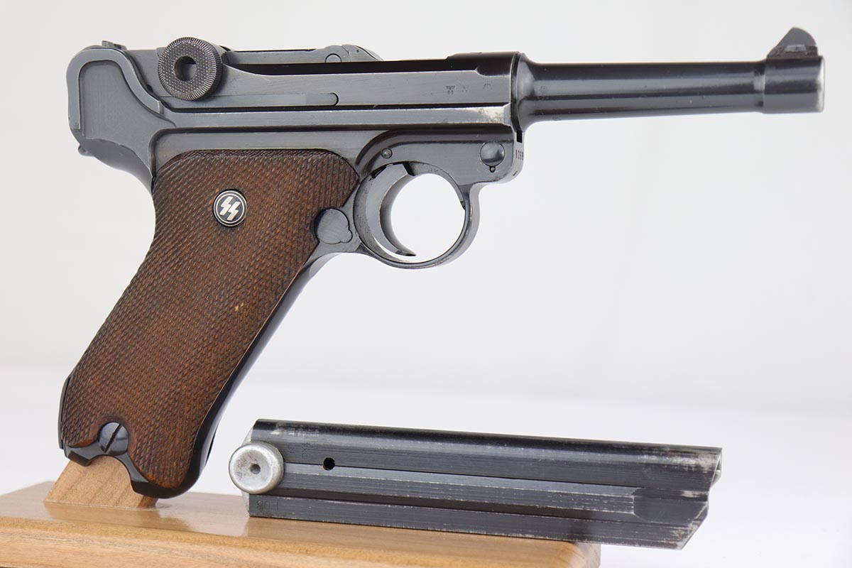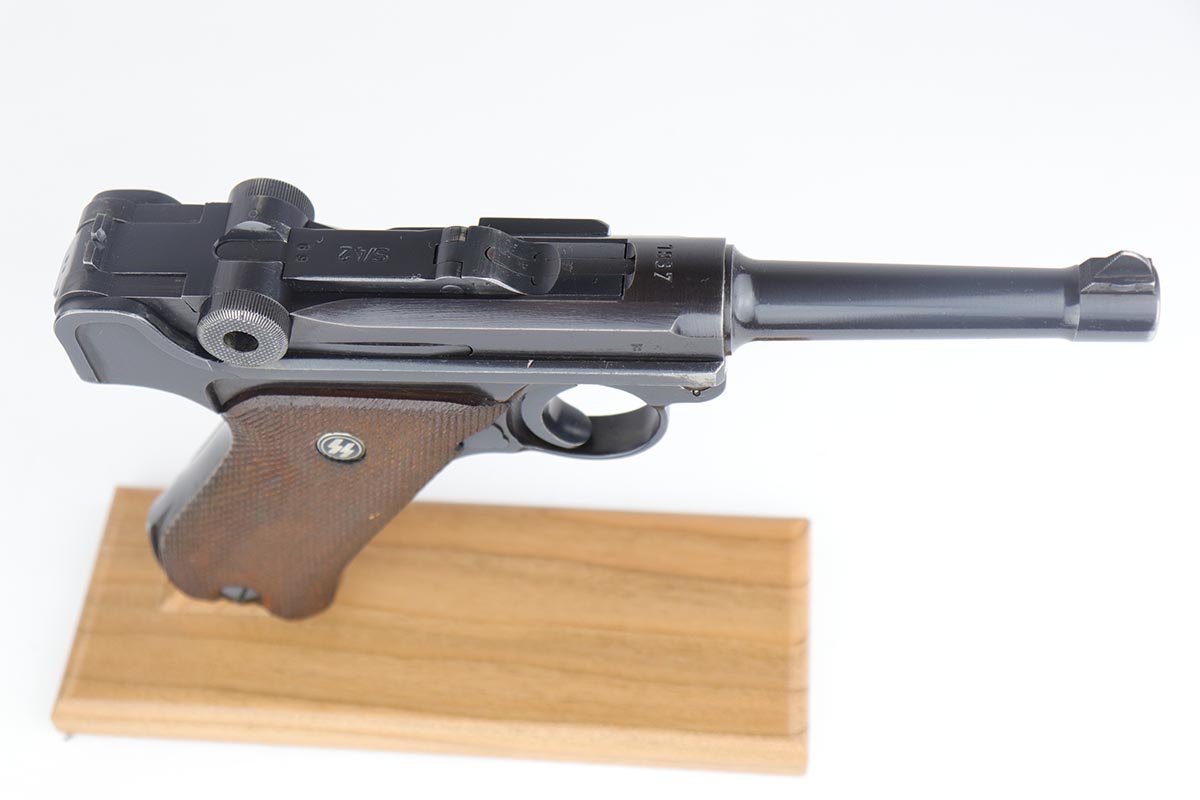 4/19/19 – This is an excellent Nazi Mauser Luger from 1937. It is a second variation Luger from that year, with blued small parts. The pistol is all matching and original with about 97% blue remaining, with all the wear visible on high edge areas. Period original but mismatched magazine. Terrific bore. Excellent original grips, which are matching to the pistol. The right panel does have an SS emblem installed, whether by GI captor or previous collector.