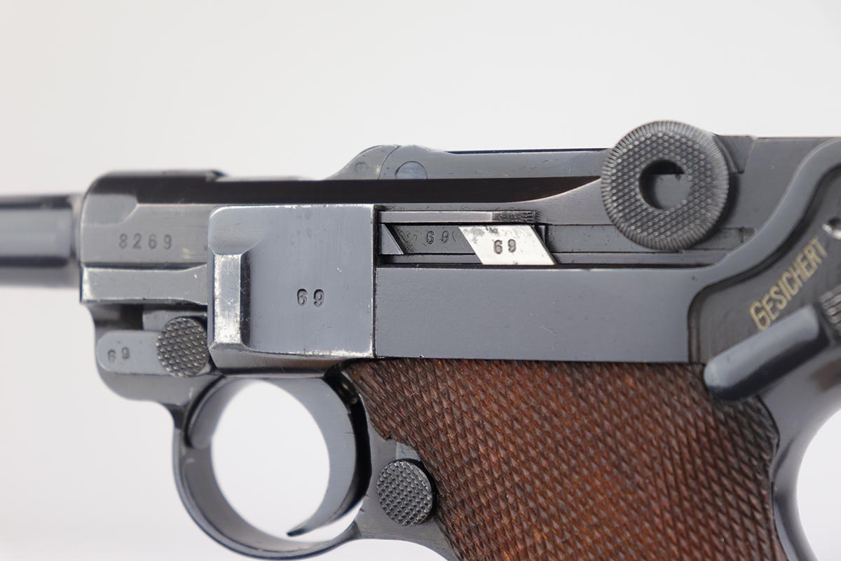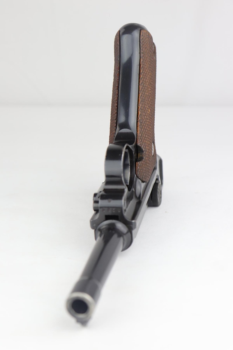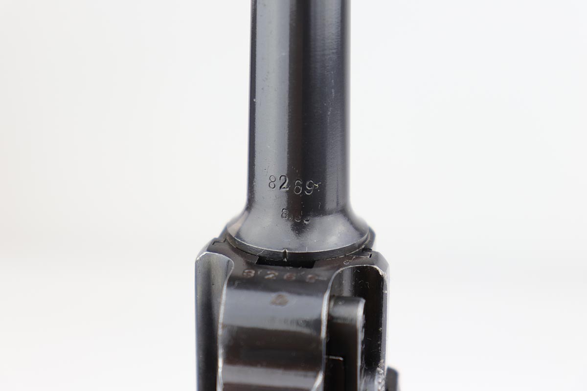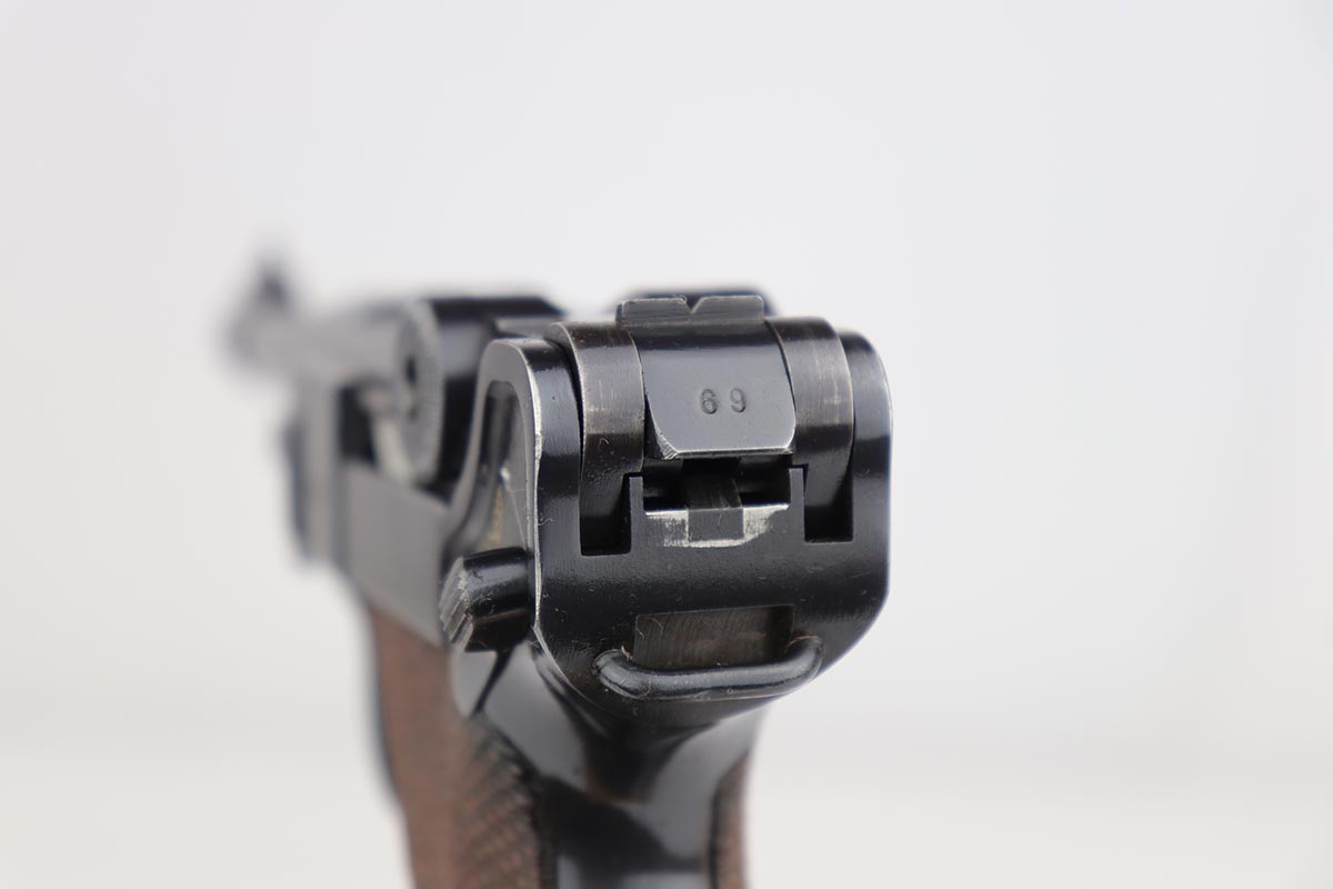 4/19/19 – This is an excellent Nazi Mauser Luger from 1937. It is a second variation Luger from that year, with blued small parts. The pistol is all matching and original with about 97% blue remaining, with all the wear visible on high edge areas. Period original but mismatched magazine. Terrific bore. Excellent original grips, which are matching to the pistol. The right panel does have an SS emblem installed, whether by GI captor or previous collector.