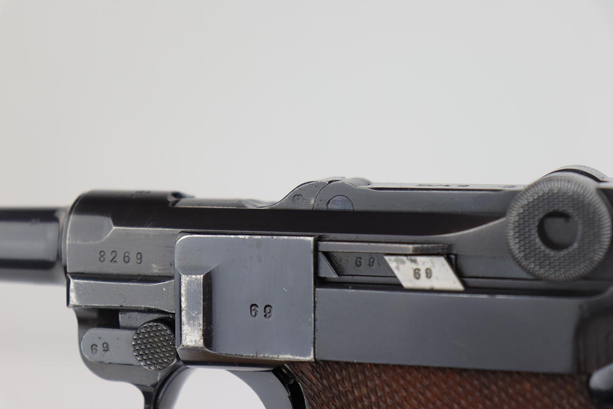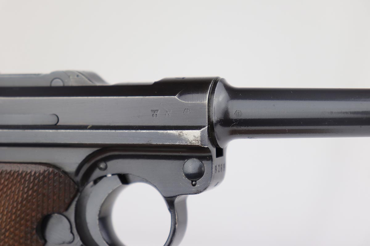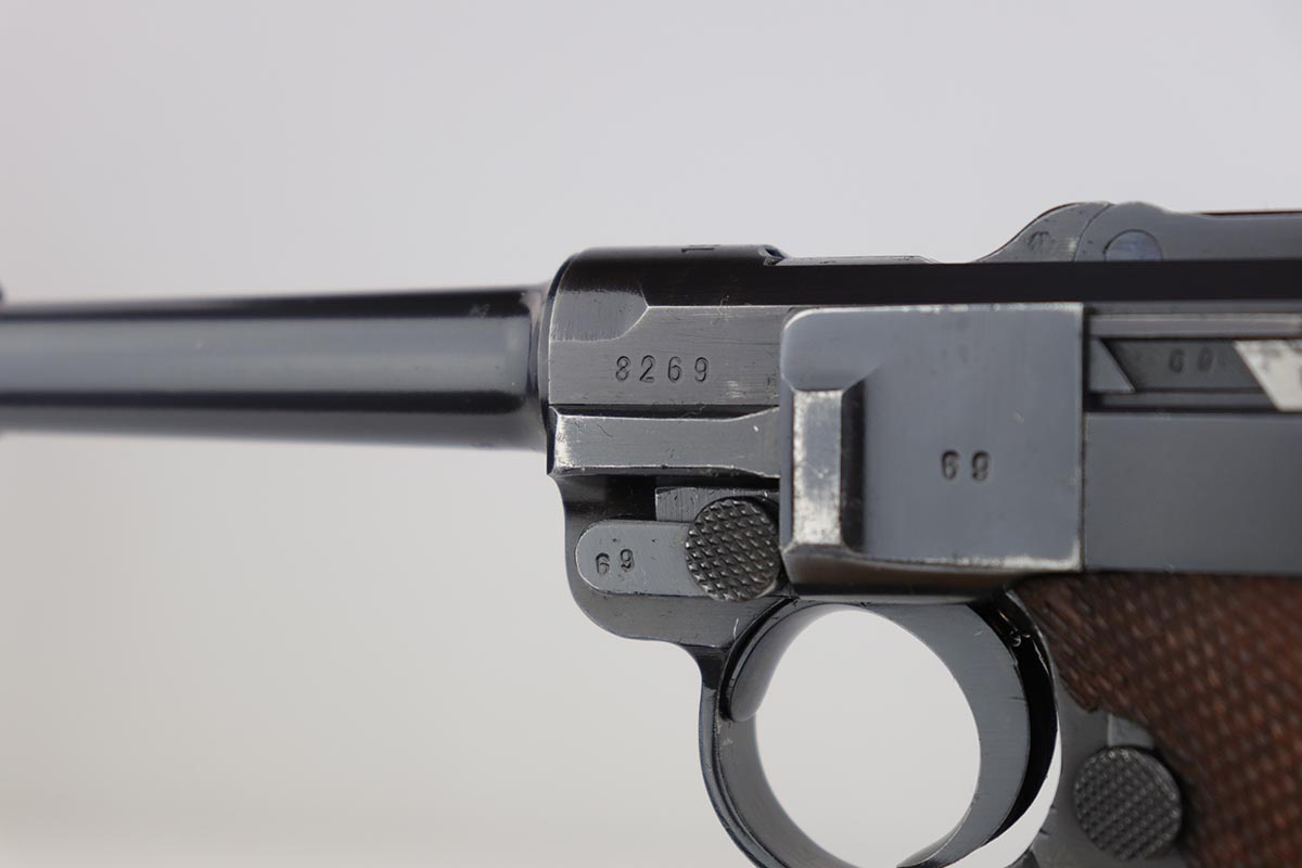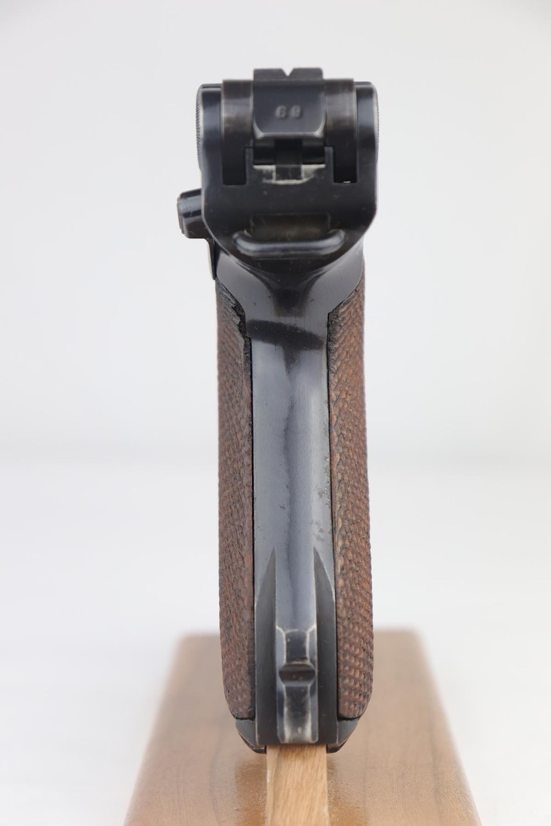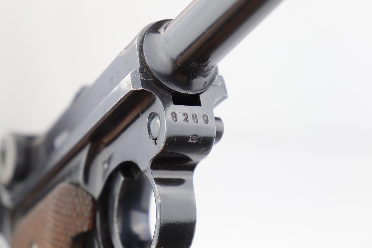4/19/19 – This is an excellent Nazi Mauser Luger from 1937. It is a second variation Luger from that year, with blued small parts. The pistol is all matching and original with about 97% blue remaining, with all the wear visible on high edge areas. Period original but mismatched magazine. Terrific bore. Excellent original grips, which are matching to the pistol. The right panel does have an SS emblem installed, whether by GI captor or previous collector.