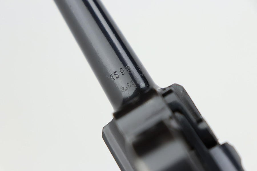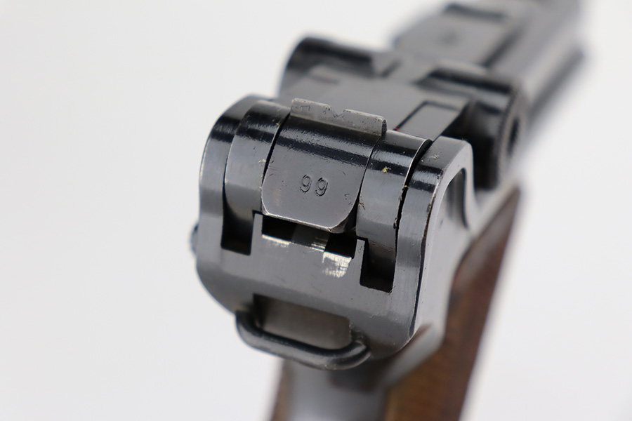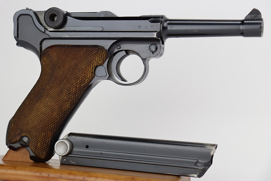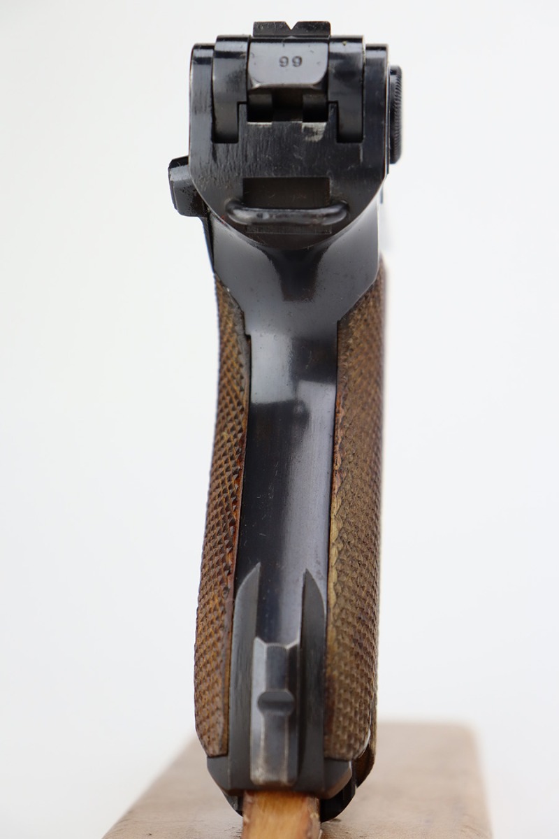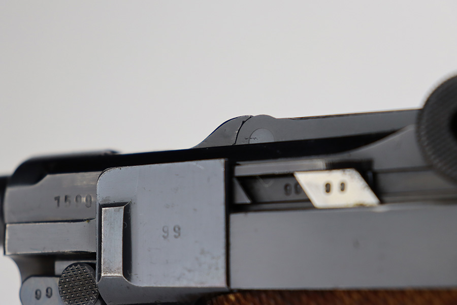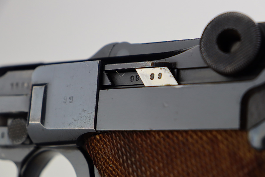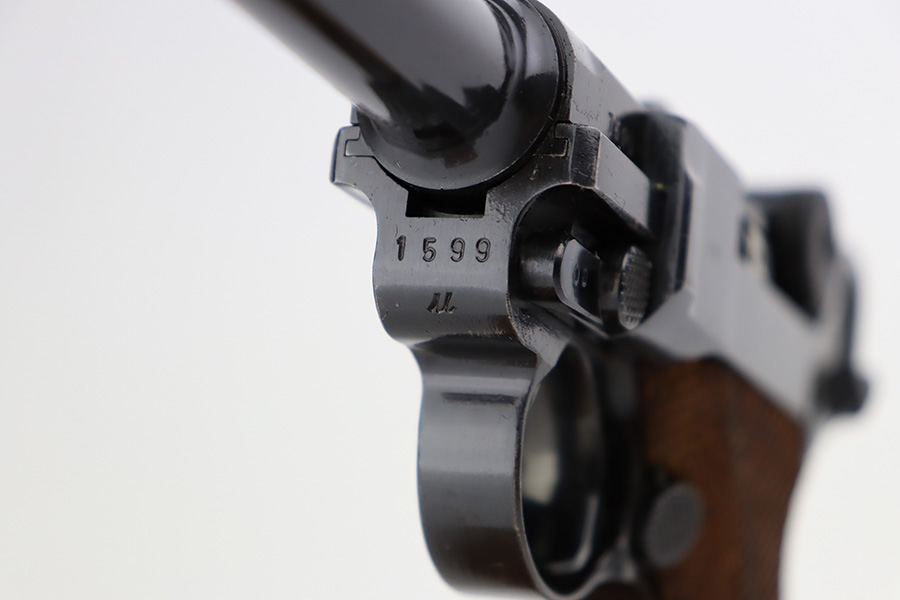 7/28/23 – This is a terrific Mauser Luger from 1937. Second variation example with blued small parts. About 98% of the blue remains, with very minor wear on muzzle and sideplate, and a little more on the right rail and bottom of front strap. Shiny bore with a bit of frost in the grooves. Minty grips with matching serial number to pistol. Period original but mismatched magazine.