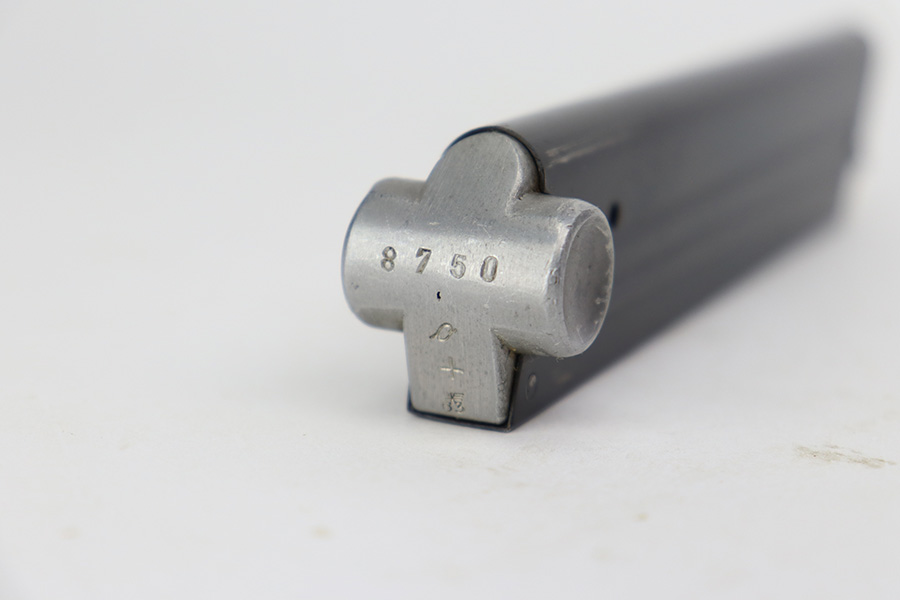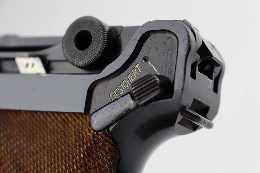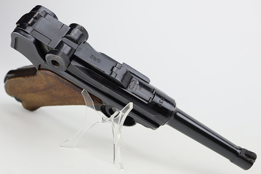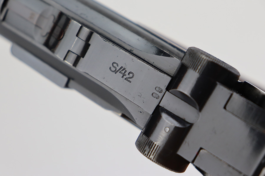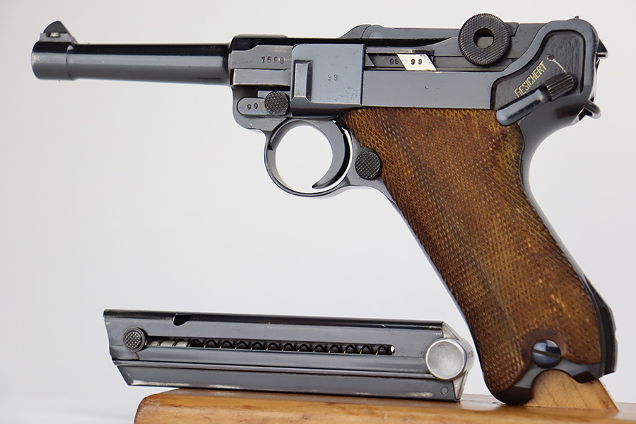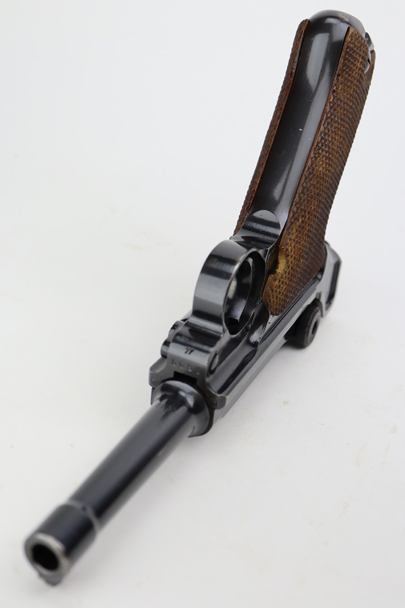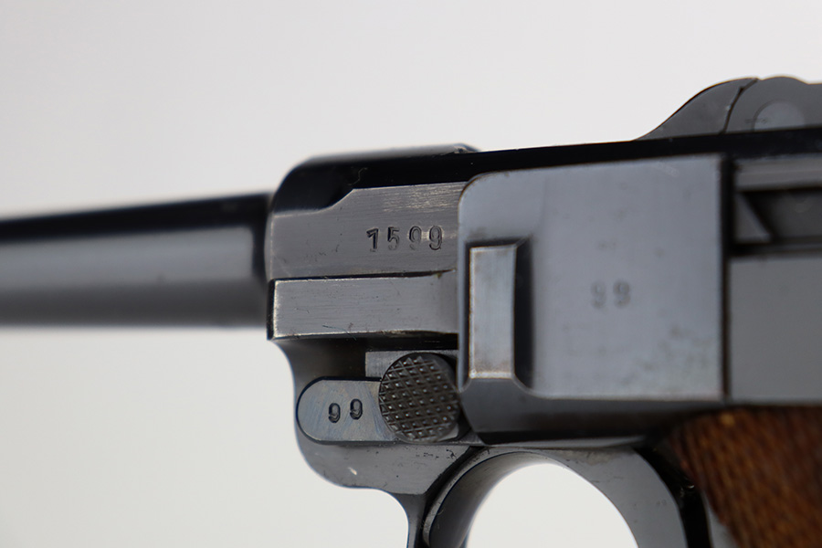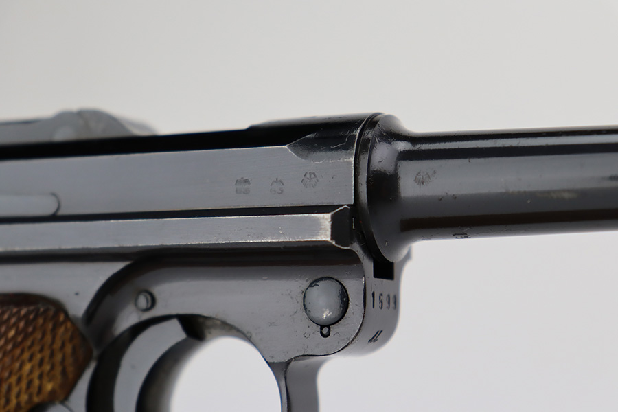 7/28/23 – This is a terrific Mauser Luger from 1937. Second variation example with blued small parts. About 98% of the blue remains, with very minor wear on muzzle and sideplate, and a little more on the right rail and bottom of front strap. Shiny bore with a bit of frost in the grooves. Minty grips with matching serial number to pistol. Period original but mismatched magazine.