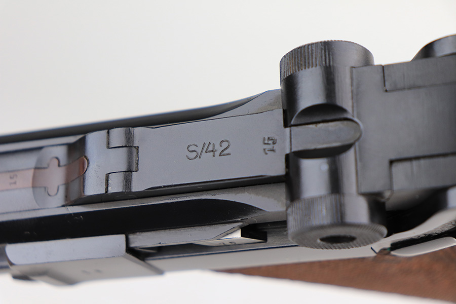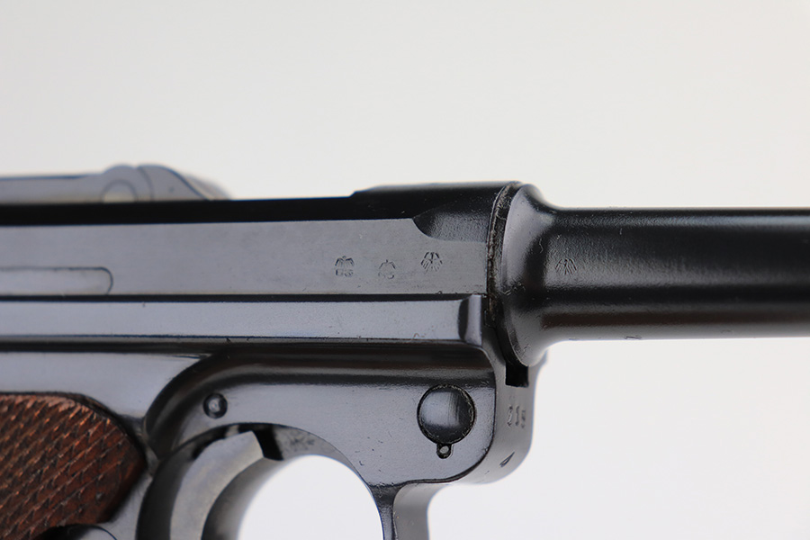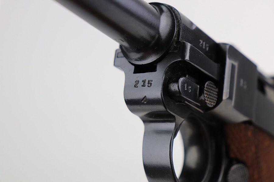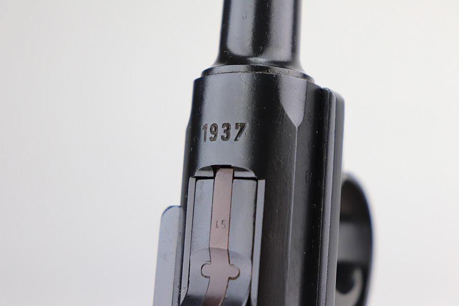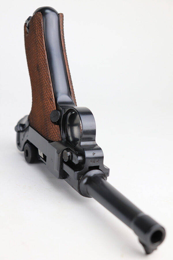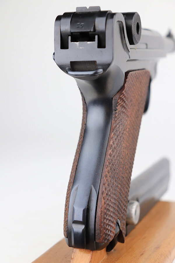 1/31/22 – This is an excellent example of a Mauser Luger issued to the Nazi military in 1937. The gun is all matching and has the proper “Eagle 63” Nazi military acceptance proofs on the right side of the slide. The gun has been professionally restored. As a result, the bluing is beautiful, and there are no obvious signs of wear. Comes with minty replacement wood grips and a period-correct but mismatched magazine. The bore has very good rifling, but there is minor frosting in some of the grooves.