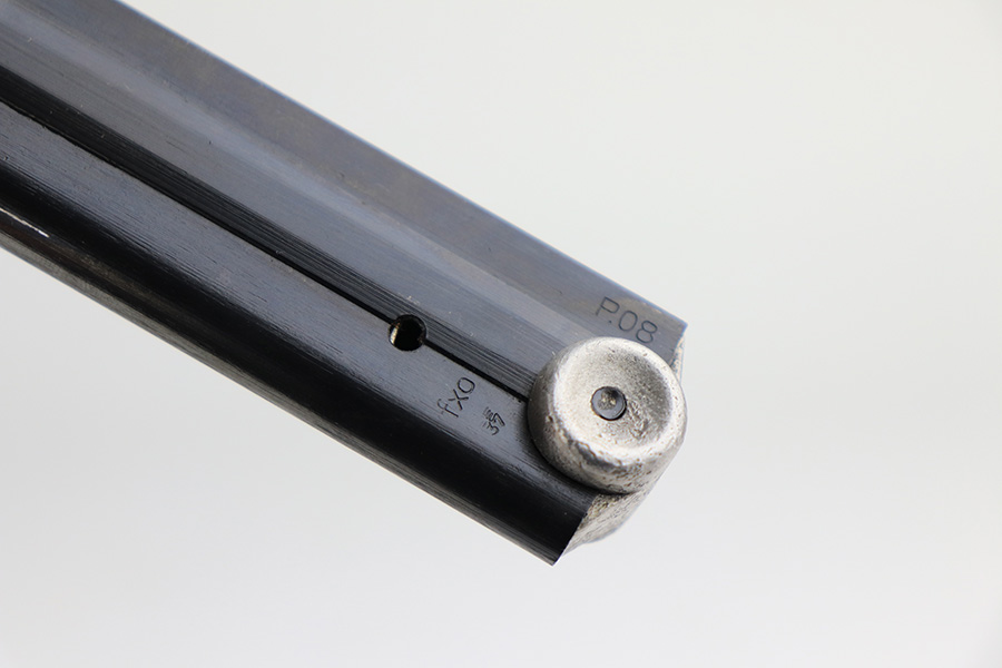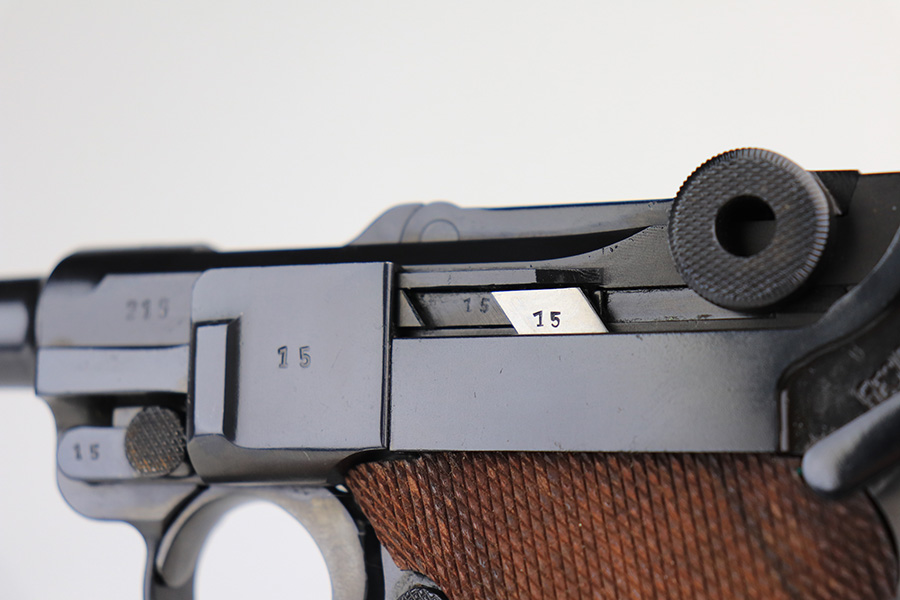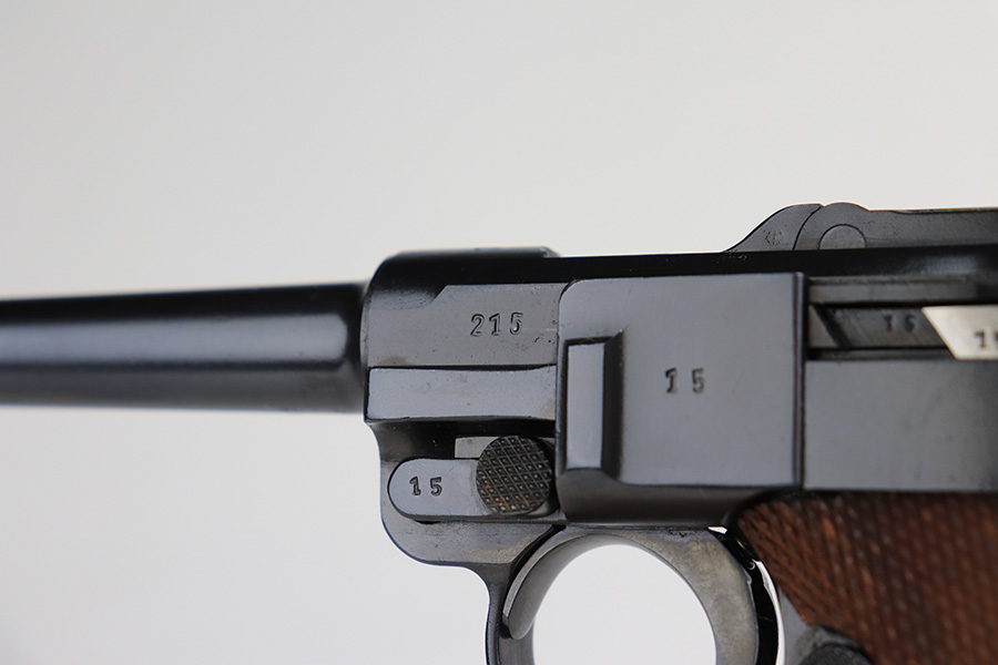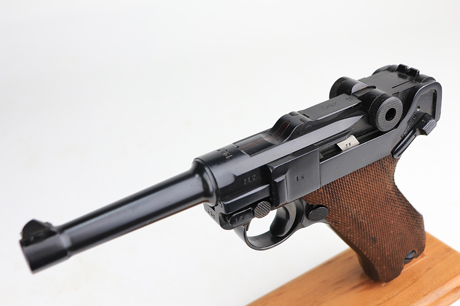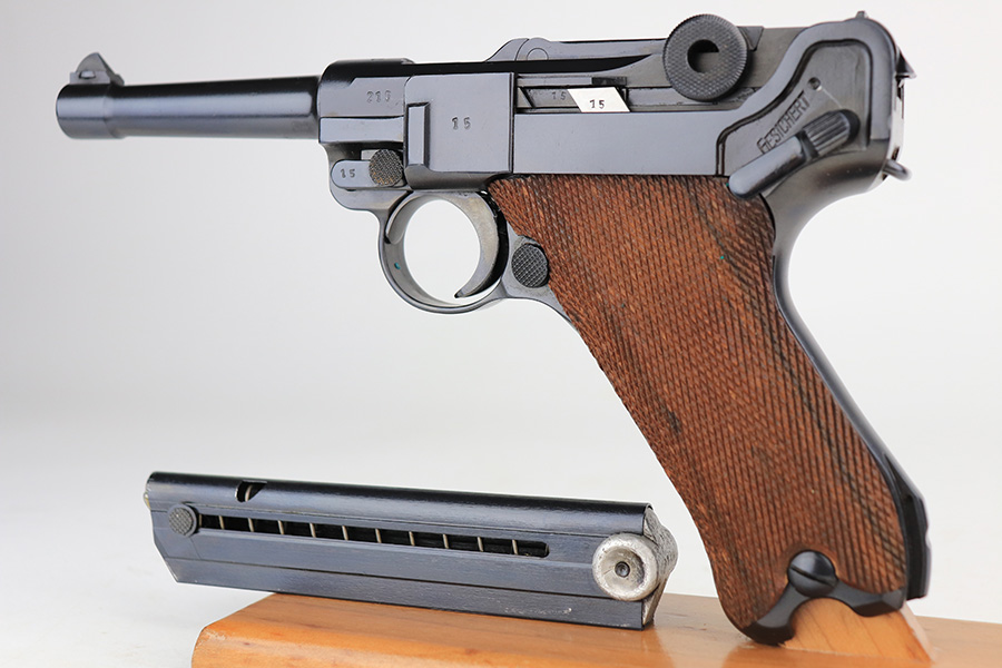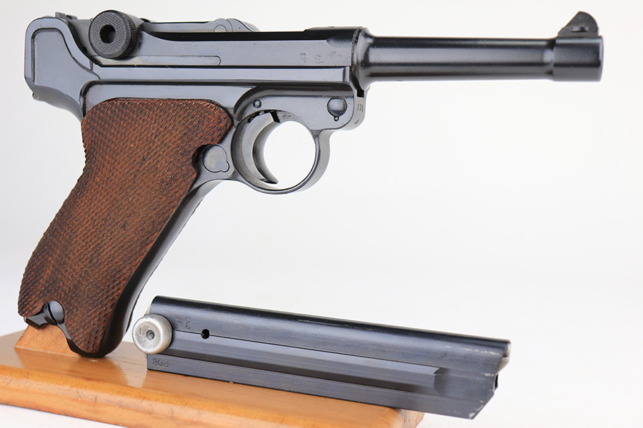 1/31/22 – This is an excellent example of a Mauser Luger issued to the Nazi military in 1937. The gun is all matching and has the proper “Eagle 63” Nazi military acceptance proofs on the right side of the slide. The gun has been professionally restored. As a result, the bluing is beautiful, and there are no obvious signs of wear. Comes with minty replacement wood grips and a period-correct but mismatched magazine. The bore has very good rifling, but there is minor frosting in some of the grooves.