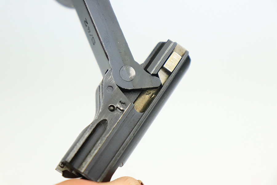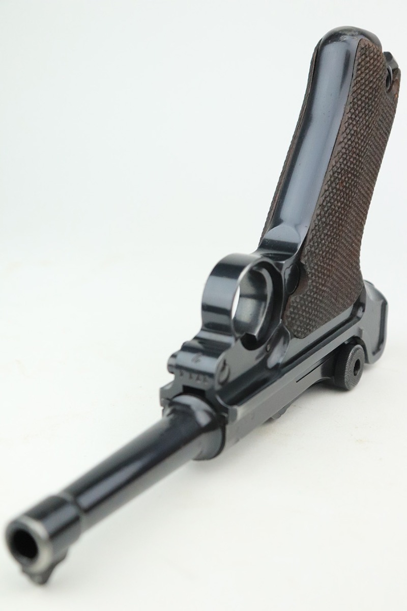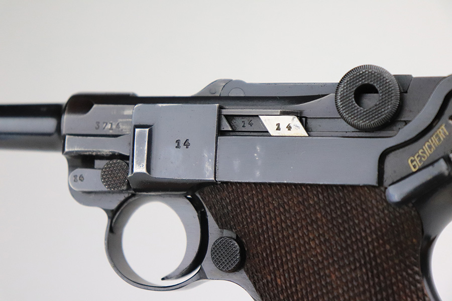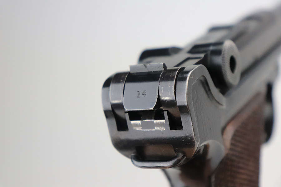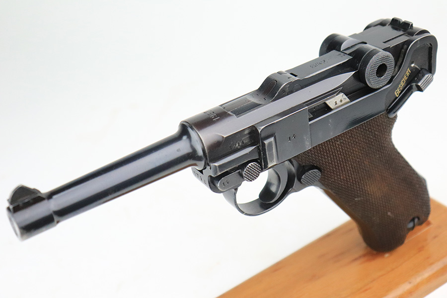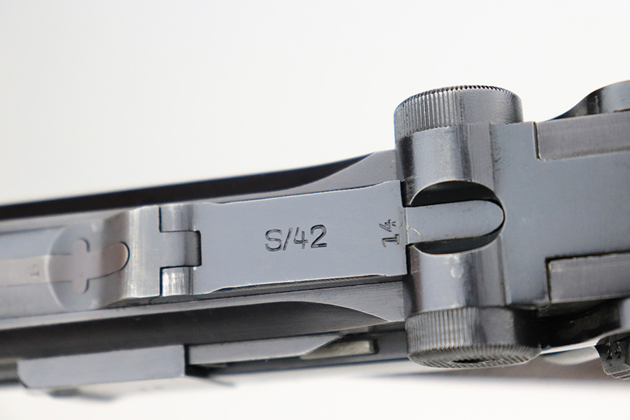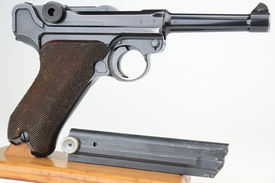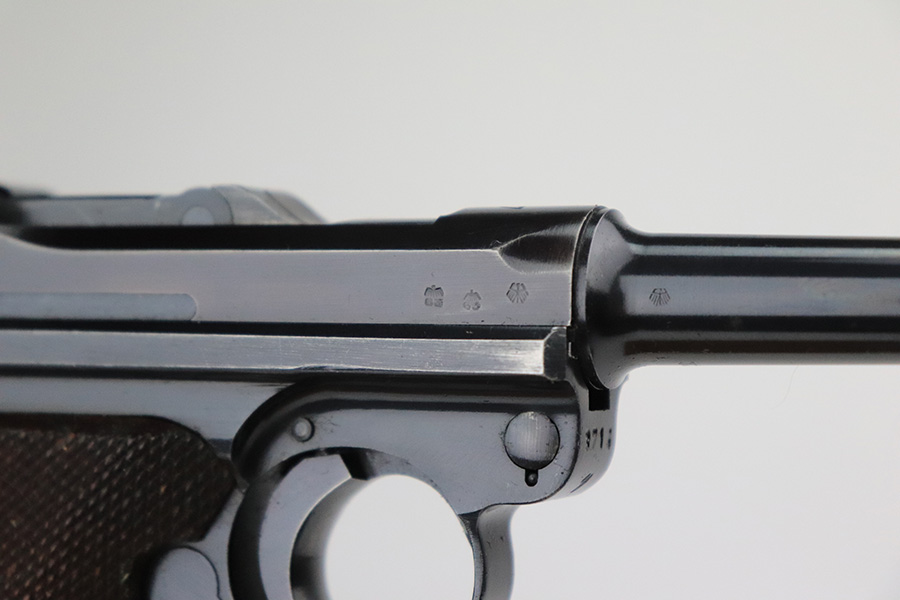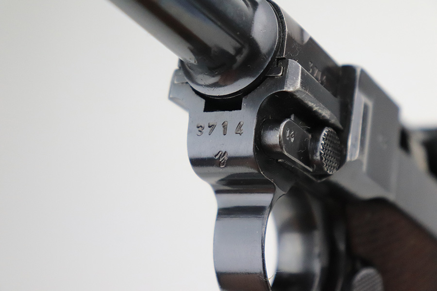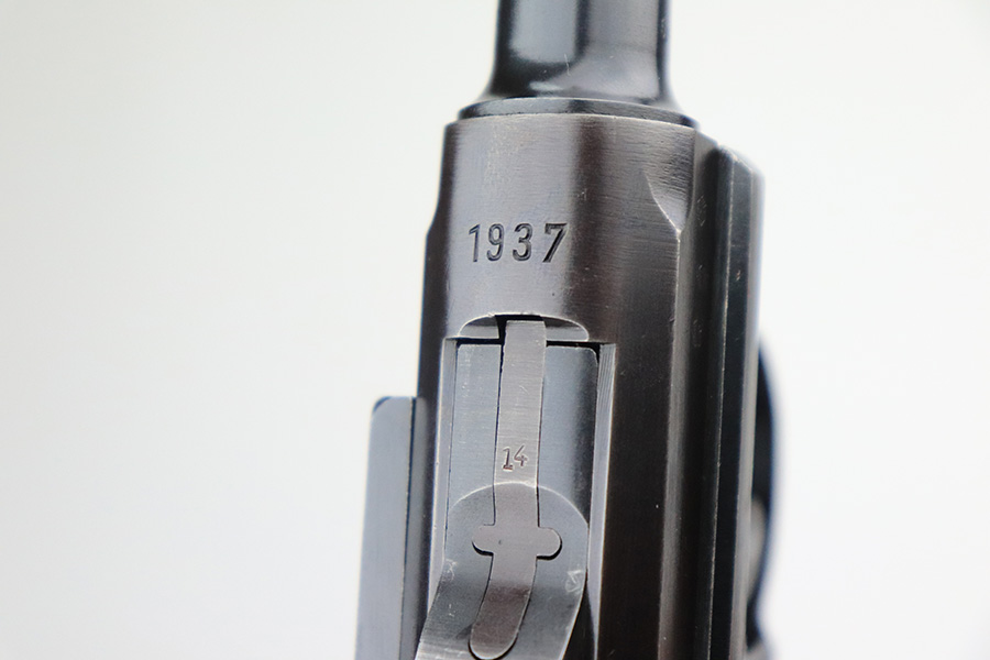 8/16/22 – This is a very nice and honest example of a Mauser Luger that was made in 1937 and accepted into the German military. All matching numbers throughout, including the grips. The magazine is WW2 original but a police numbered base that is mismatched. This Luger has about 95% of its original blue left, appearing to have been stored in a holster at some point. The wear is in the most common areas you’d see from a holster, such as the muzzle, sideplate, rails and bottom of the front strap. The bore is minty, hardly looks used. Excellent grips with sharp checkering and no defects.