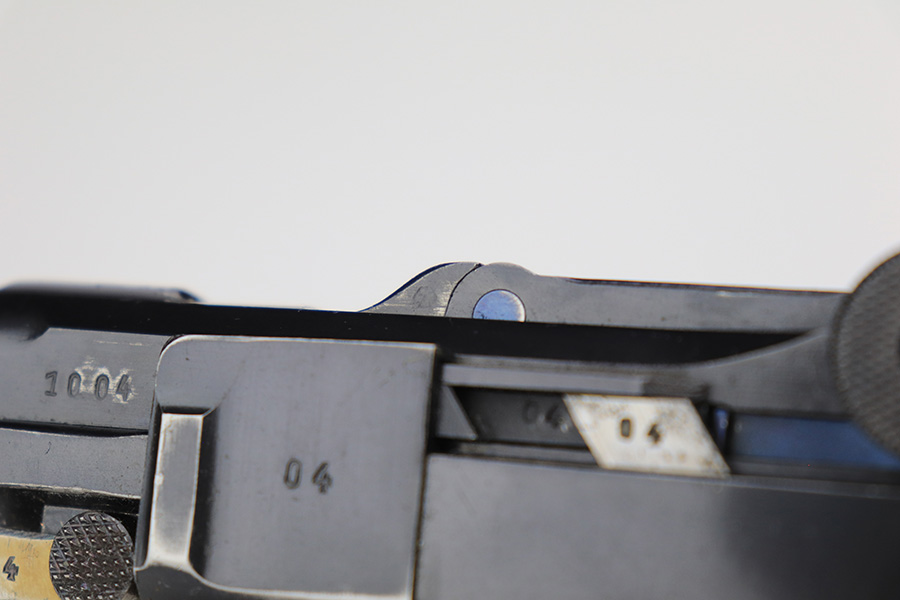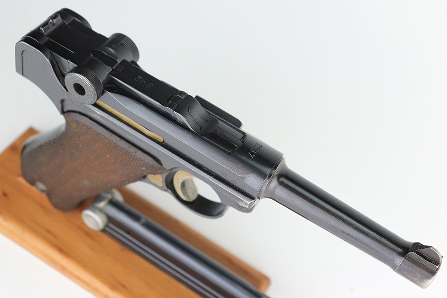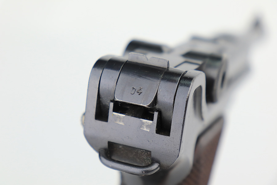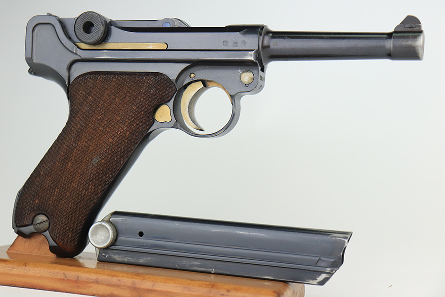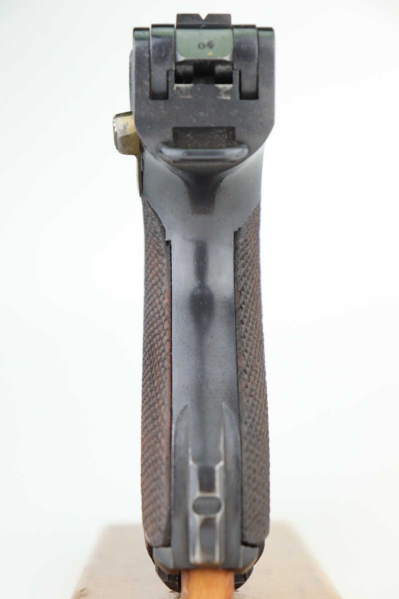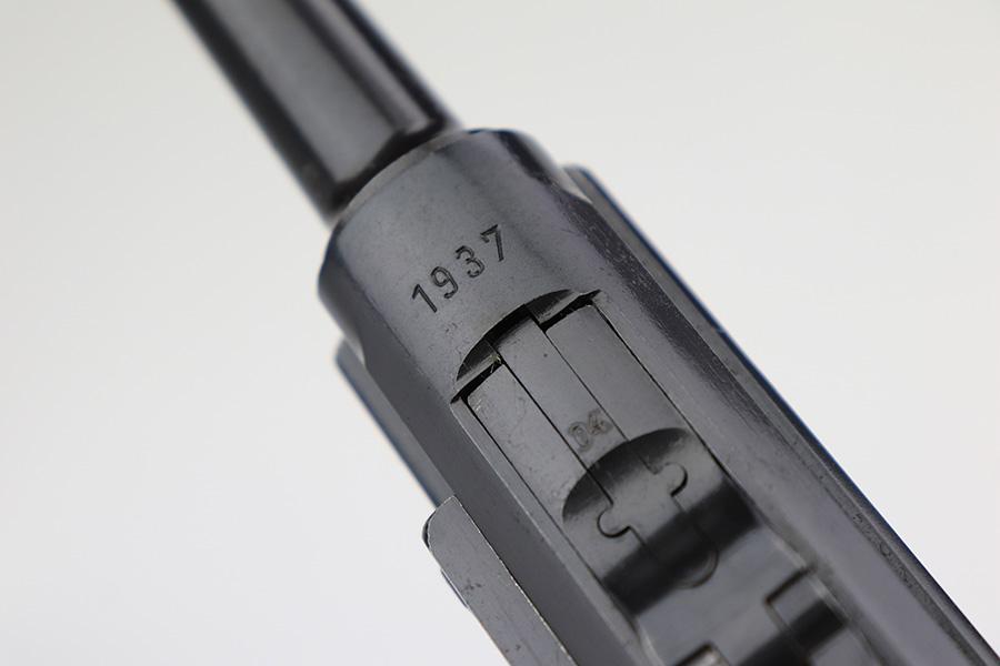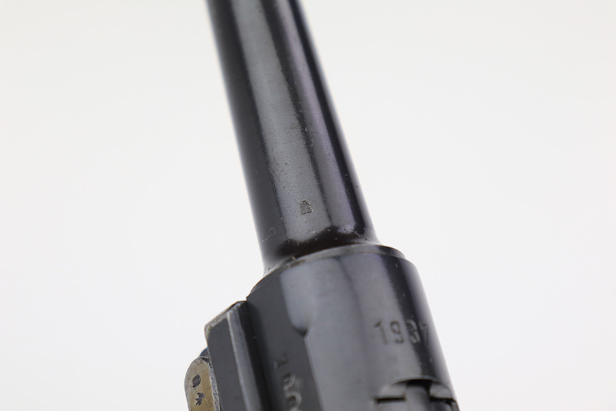 3/10/23 – This is an excellent example of a Mauser Luger issued to the Nazi military in 1937. It is all matching and has the proper military proofs. It has retained about 96-97% of its original finish. There is wear around the muzzle, on the side plate, and on the very front edges of the side rails. Very minor freckling on both grip straps. Minty un-numbered wood grips. Comes with a mismatched but period-correct magazine. Very nice bore with great rifling.