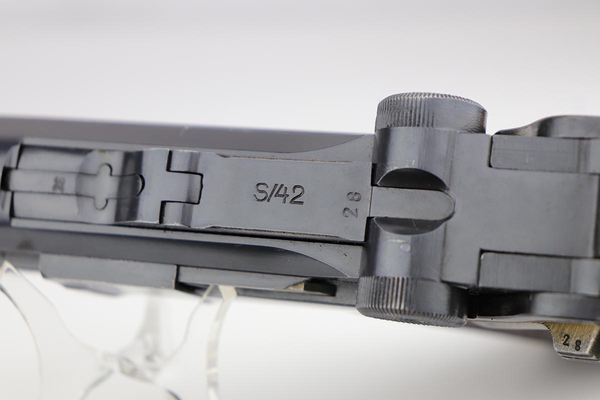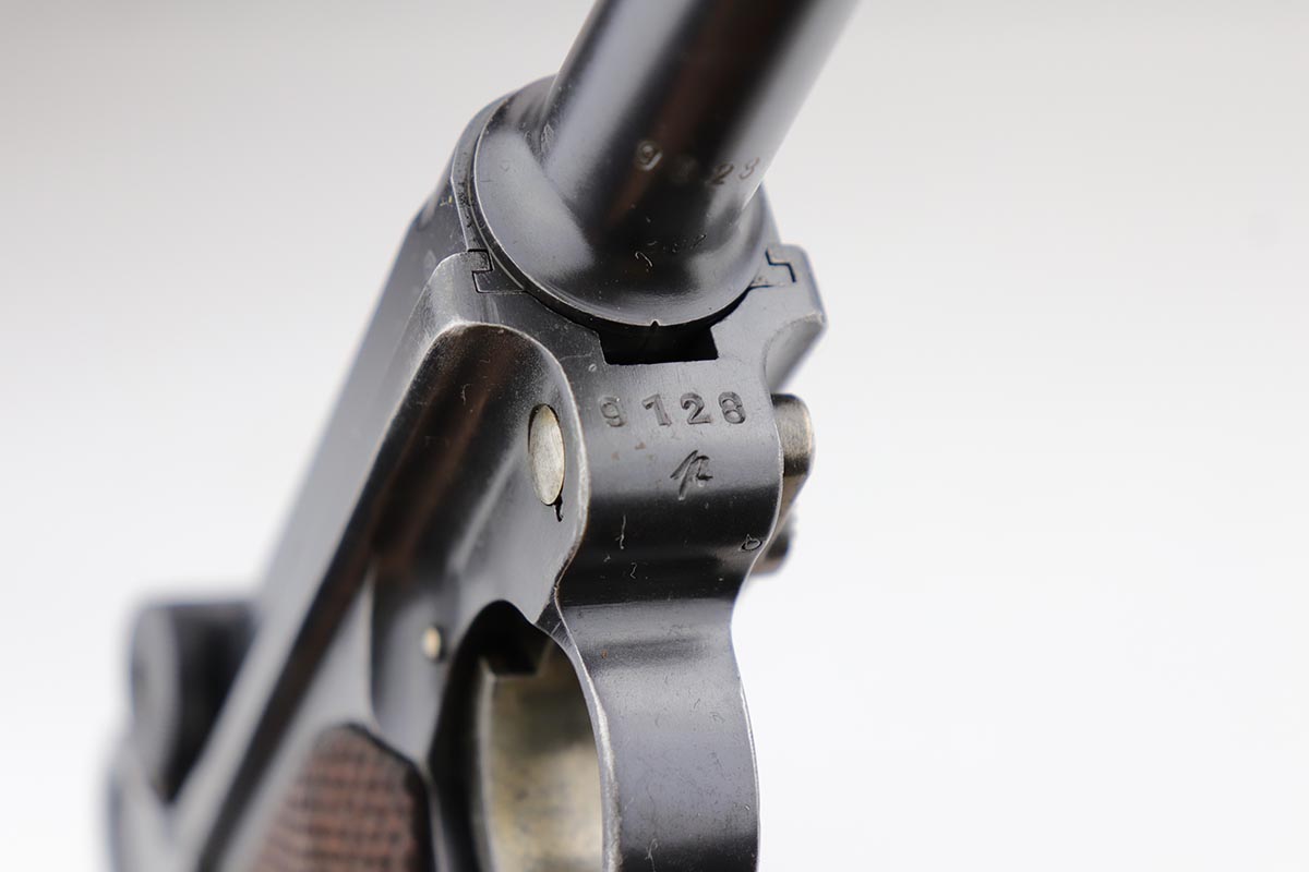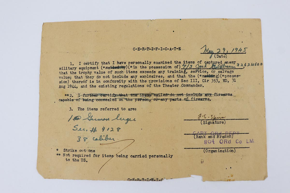 8/26/19 – This is an excellent, first variation Mauser Luger from 1937, and includes the original capture certificate. The pistol is all matching and original with about 96-97% blue remaining. There’s minor high edge wear on the muzzle and sideplate, and some patination of the straps. Small parts still retain about 75% original straw. Excellent grips, which are unmarked. Terrific bore. Magazine is period original but mismatched. The document mentions the pistol by serial and states that it was brought back in May of 1945.