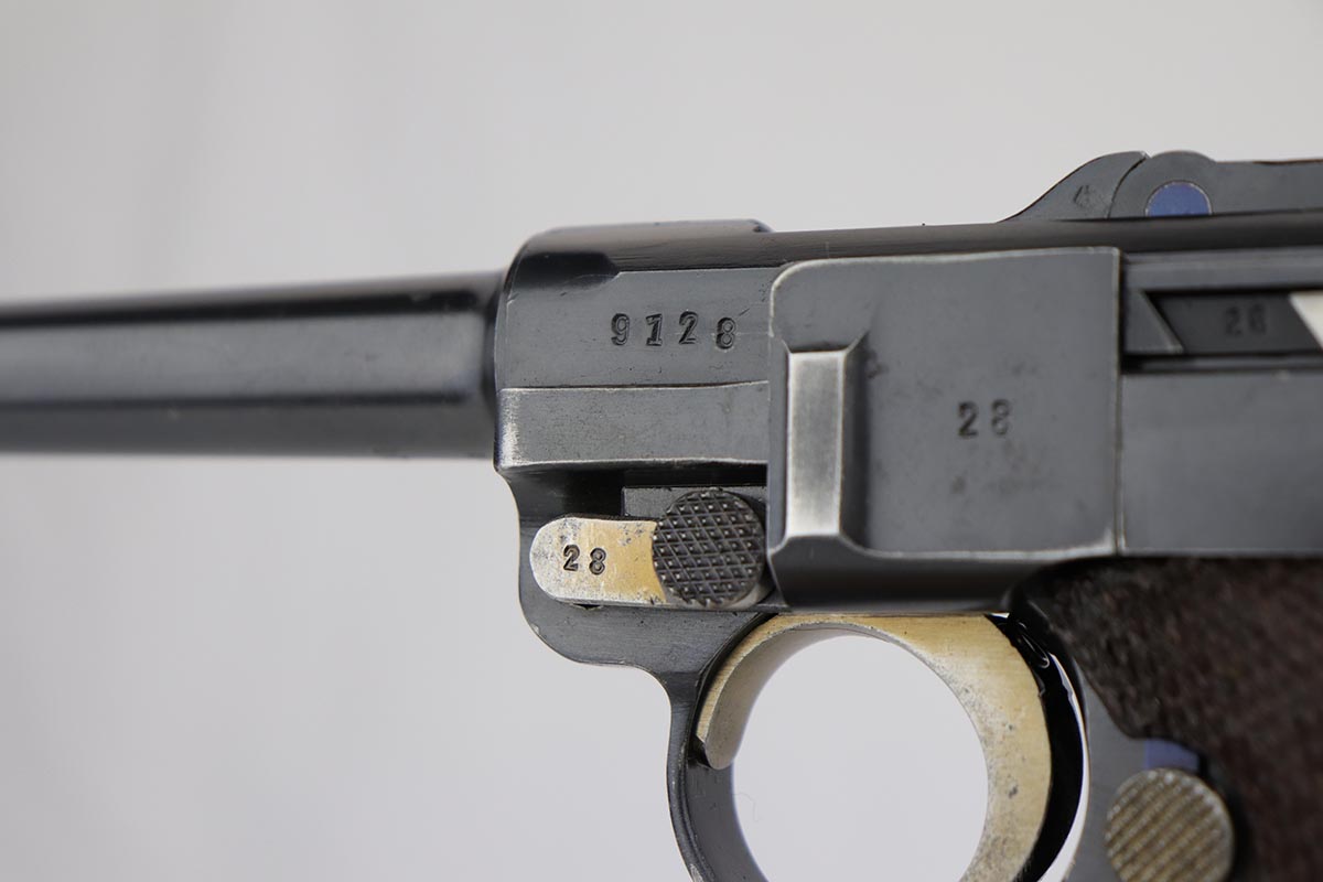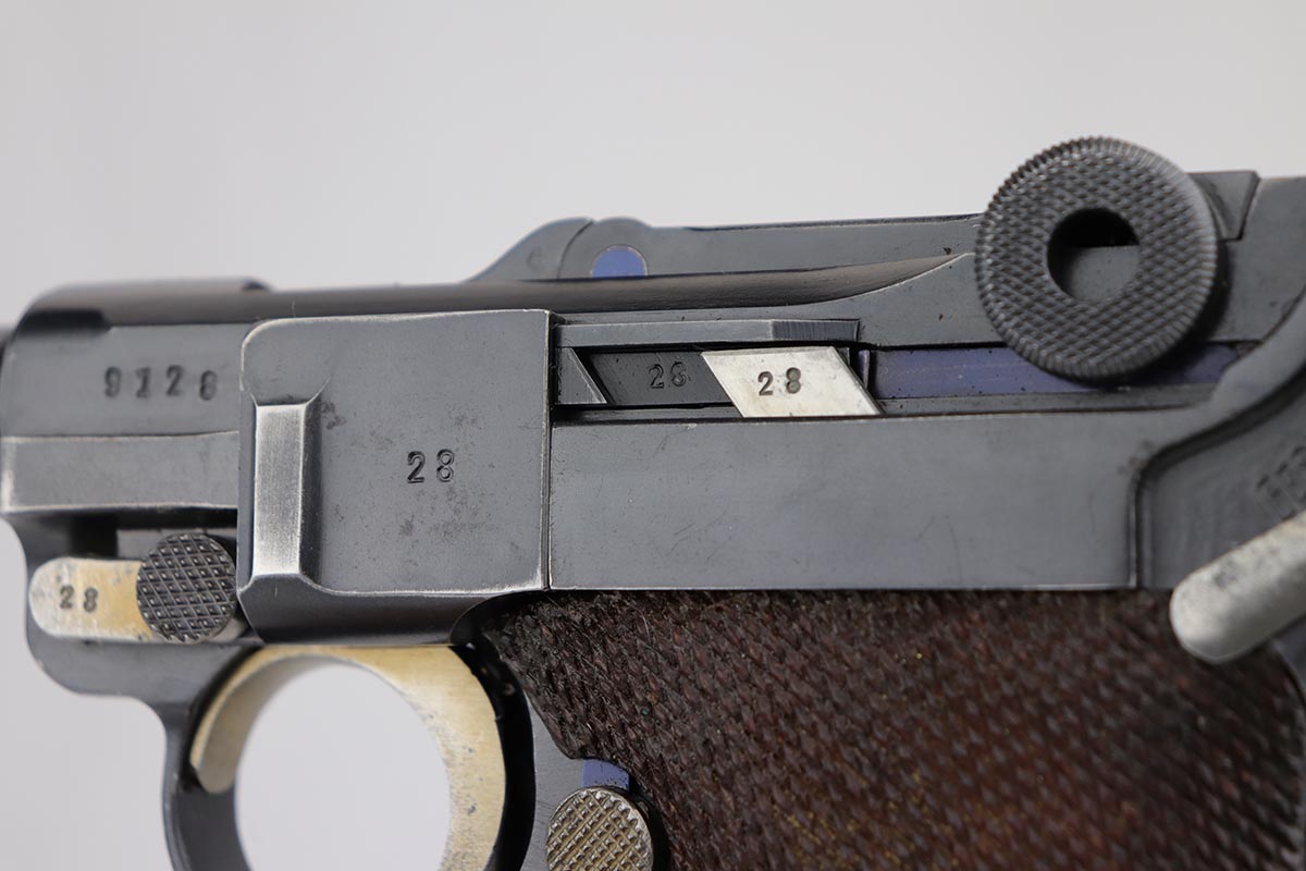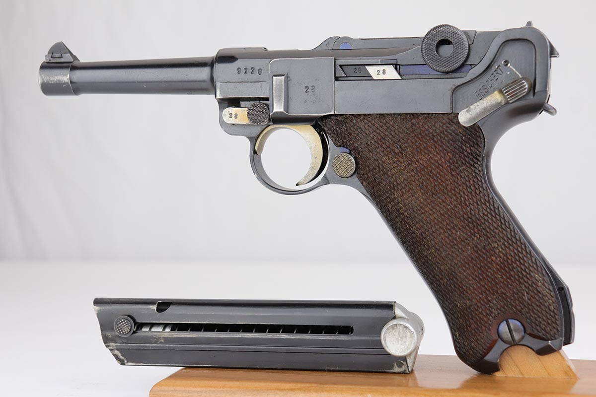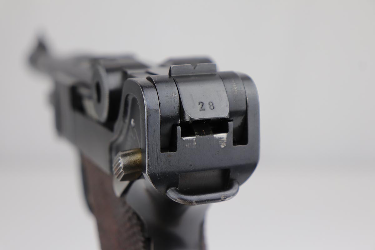 8/26/19 – This is an excellent, first variation Mauser Luger from 1937, and includes the original capture certificate. The pistol is all matching and original with about 96-97% blue remaining. There’s minor high edge wear on the muzzle and sideplate, and some patination of the straps. Small parts still retain about 75% original straw. Excellent grips, which are unmarked. Terrific bore. Magazine is period original but mismatched. The document mentions the pistol by serial and states that it was brought back in May of 1945.