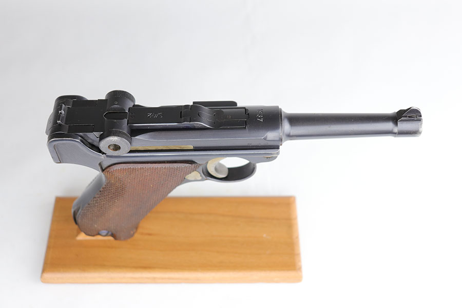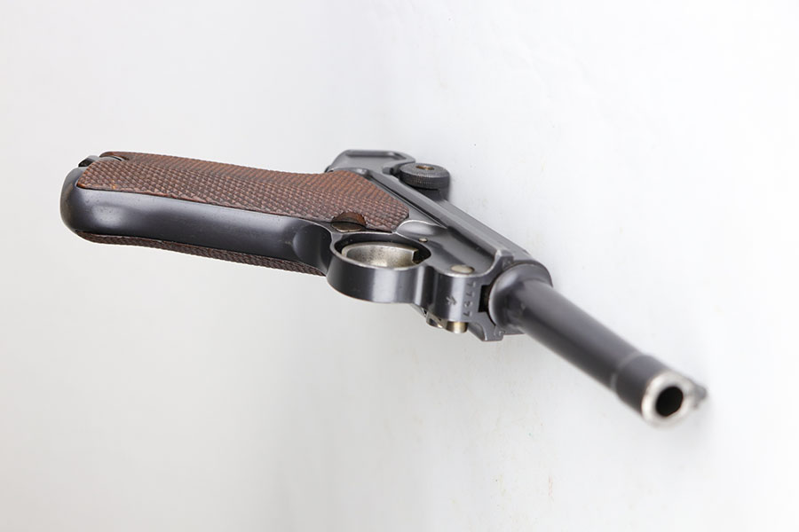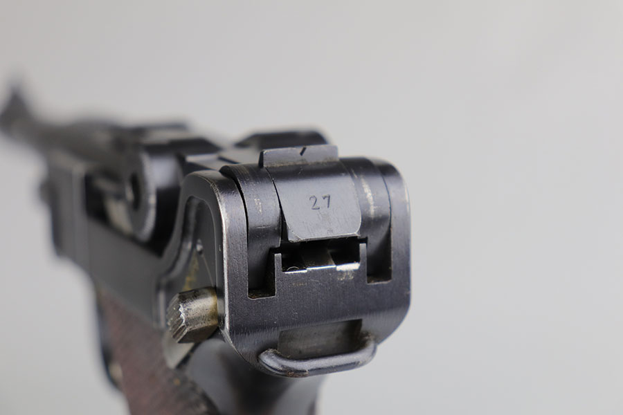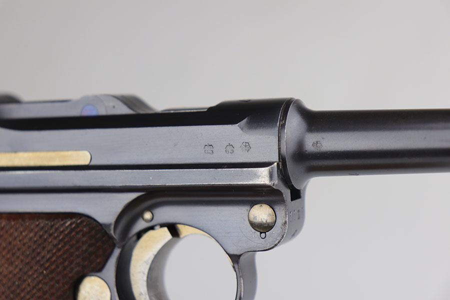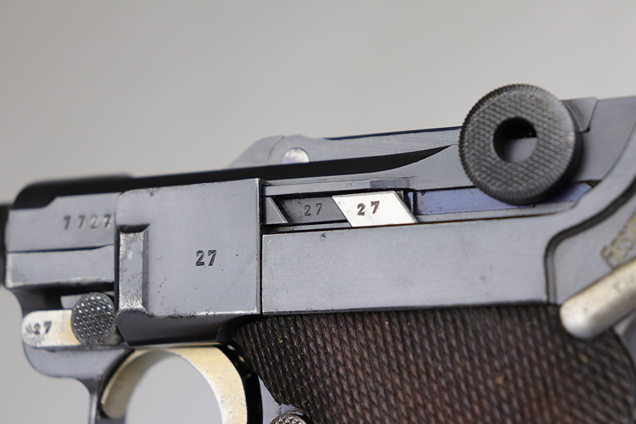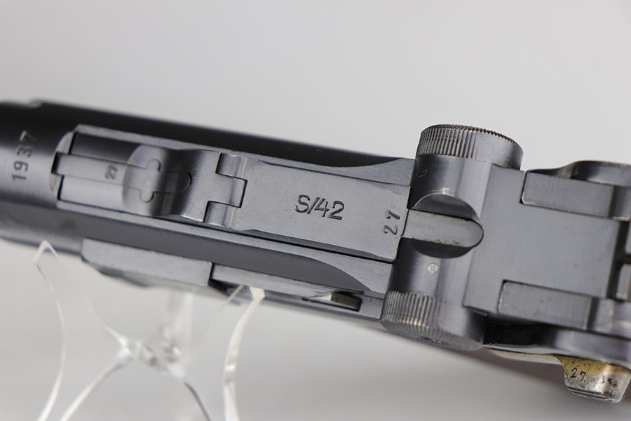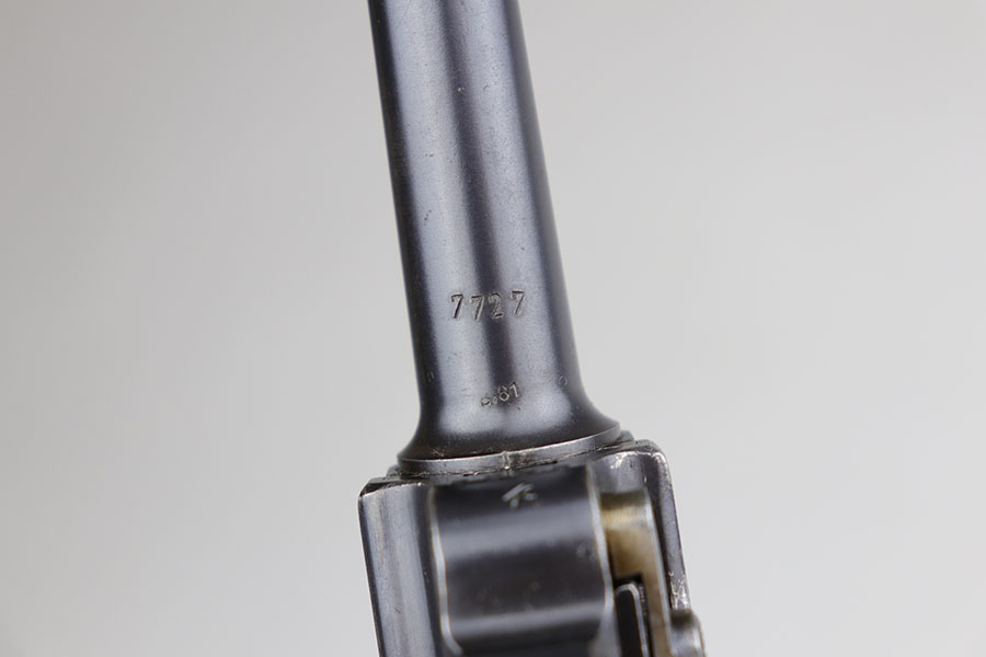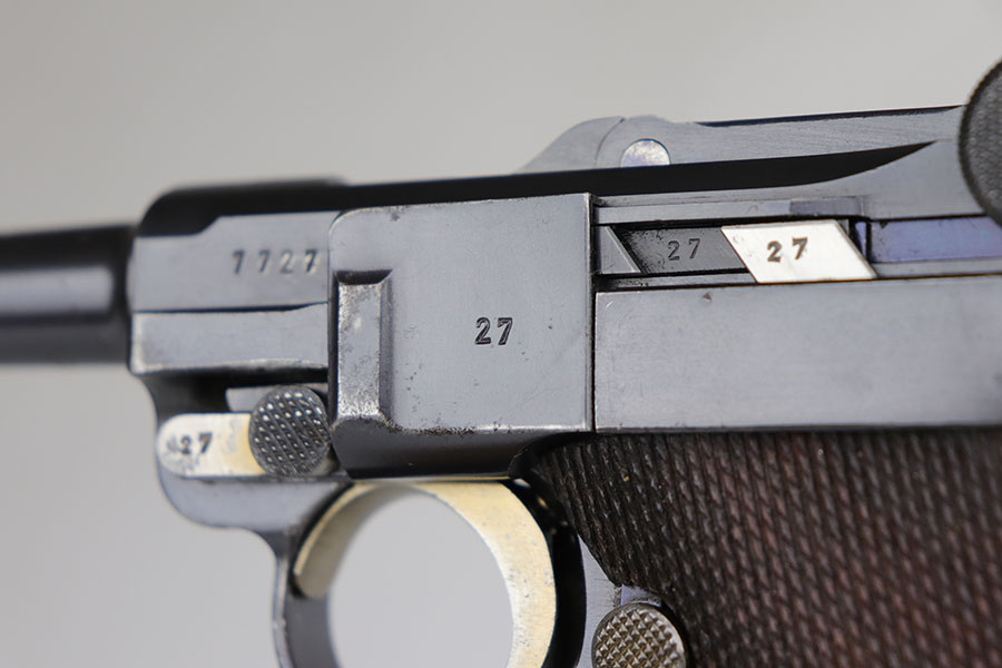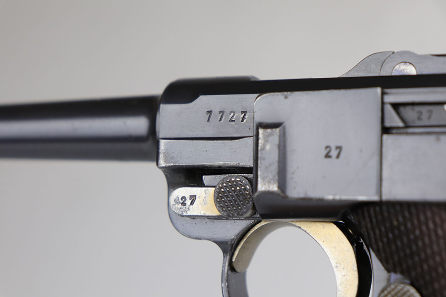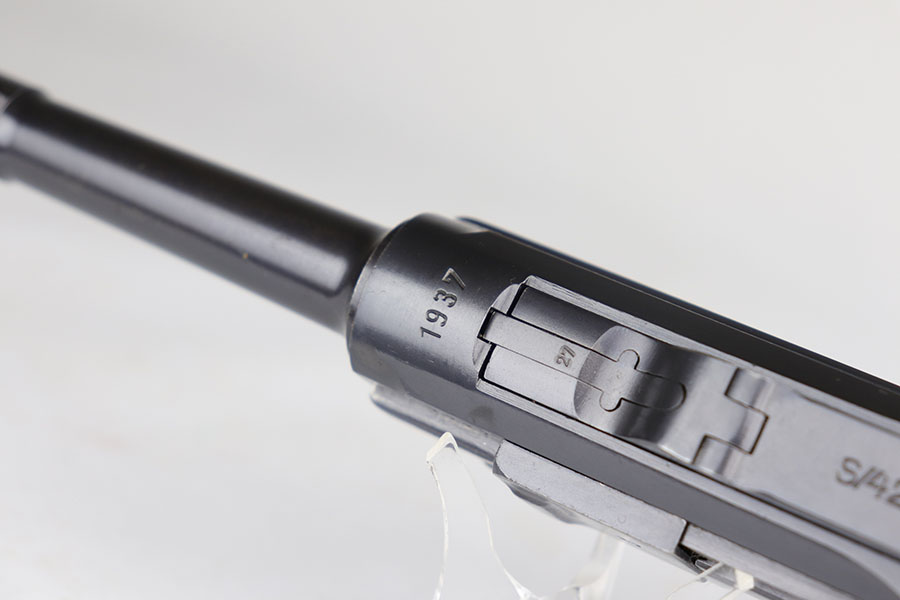 7/13/20 – This is an excellent 1937 Mauser Luger with original, matching magazine. It’s a first variation example with strawed small parts. There were only about 37,000 first variation pistols produced, as compared to about 89,000 second variation pistols with blued small parts. This one has 95+% of the original blue, with standard muzzle and sideplate wear, as well as an area of finish loss on the bottom of the front strap. The small parts retain about 90% of the original straw. There is some surface freckling on the sideplate and muzzle. Excellent bore. Grips are unmarked but fit perfectly and in excellent condition.