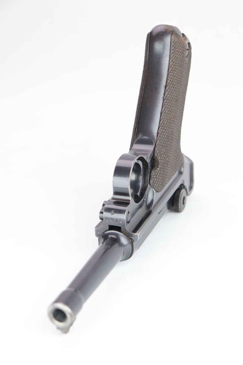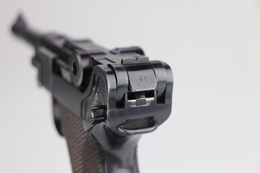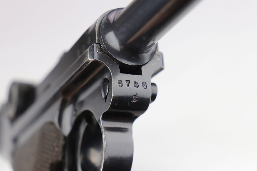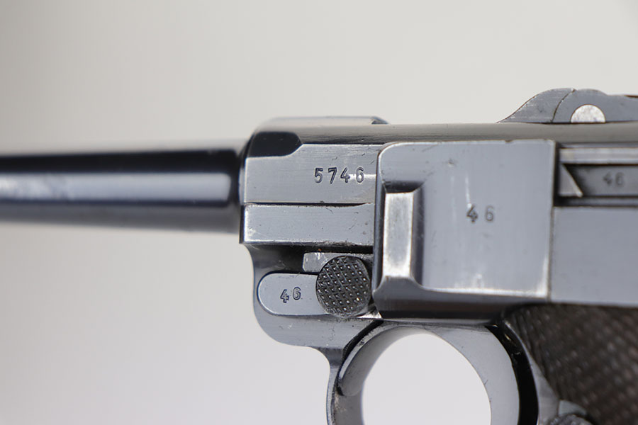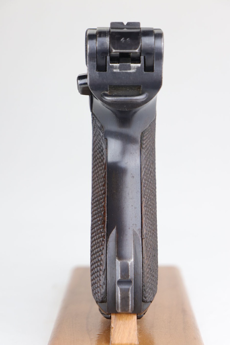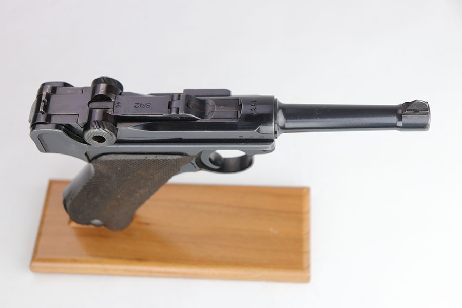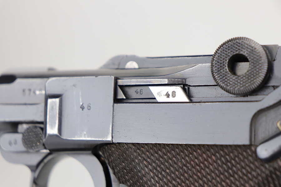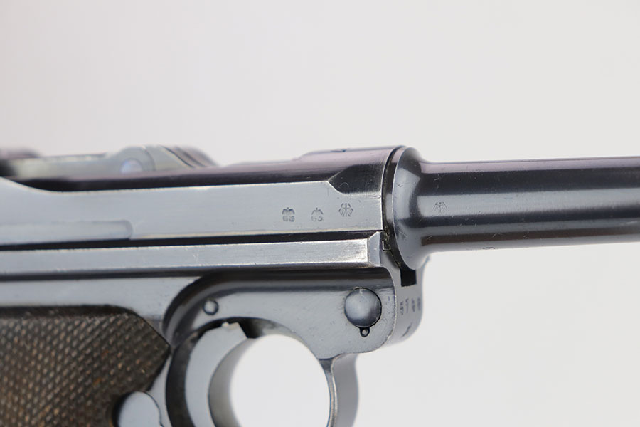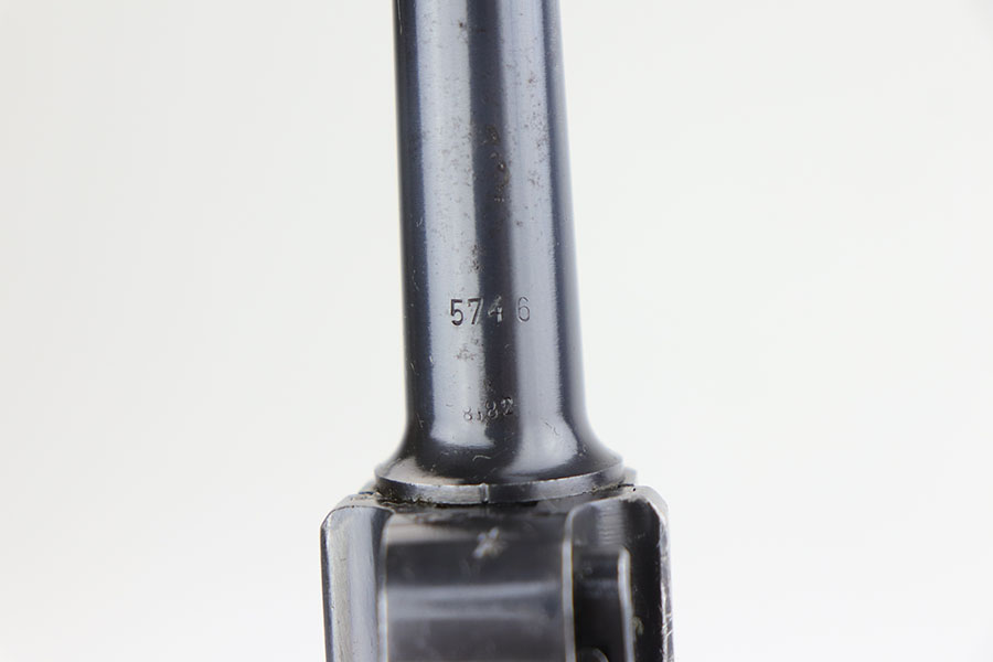 3/13/20 – This is a complete and all matching Nazi Mauser Luger rig from 1937, including both magazines and the grips. The pistol has 95% of the original blue with standard holster wear on the high points, mostly on the left side of the muzzle and barrel. Both magazines are factory numbered and matching to the pistol. This is an S/42 marked variation, which is significantly less common than the ’42’ code examples. Rig comes with a 1938 dated holster that shows some age and use but no major defects. Tool is stick E/63 proofed. Note that the tool in the images had a damaged tip so we swapped it for an original in better condition.