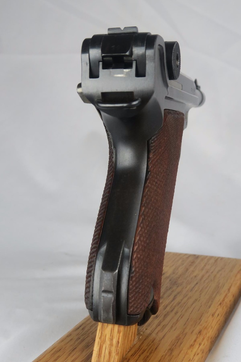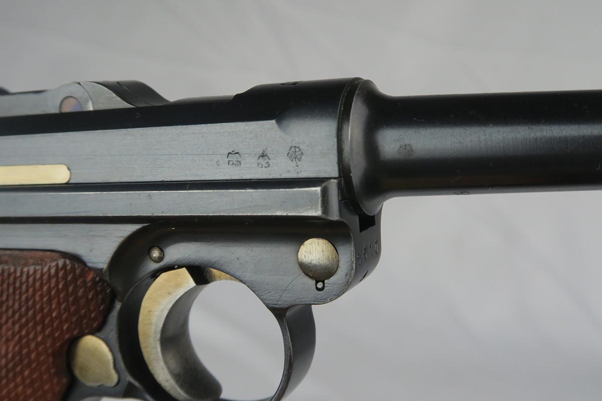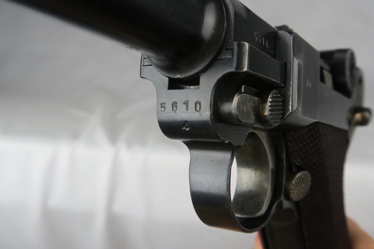 10/10/17 – This is the early variation 1937 Mauser luger with dust blue and straw small parts. The condition is beautiful with the original finish rating near 98%! All parts are matching excluding the magazine. Magazine is period correct with Eagle/63 proof. Matching parts include the levers, hold open, firing pin, frame, barrel, toggle and receiver. The left grip is matching, but the right grip is only marked S/42 – I believe this would imply an armorers field replacement grip. The beautiful finish is only tempered by minor finish loss on the barrel and sideplate. Mirror bore.