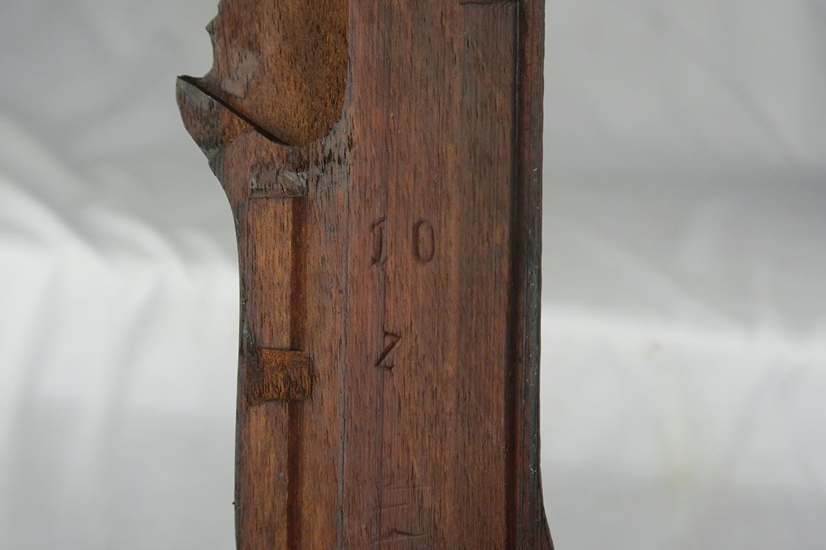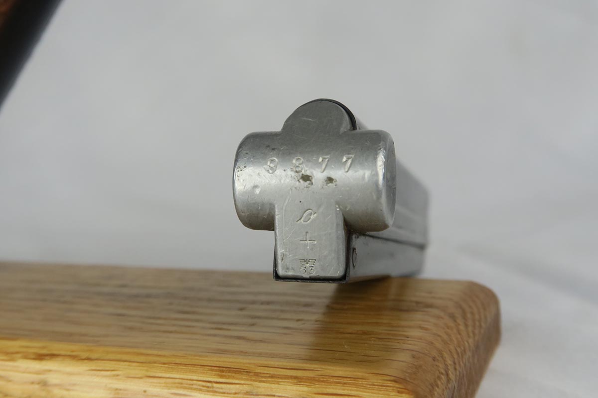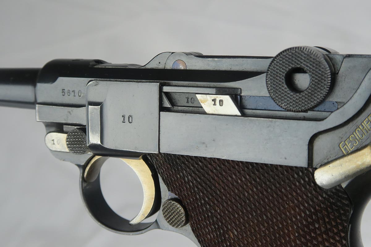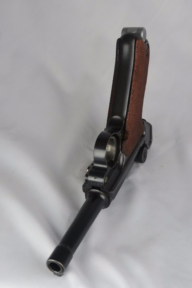 10/10/17 – This is the early variation 1937 Mauser luger with dust blue and straw small parts. The condition is beautiful with the original finish rating near 98%! All parts are matching excluding the magazine. Magazine is period correct with Eagle/63 proof. Matching parts include the levers, hold open, firing pin, frame, barrel, toggle and receiver. The left grip is matching, but the right grip is only marked S/42 – I believe this would imply an armorers field replacement grip. The beautiful finish is only tempered by minor finish loss on the barrel and sideplate. Mirror bore.