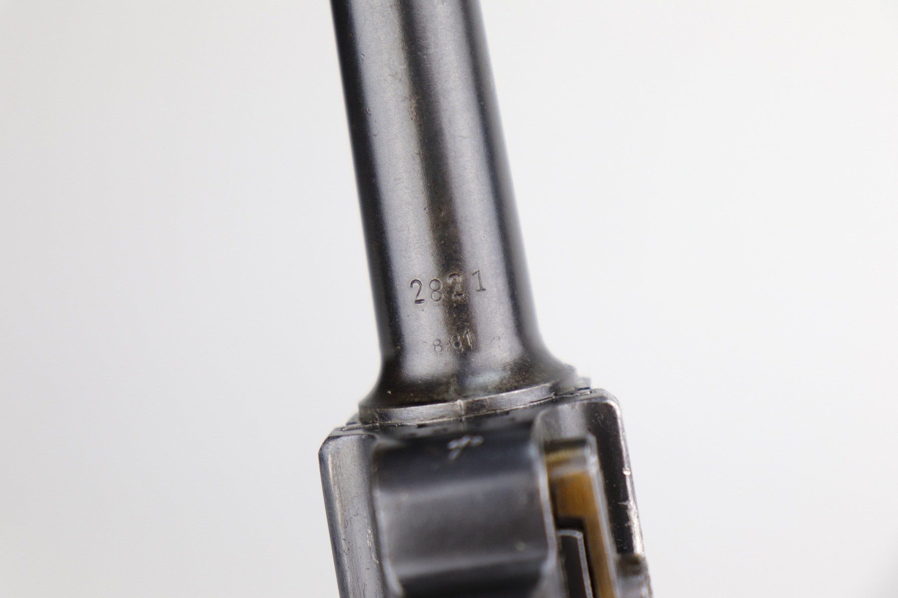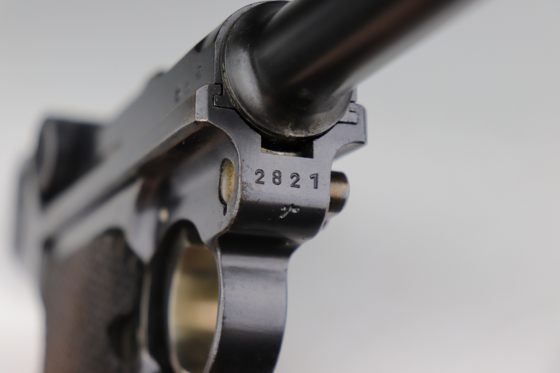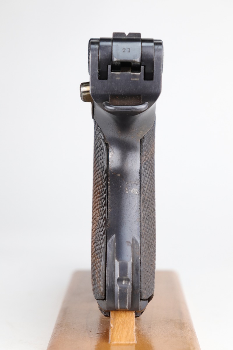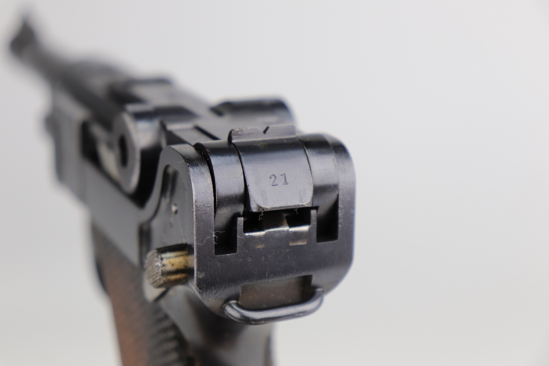 11/20/20 – This is an excellent example of a Mauser Luger issued to the Nazi military in 1937. It is all matching and has the proper “Eagle 63” Nazi military acceptance proofs. Fully functional. It has retained about 96-97% of its original bluing. There is minor wear around the muzzle, on the side plate, and the high edges of the frame. There is some splotchy discoloration on the back strap. There are areas of minor spotty oxidation/light pitting here and there but most visible on the left side of the gun and on the straps. It comes with original matching grips and one matching magazine. The bore is excellent – shiny with strong rifling.