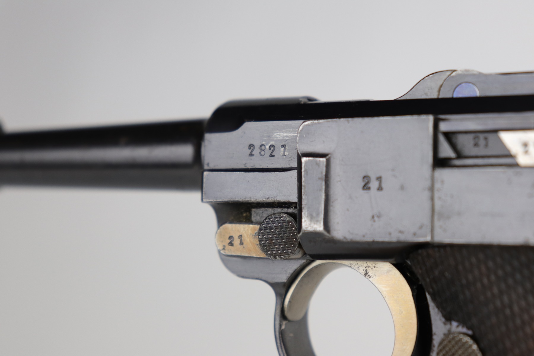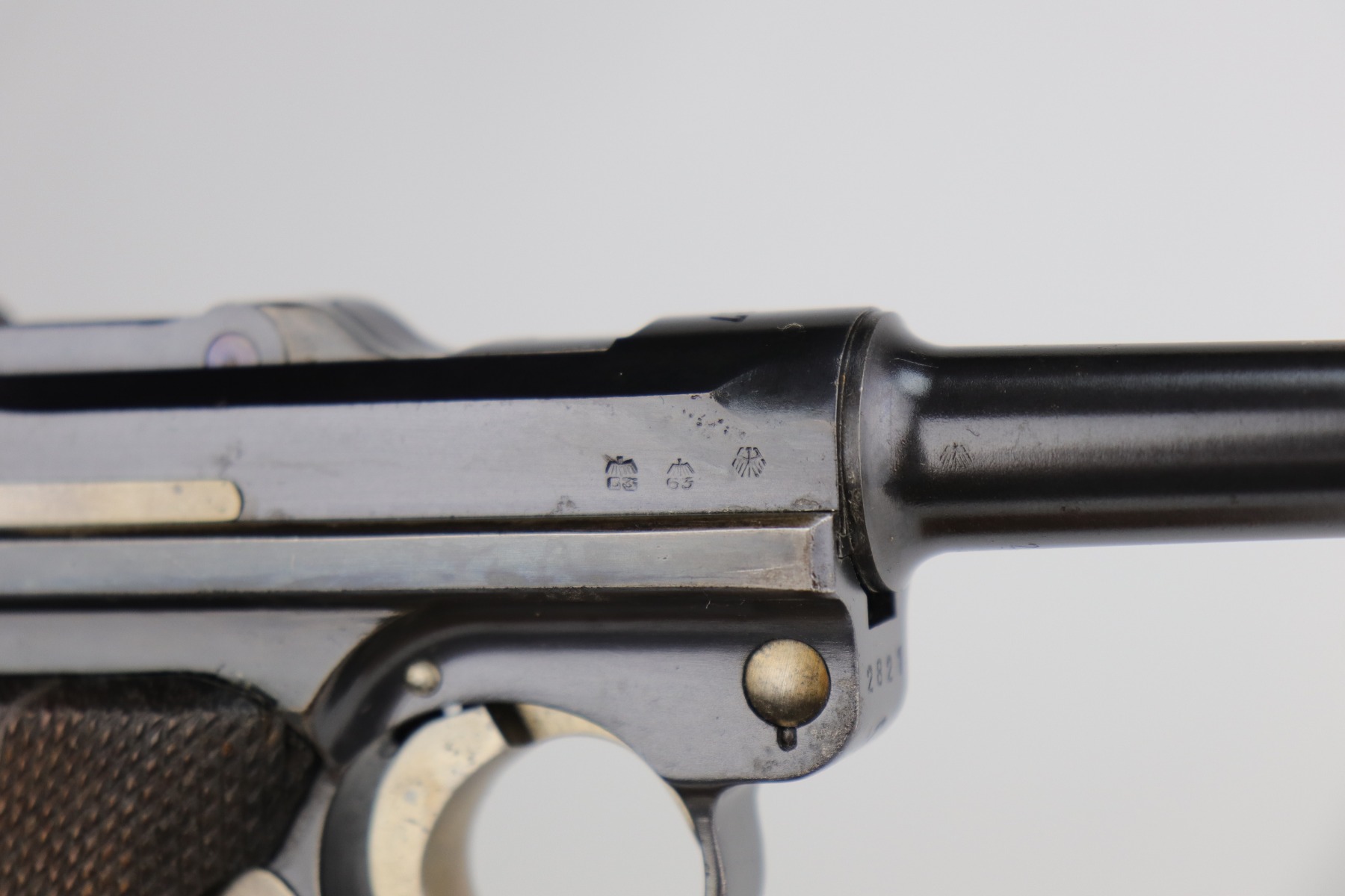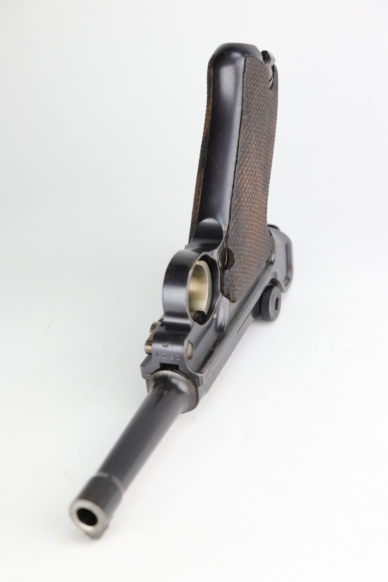 11/20/20 – This is an excellent example of a Mauser Luger issued to the Nazi military in 1937. It is all matching and has the proper “Eagle 63” Nazi military acceptance proofs. Fully functional. It has retained about 96-97% of its original bluing. There is minor wear around the muzzle, on the side plate, and the high edges of the frame. There is some splotchy discoloration on the back strap. There are areas of minor spotty oxidation/light pitting here and there but most visible on the left side of the gun and on the straps. It comes with original matching grips and one matching magazine. The bore is excellent – shiny with strong rifling.