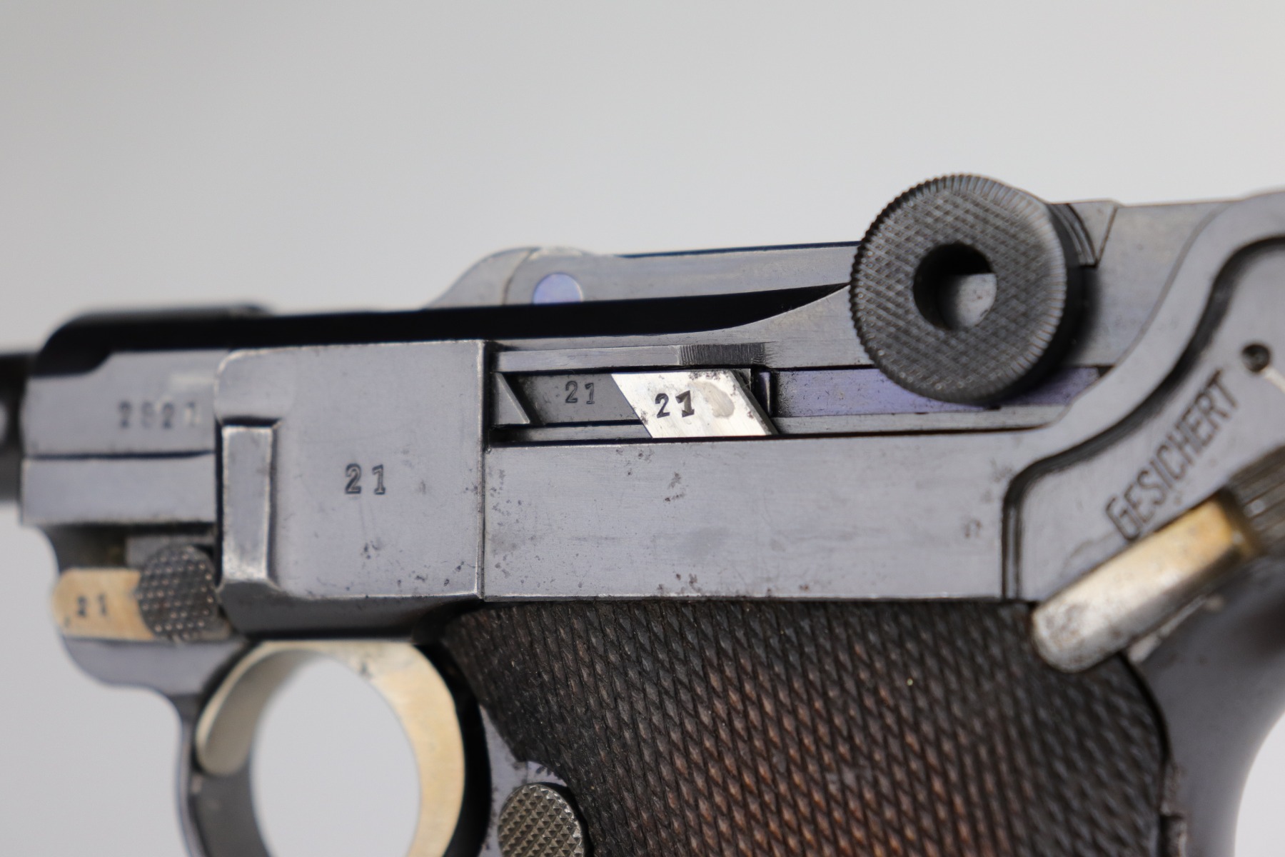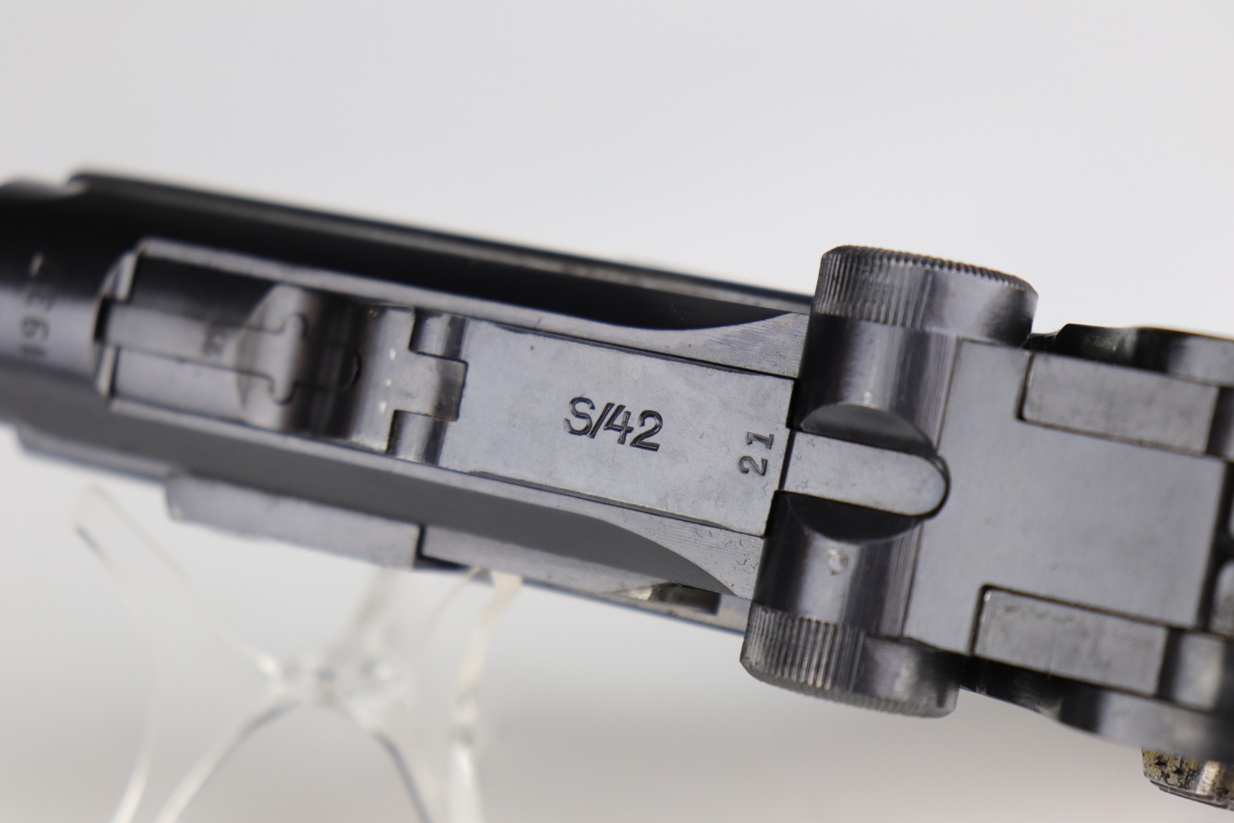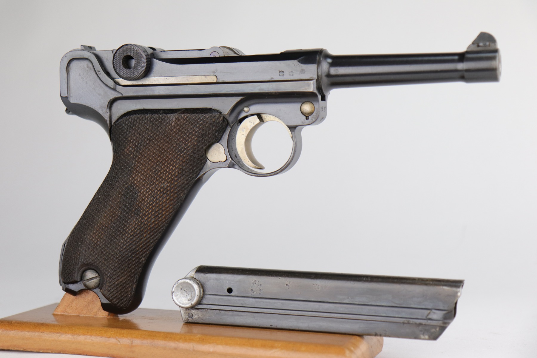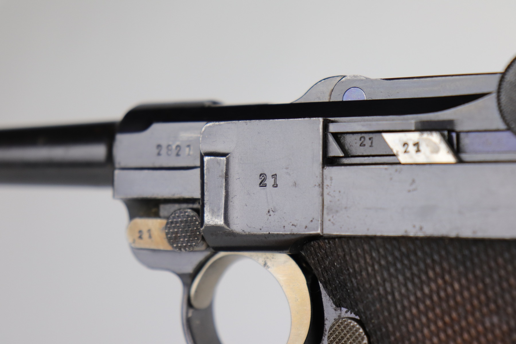 11/20/20 – This is an excellent example of a Mauser Luger issued to the Nazi military in 1937. It is all matching and has the proper “Eagle 63” Nazi military acceptance proofs. Fully functional. It has retained about 96-97% of its original bluing. There is minor wear around the muzzle, on the side plate, and the high edges of the frame. There is some splotchy discoloration on the back strap. There are areas of minor spotty oxidation/light pitting here and there but most visible on the left side of the gun and on the straps. It comes with original matching grips and one matching magazine. The bore is excellent – shiny with strong rifling.