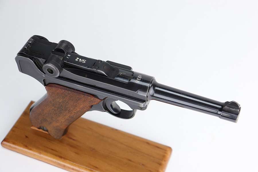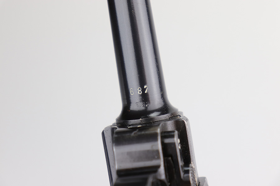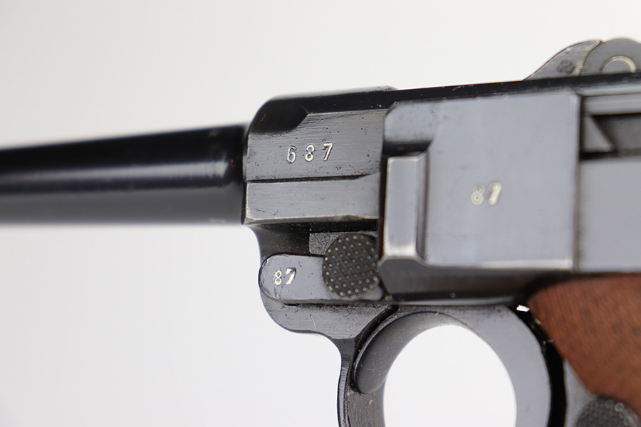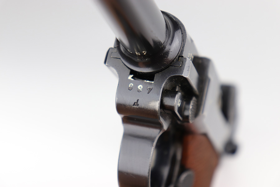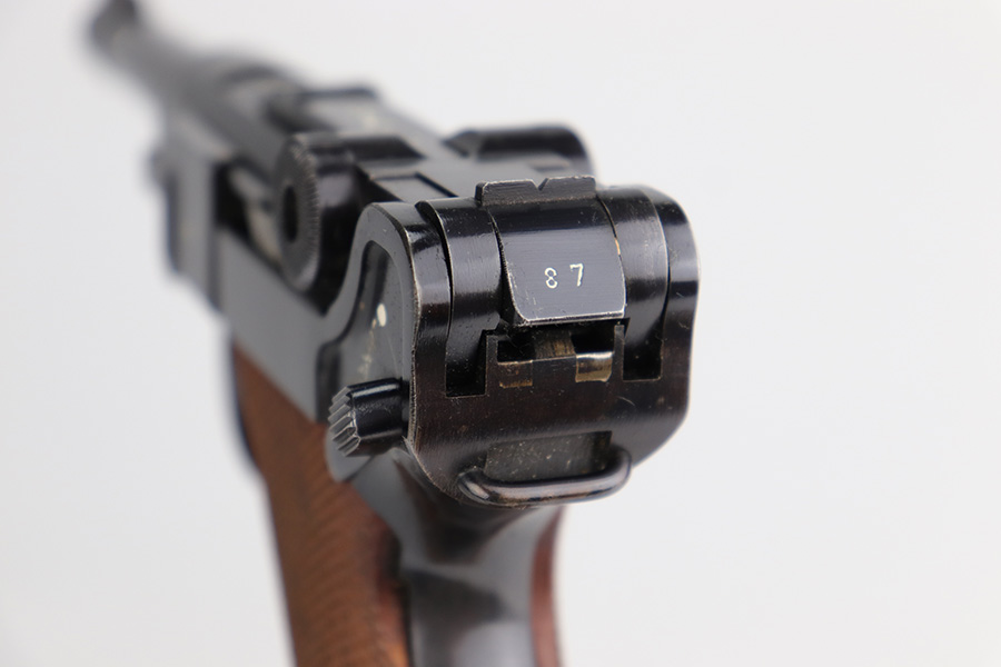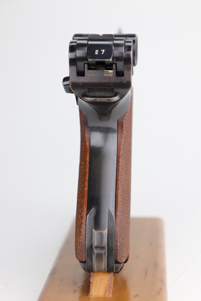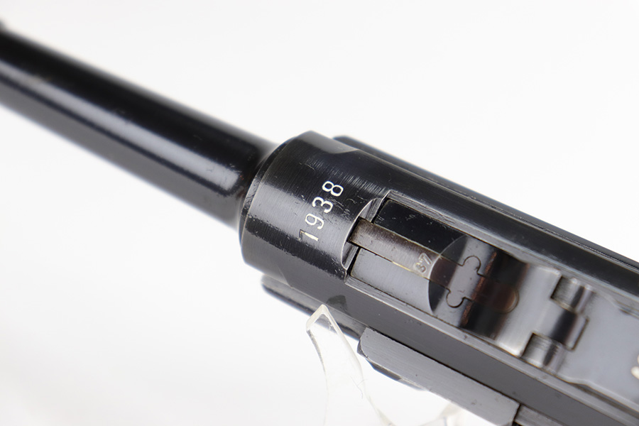 12/16/22 – This is a beautiful example of an original Army Mauser Luger from 1938. Matching numbered small parts, with period original but mismatched magazine and unmarked grips. The original blue rates at about 97% with wear on the muzzle, sideplate and bottom of front strap. Excellent bore. The grips appear to be replacements but are in good condition.
