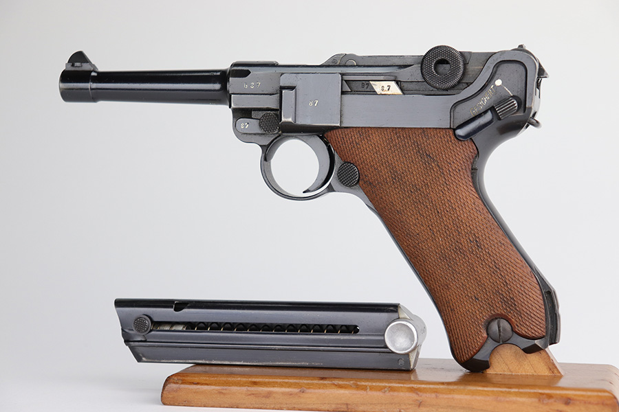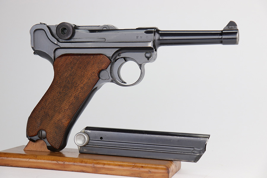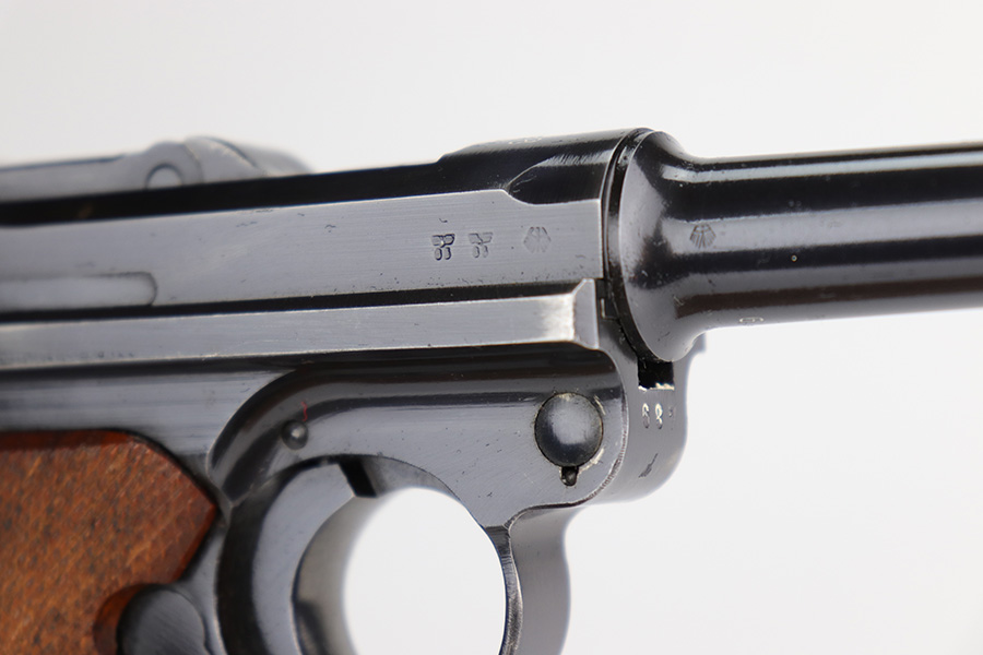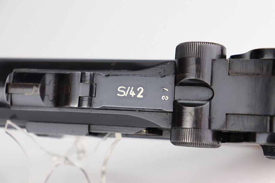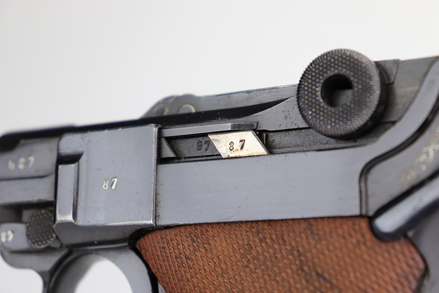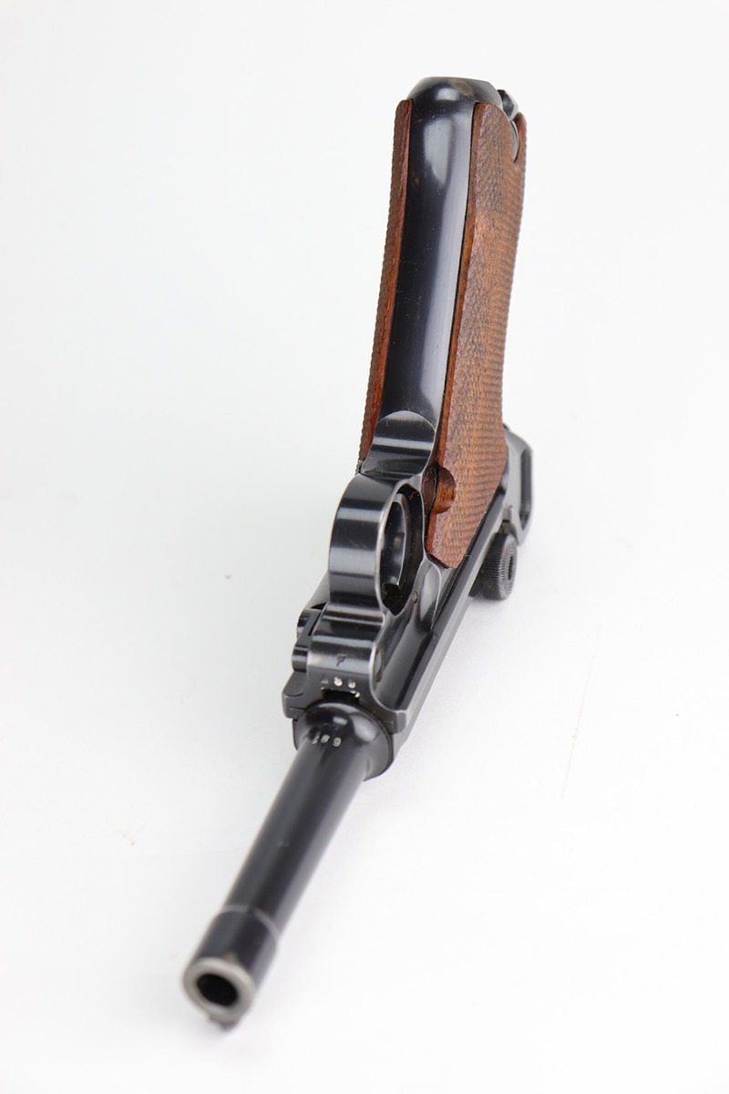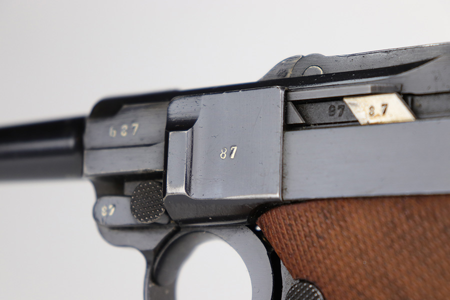 12/16/22 – This is a beautiful example of an original Army Mauser Luger from 1938. Matching numbered small parts, with period original but mismatched magazine and unmarked grips. The original blue rates at about 97% with wear on the muzzle, sideplate and bottom of front strap. Excellent bore. The grips appear to be replacements but are in good condition.