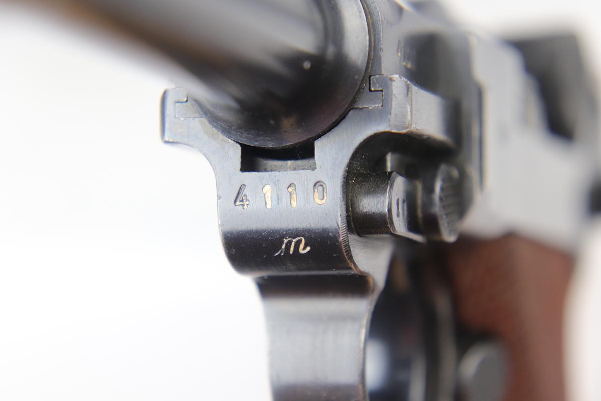 6/7/18 – This is an all matching and original Nazi issued Mauser luger from 1938.  It retains about 96% of its original blue with some high edge thinning, as well as an area of finish loss on the trigger guard.  All matching parts, including magazine.  Grips are waffen marked but not numbered.  Bore is excellent and shiny.