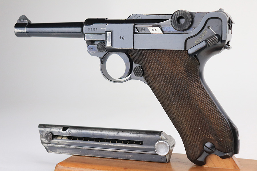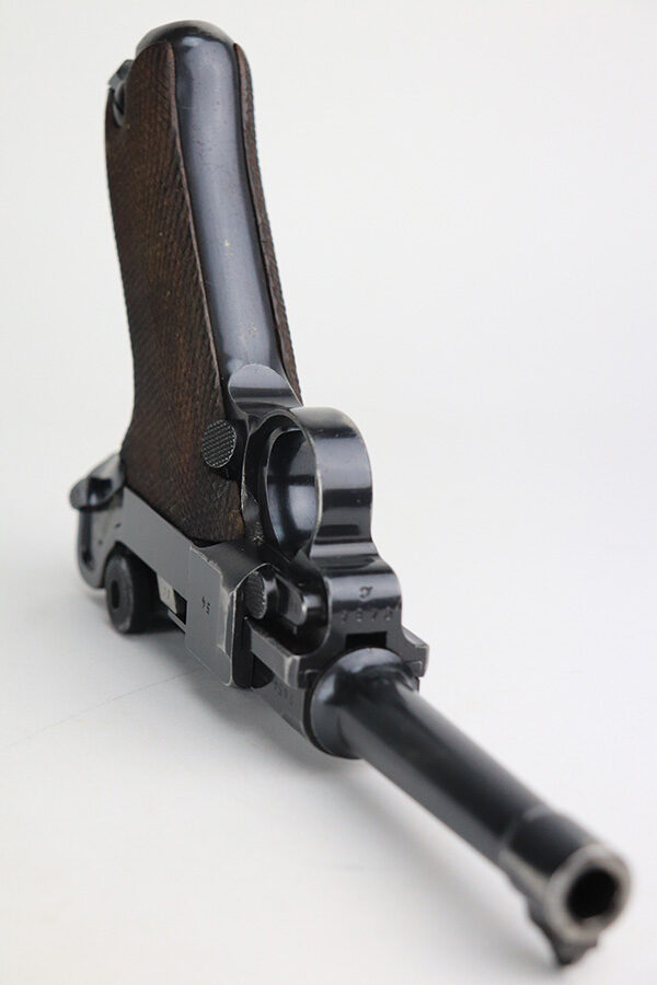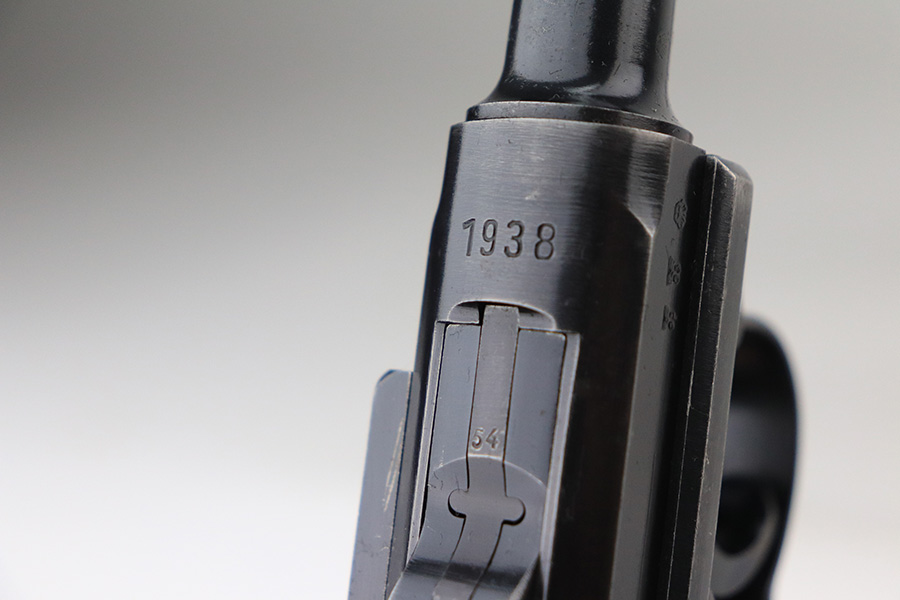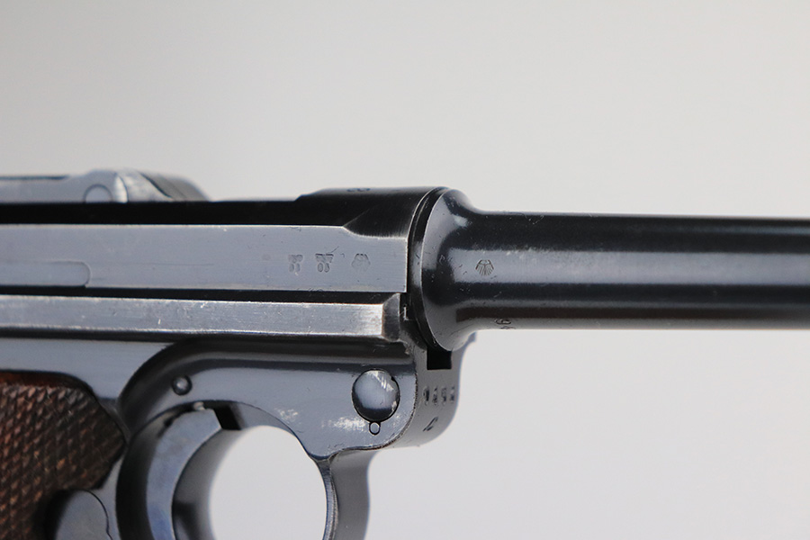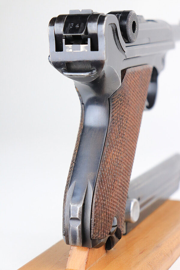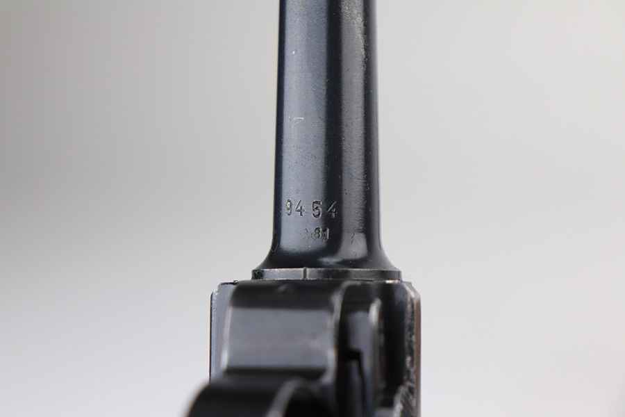 1/25/22 – This is an excellent example of a Mauser Luger issued to the Nazi military in 1938. The gun is all matching (un-numbered firing pin) and has the proper “Eagle 63” Nazi military acceptance proofs on the right side of the slide. This one also comes with one original matching-numbered magazine. The gun has retained about 95-96% of its original finish. There is minor wear on the side plate, side rails, and around the muzzle. An area of wear at the base of the front strap. There are some very minor scratches and handling marks on the front strap. Comes with very nice matching numbered grips – one very small chip in the top corner of the left panel. The bore has good rifling, but there is minor frosting throughout.