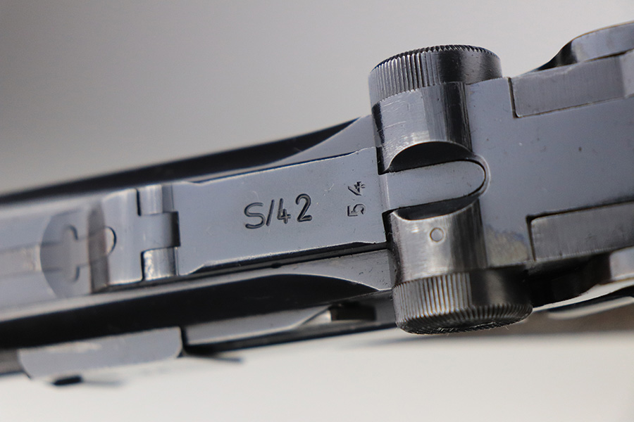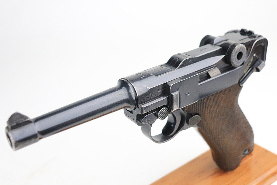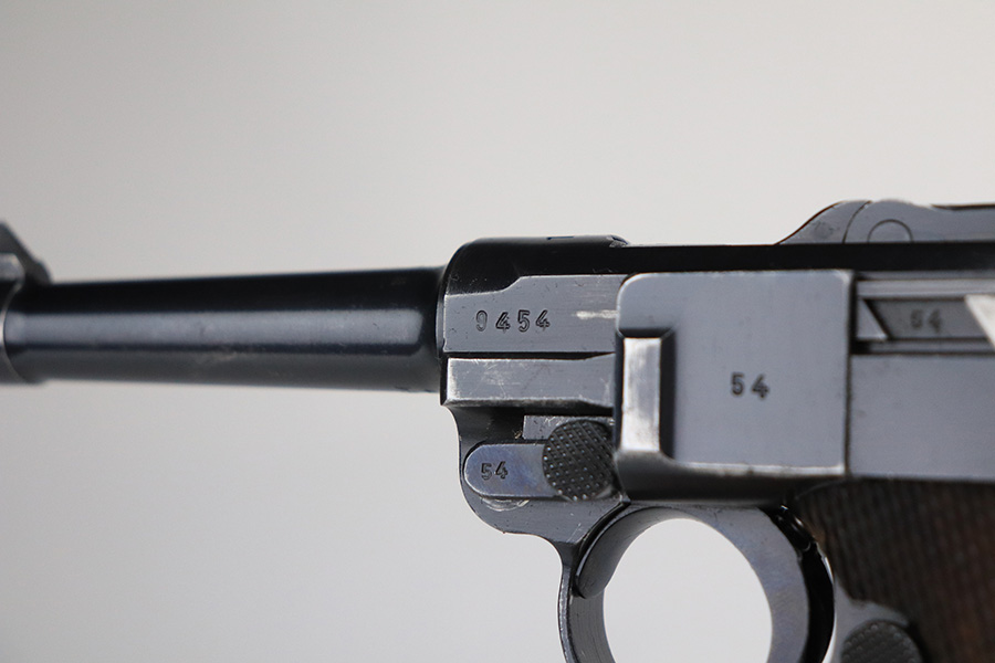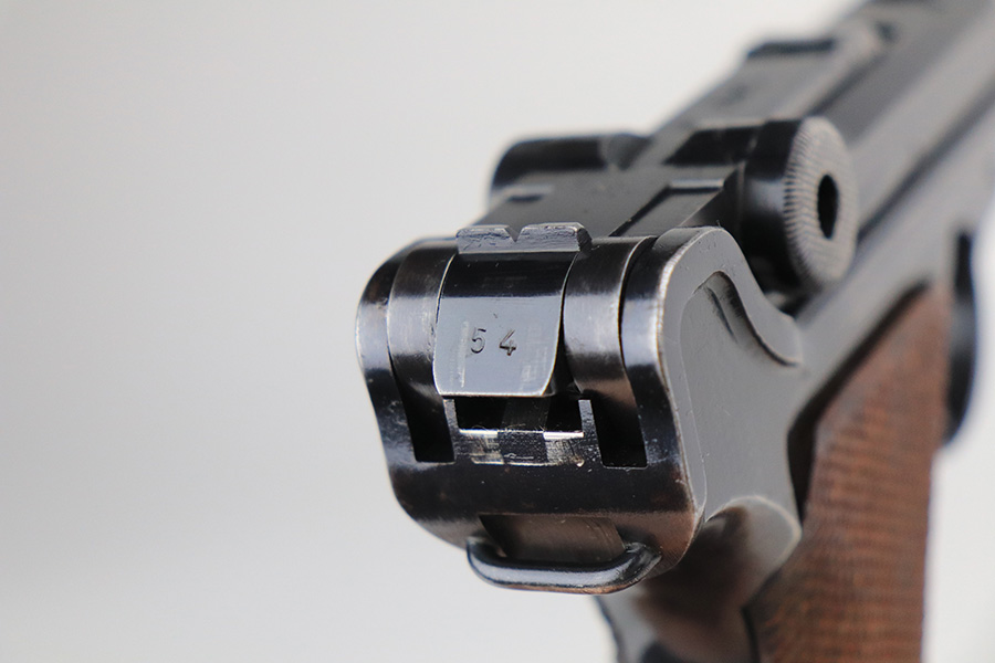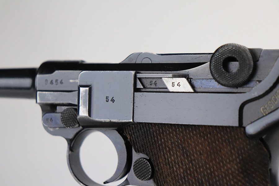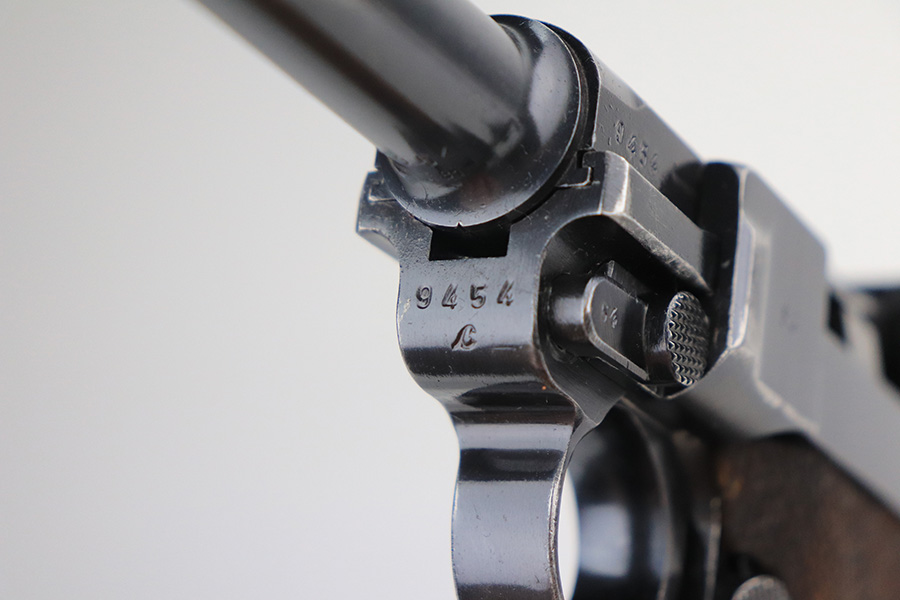 1/25/22 – This is an excellent example of a Mauser Luger issued to the Nazi military in 1938. The gun is all matching (un-numbered firing pin) and has the proper “Eagle 63” Nazi military acceptance proofs on the right side of the slide. This one also comes with one original matching-numbered magazine. The gun has retained about 95-96% of its original finish. There is minor wear on the side plate, side rails, and around the muzzle. An area of wear at the base of the front strap. There are some very minor scratches and handling marks on the front strap. Comes with very nice matching numbered grips – one very small chip in the top corner of the left panel. The bore has good rifling, but there is minor frosting throughout.
