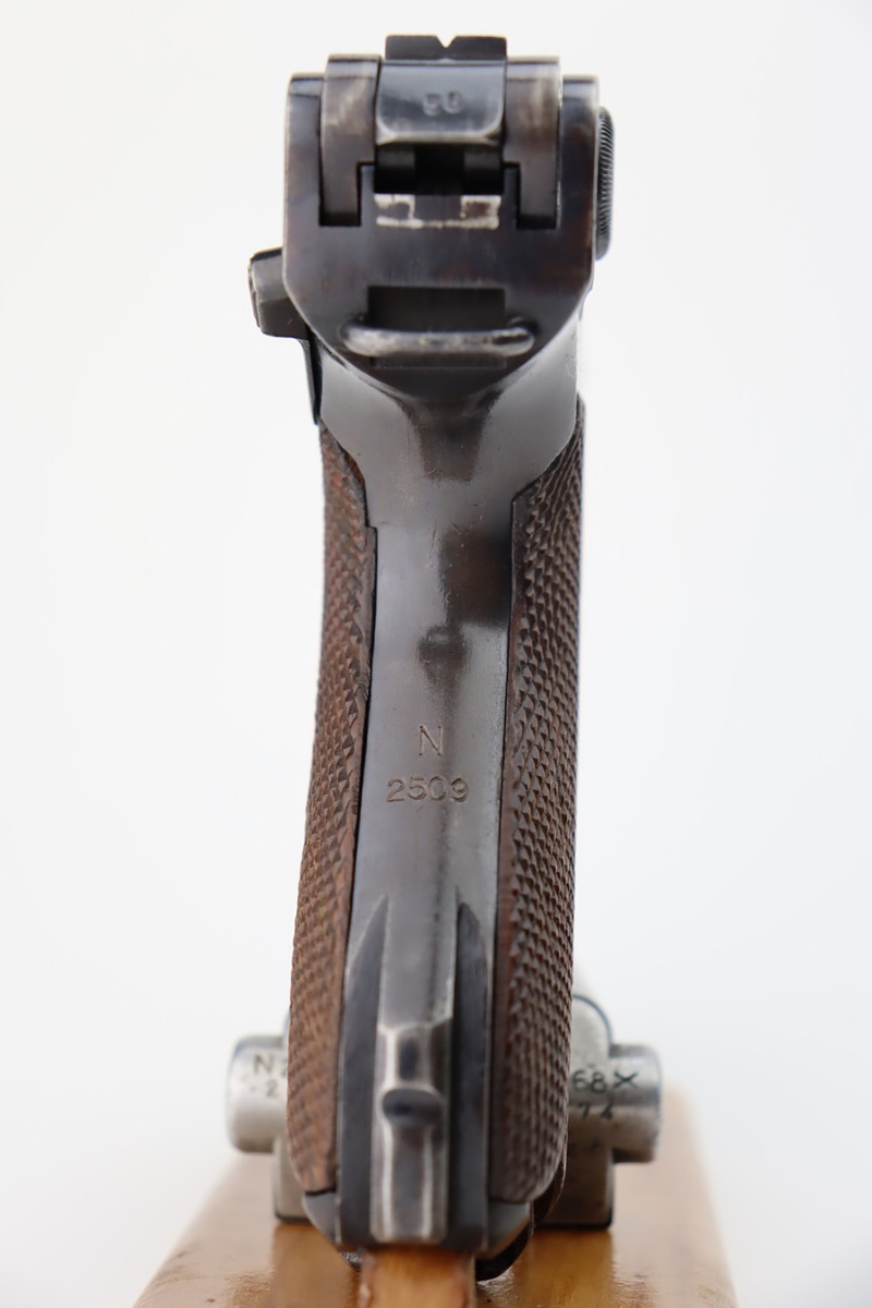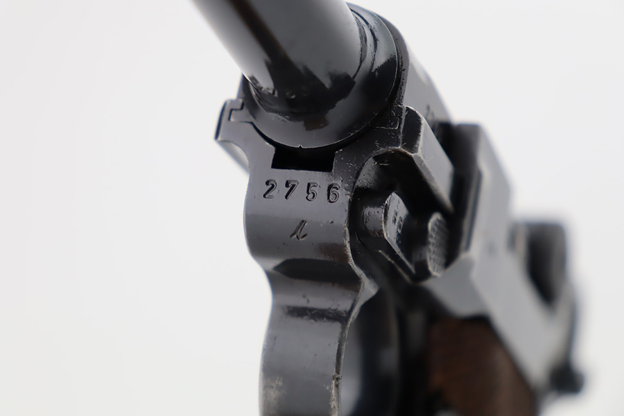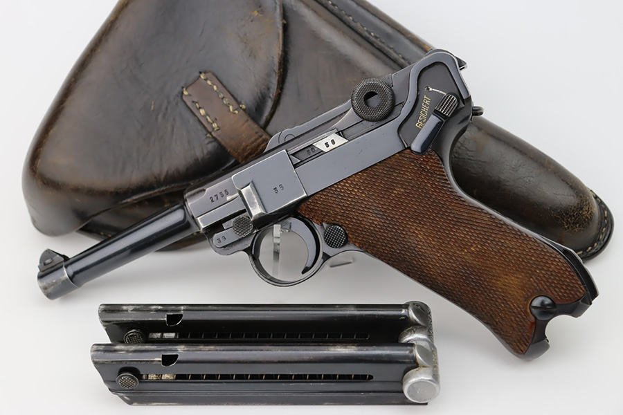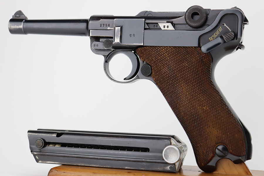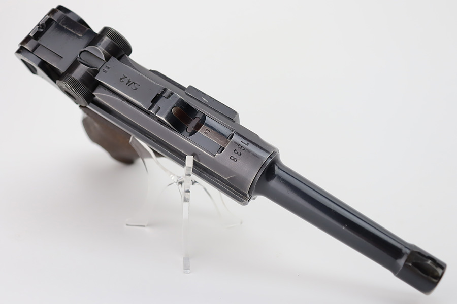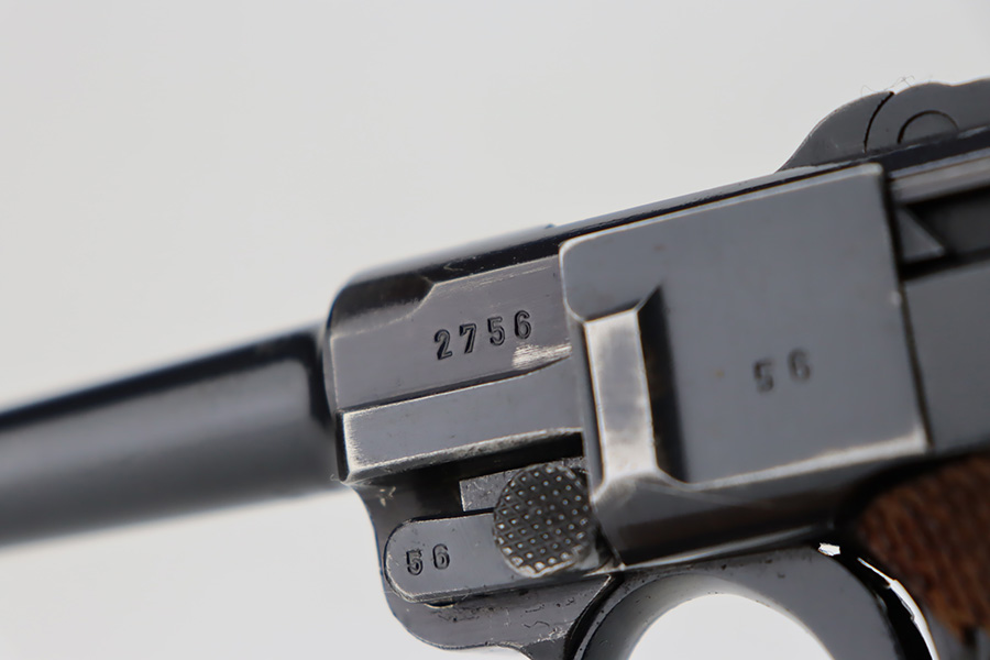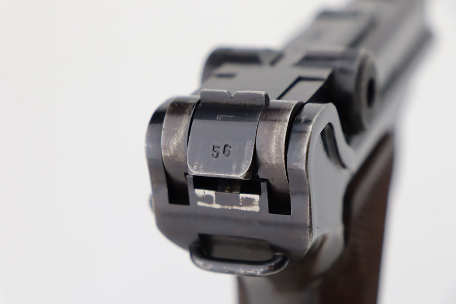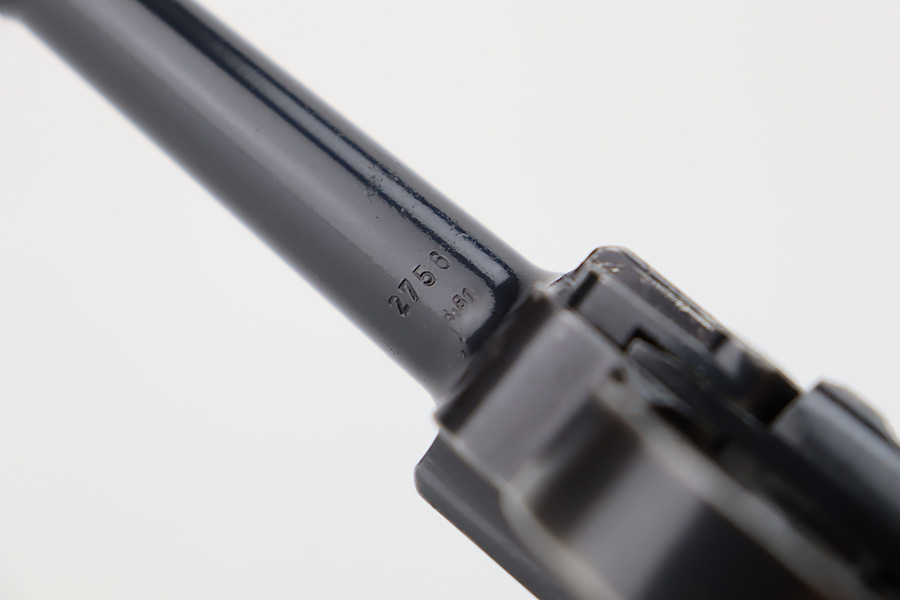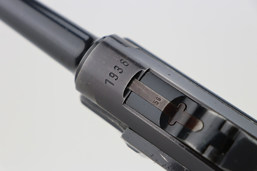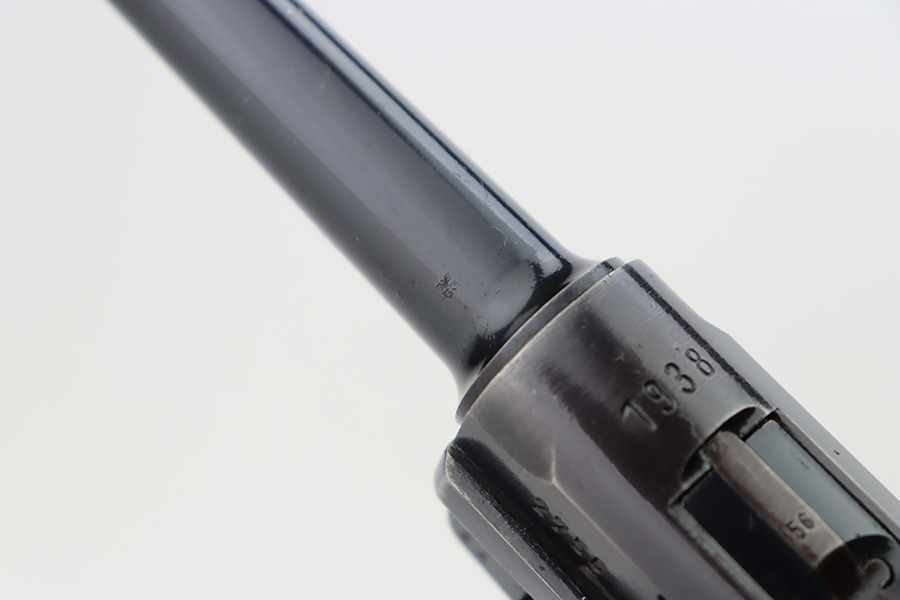 10/12/23 – This is an excellent example of a Mauser Luger issued to the Kriegsmarine in 1938. It is all matching with the proper “Eagle 63” military proofs and an “N 2509” Navy property mark on the back strap. It comes as a rig with a 1938-dated Navy-marked holster and two period-correct Navy marked magazines (not matching). The gun itself has retained about 94-95% of its original finish with very minor wear around the muzzle, on the high edges, and on the side plate. Minor dulling and light brown patina on the grip straps. Fitted with excellent matching-numbered wood grips. The bore has good rifling, but there is minor pin-pricking throughout.