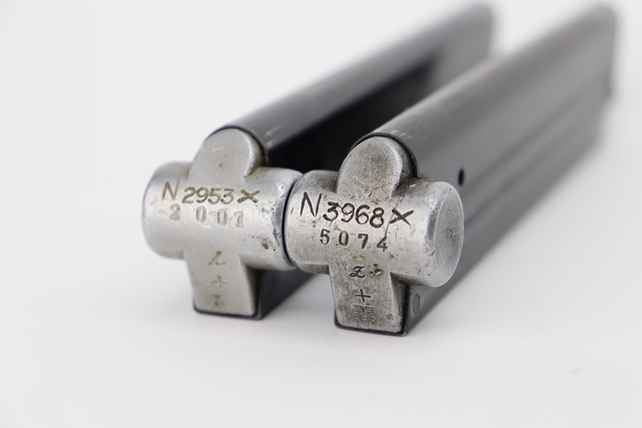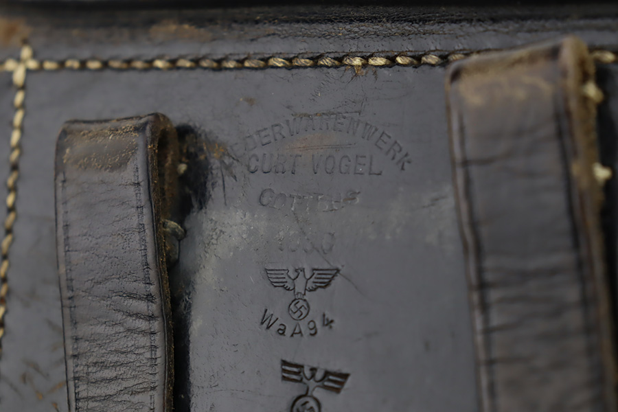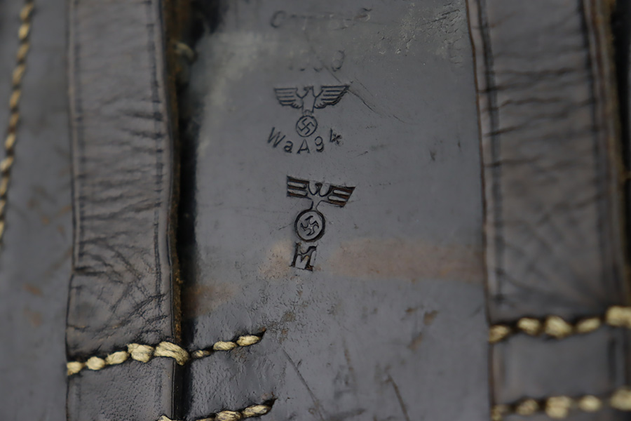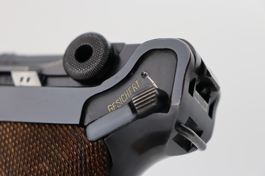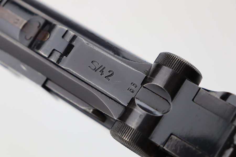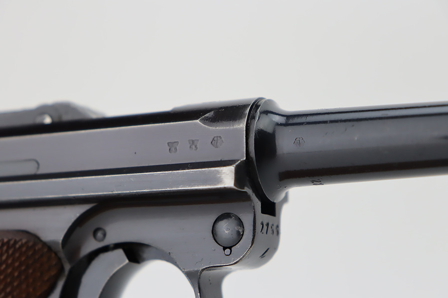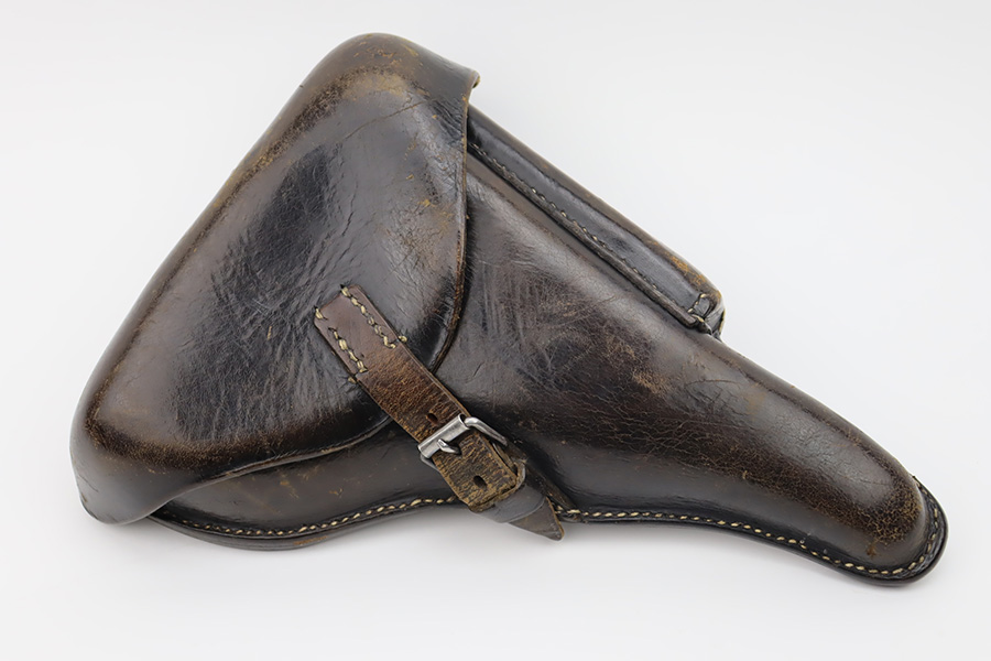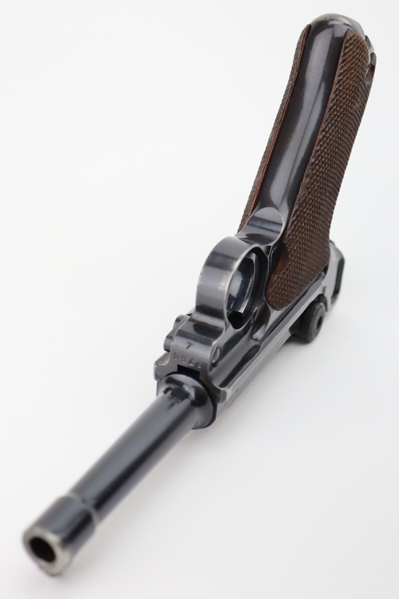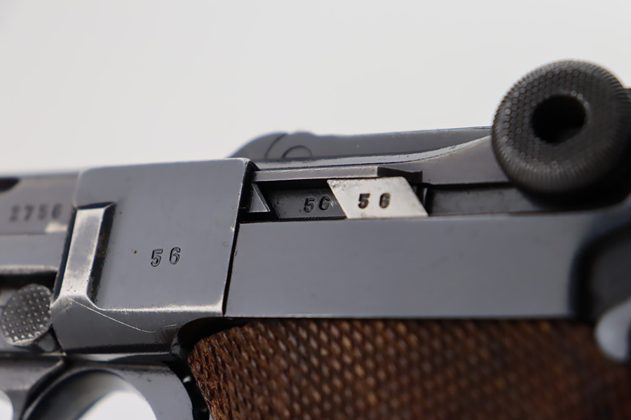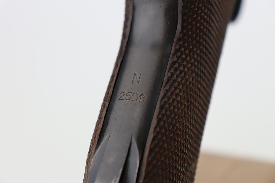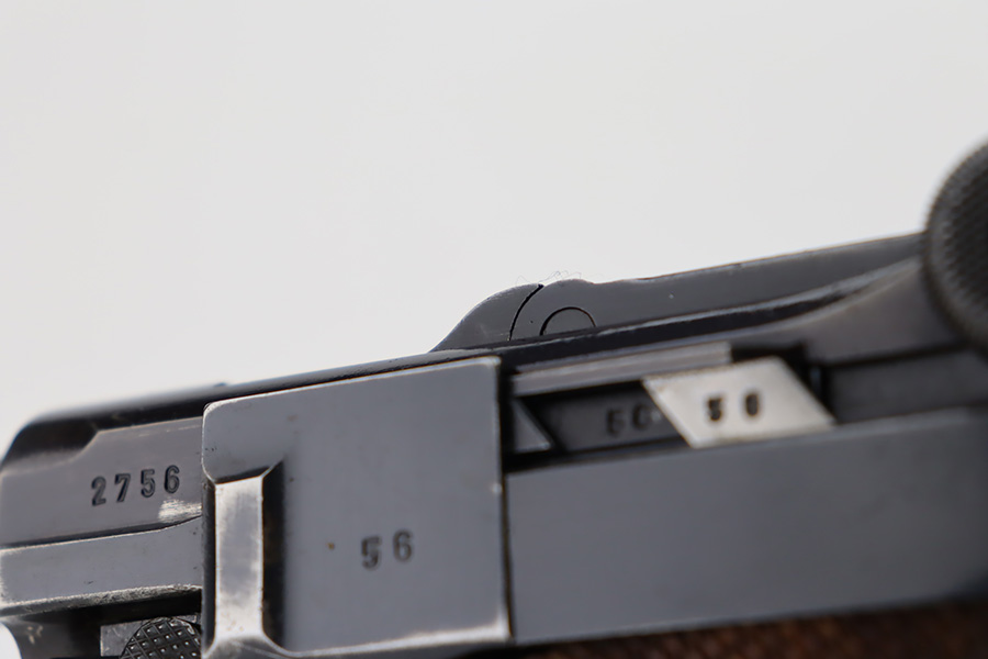 10/12/23 – This is an excellent example of a Mauser Luger issued to the Kriegsmarine in 1938. It is all matching with the proper “Eagle 63” military proofs and an “N 2509” Navy property mark on the back strap. It comes as a rig with a 1938-dated Navy-marked holster and two period-correct Navy marked magazines (not matching). The gun itself has retained about 94-95% of its original finish with very minor wear around the muzzle, on the high edges, and on the side plate. Minor dulling and light brown patina on the grip straps. Fitted with excellent matching-numbered wood grips. The bore has good rifling, but there is minor pin-pricking throughout.
