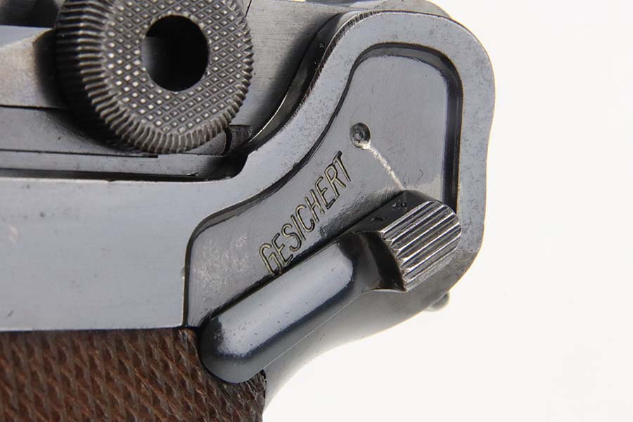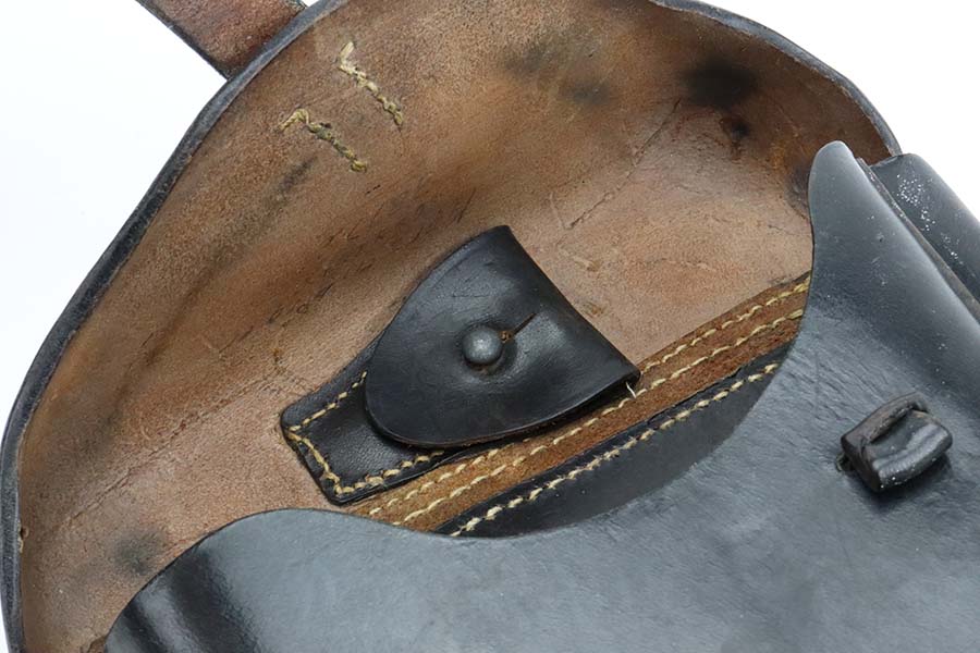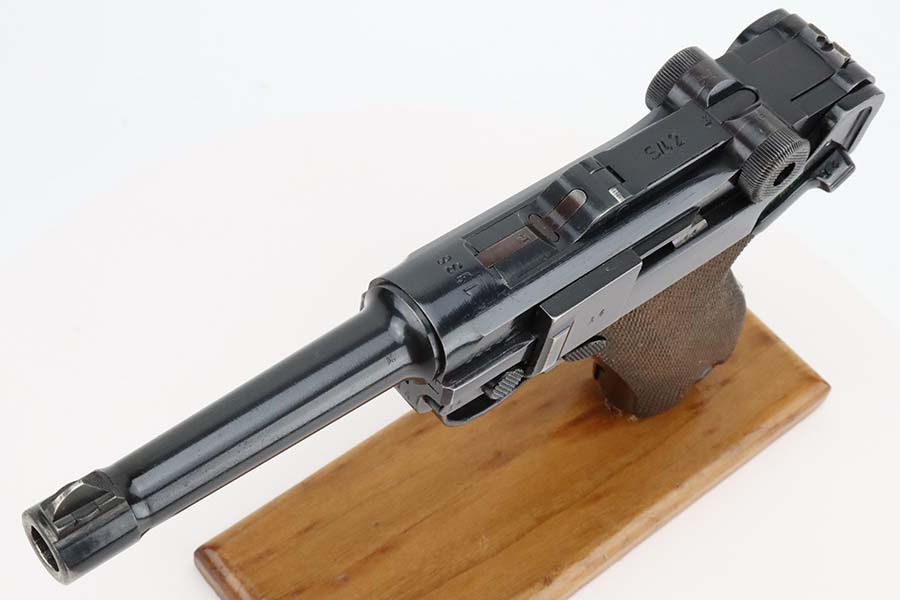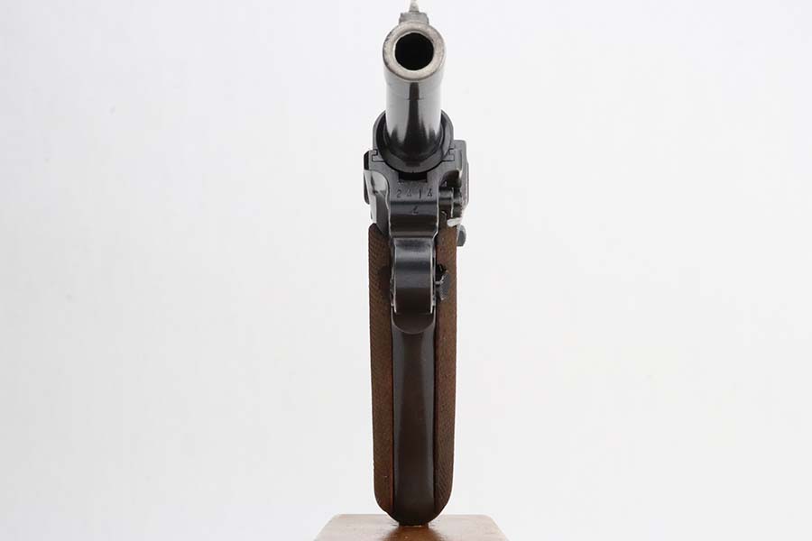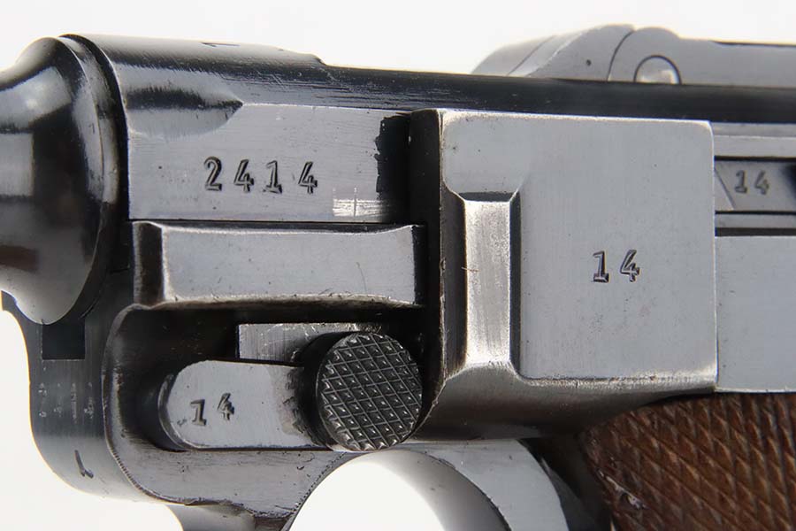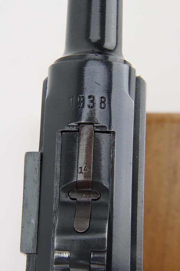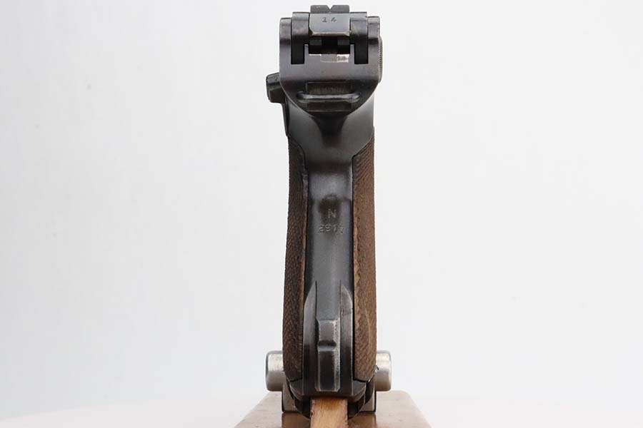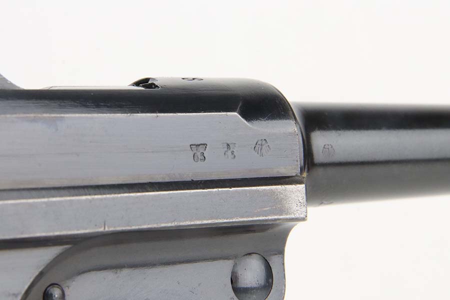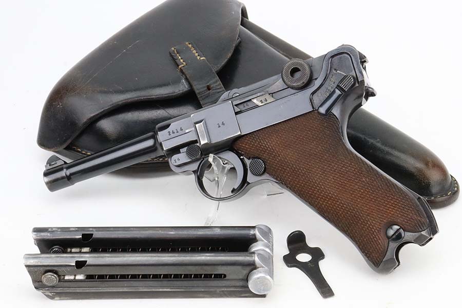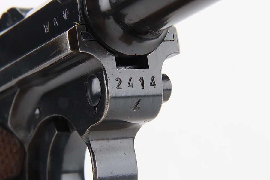 3/4/24 – This is an excellent example of a Mauser Luger issued to the Kriegsmarine in 1938. It is all matching with the proper “Eagle 63” military proofs and an “N 2917” Navy property mark on the back strap. It comes as a rig with a 1938-dated Navy-marked holster, one original matching magazine, one mismatched magazine (non-Navy), and a scarce “Waffen 63” marked tool. The gun itself has retained about 95% of its original finish with very minor wear around the muzzle, on the high edges, and on the side plate. Minor dulling and light brown patina on the grip straps. Fitted with excellent matching-numbered wood grips. The bore has good rifling, but there is noticeable pin-pricking throughout.