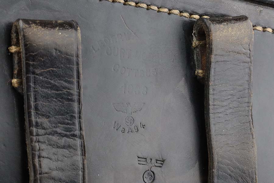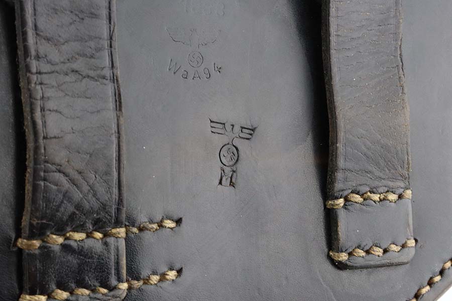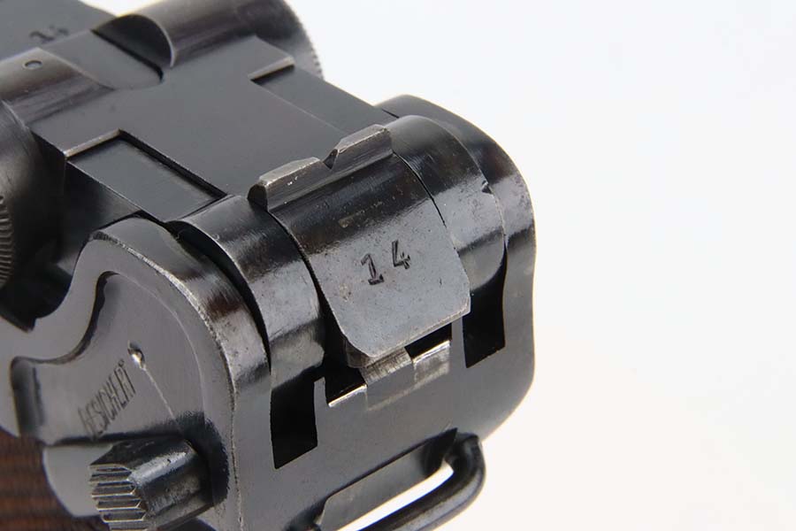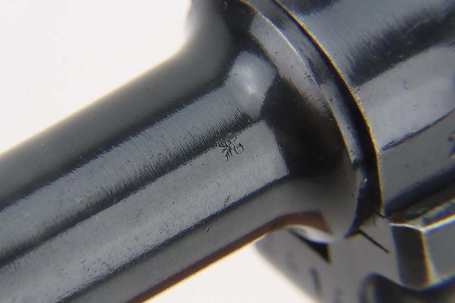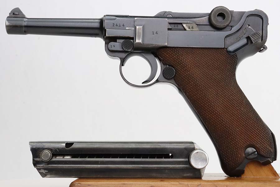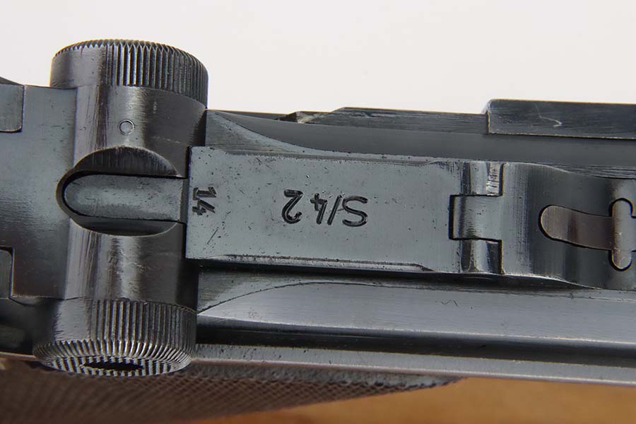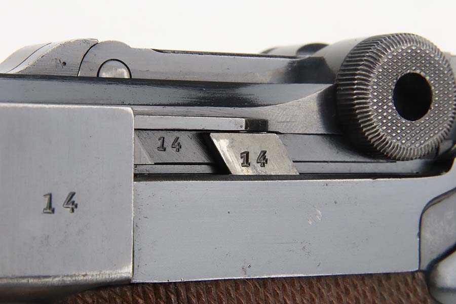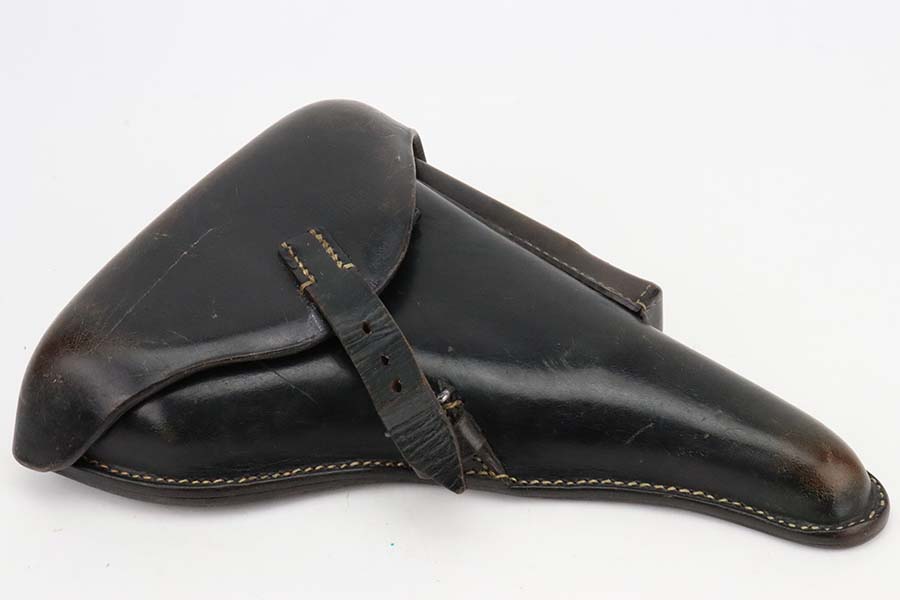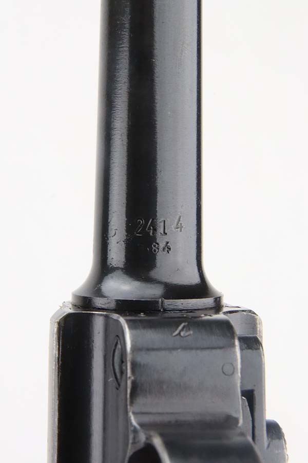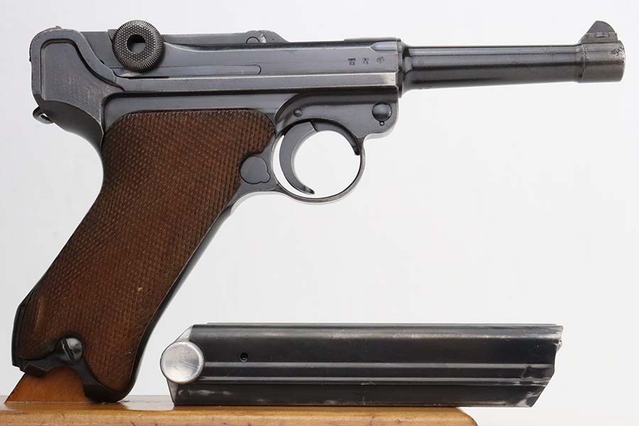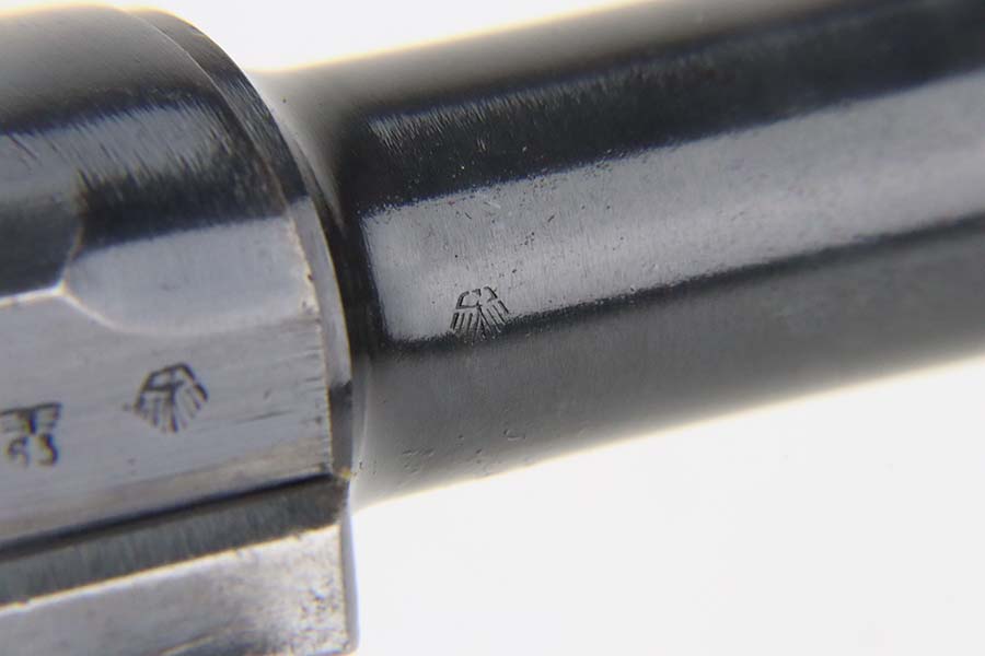 3/4/24 – This is an excellent example of a Mauser Luger issued to the Kriegsmarine in 1938. It is all matching with the proper “Eagle 63” military proofs and an “N 2917” Navy property mark on the back strap. It comes as a rig with a 1938-dated Navy-marked holster, one original matching magazine, one mismatched magazine (non-Navy), and a scarce “Waffen 63” marked tool. The gun itself has retained about 95% of its original finish with very minor wear around the muzzle, on the high edges, and on the side plate. Minor dulling and light brown patina on the grip straps. Fitted with excellent matching-numbered wood grips. The bore has good rifling, but there is noticeable pin-pricking throughout.
