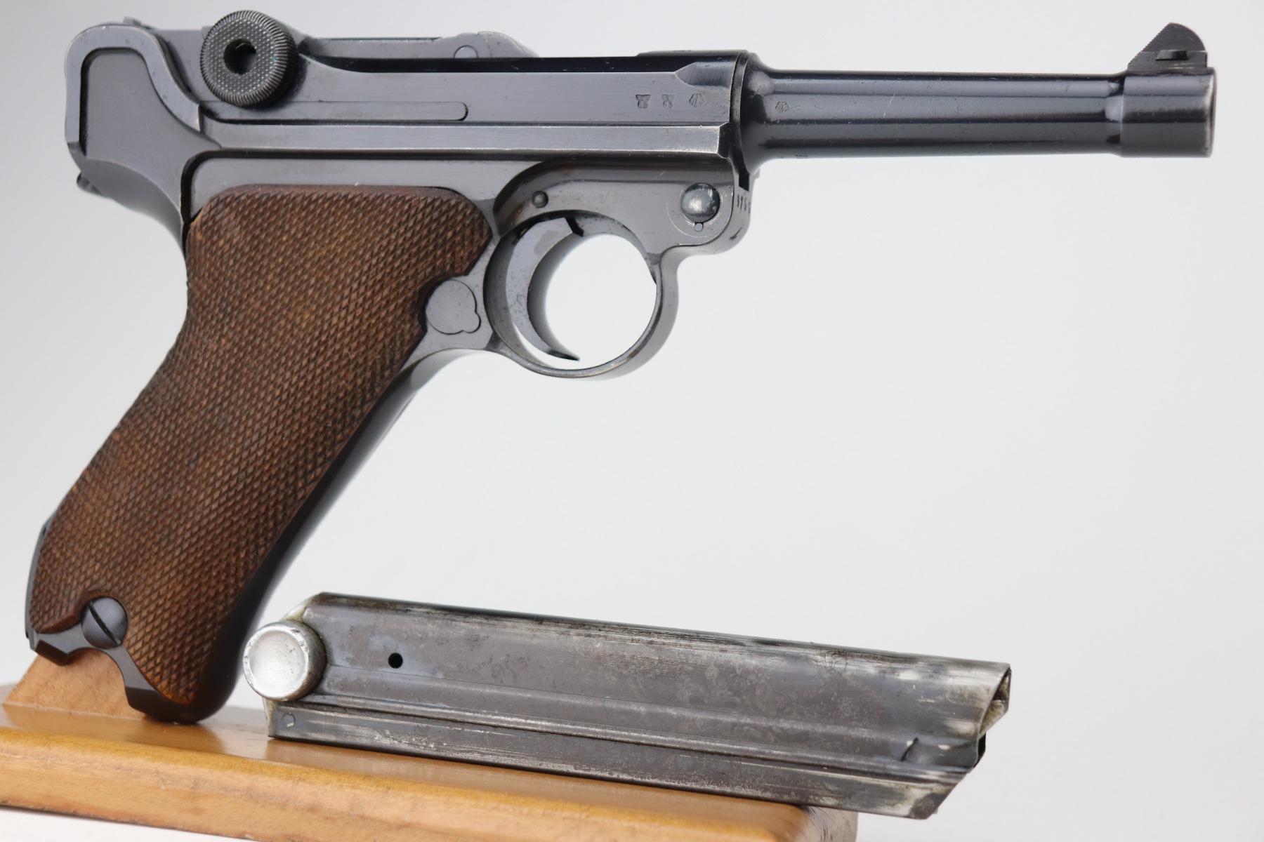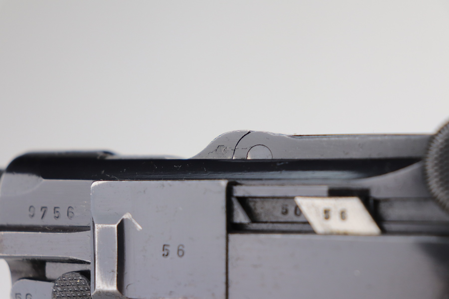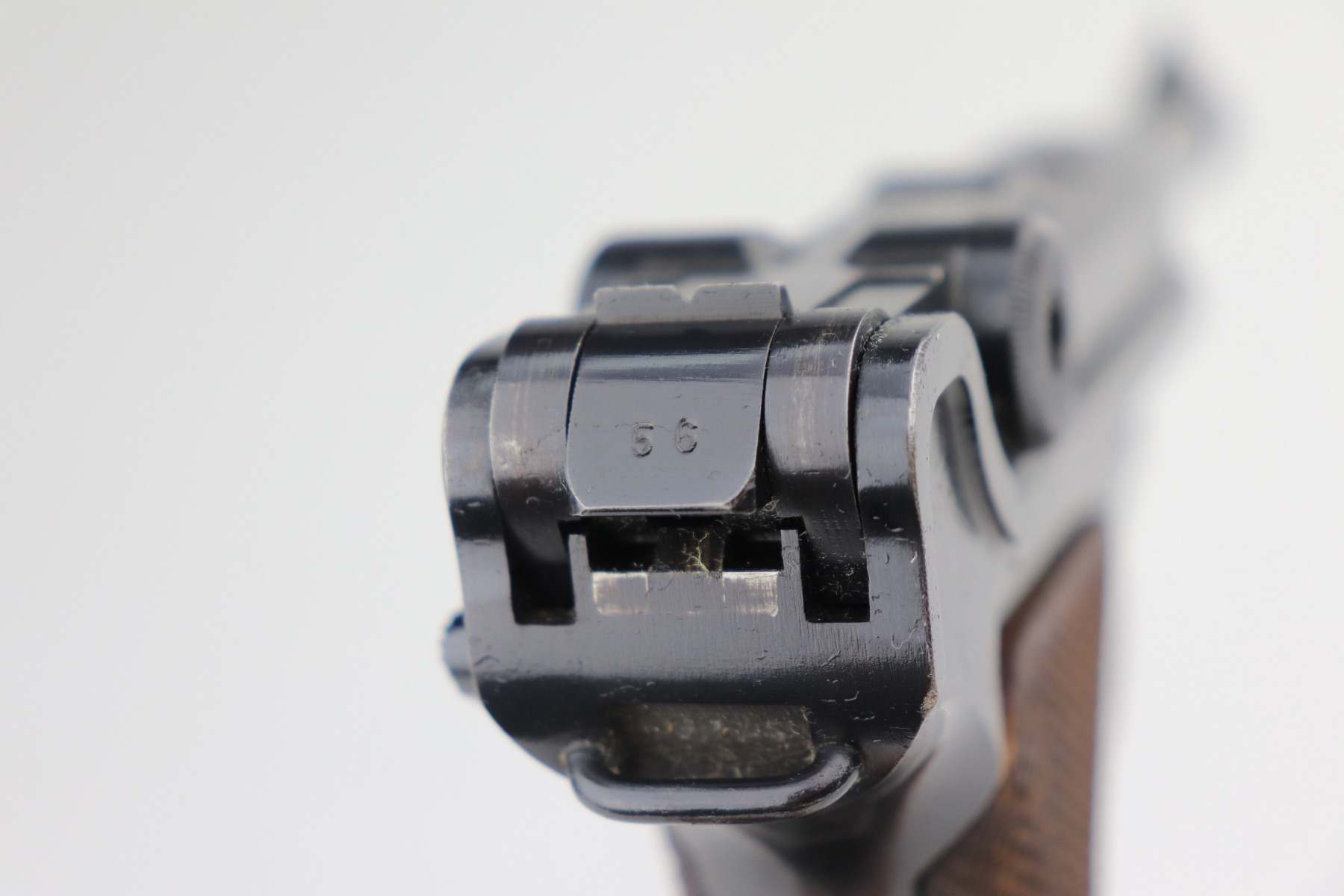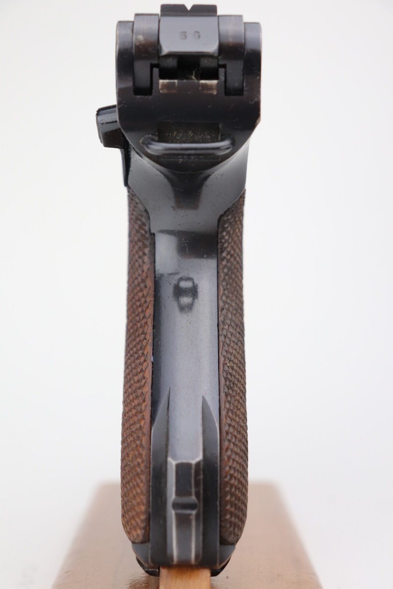 2/24/21 – This is an excellent example of a Mauser Luger issued to the Nazi military in 1938. It is all matching and has the proper “Eagle 63” military proofs. It has retained about 96% of its original finish. There is very minor wear on the side plate, around the muzzle, and the high edges of the frame. There are a couple of small areas of wear on the barrel. There are two small dings on the front strap. It comes with excellent matching grips and a period-correct magazine. The magazine is mismatched but very close in serial number. The bore is excellent – shiny with strong rifling.
