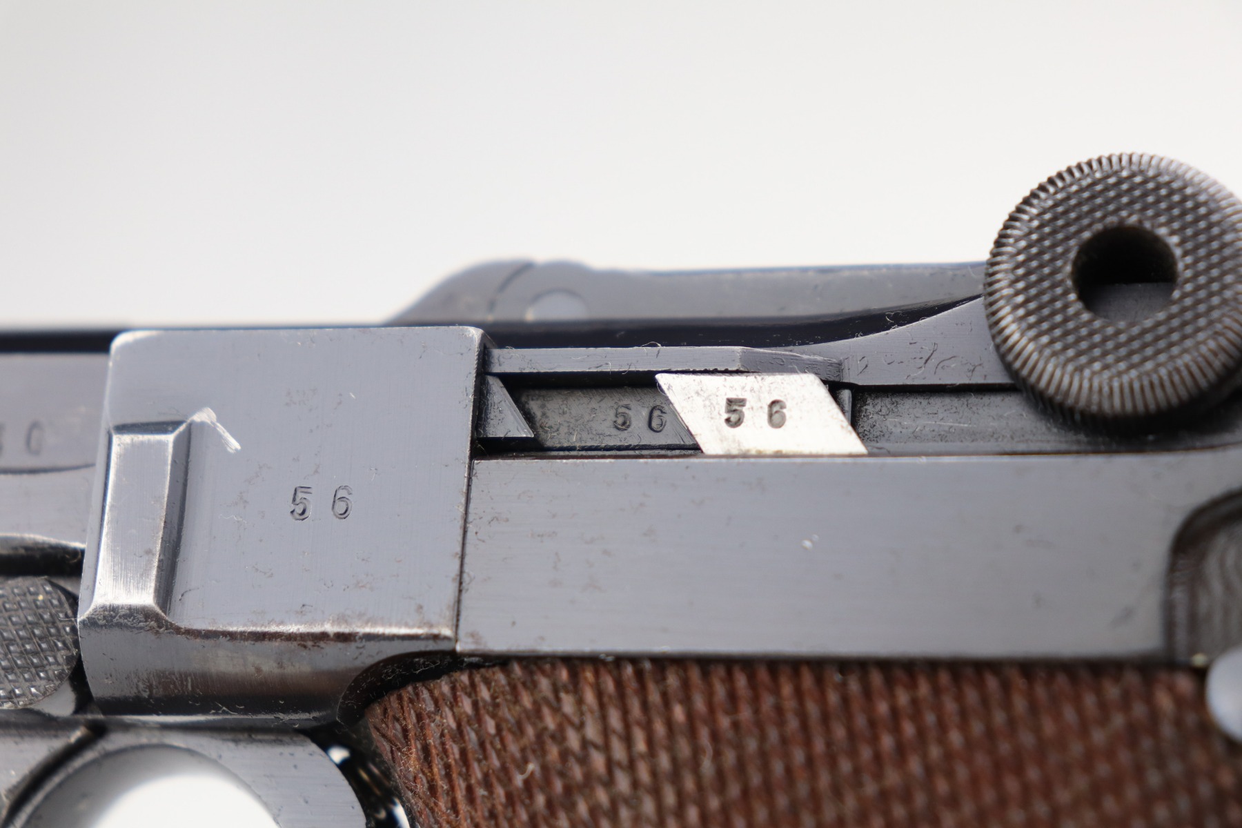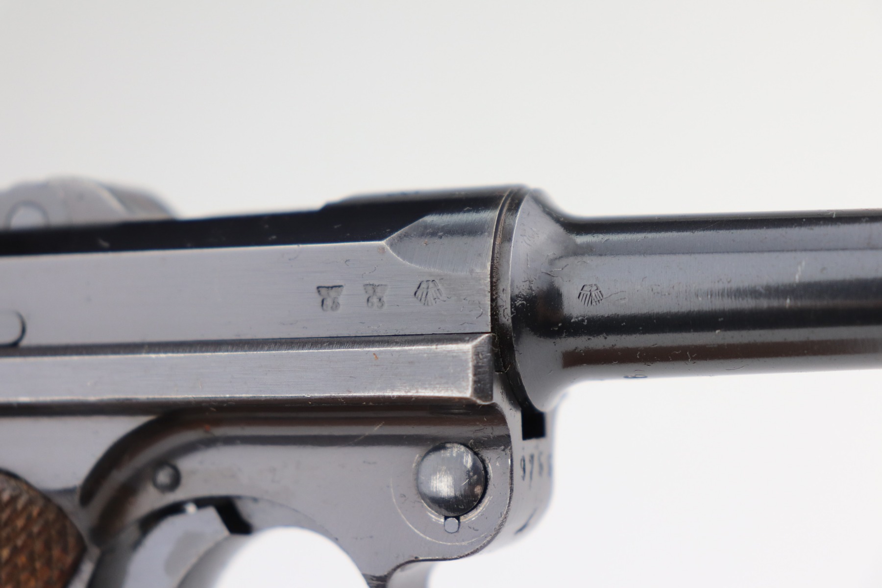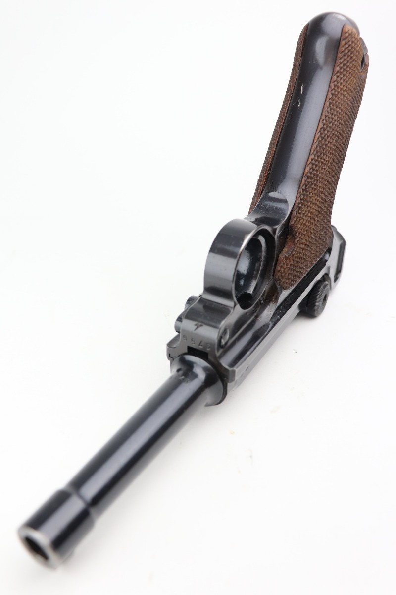 2/24/21 – This is an excellent example of a Mauser Luger issued to the Nazi military in 1938. It is all matching and has the proper “Eagle 63” military proofs. It has retained about 96% of its original finish. There is very minor wear on the side plate, around the muzzle, and the high edges of the frame. There are a couple of small areas of wear on the barrel. There are two small dings on the front strap. It comes with excellent matching grips and a period-correct magazine. The magazine is mismatched but very close in serial number. The bore is excellent – shiny with strong rifling.