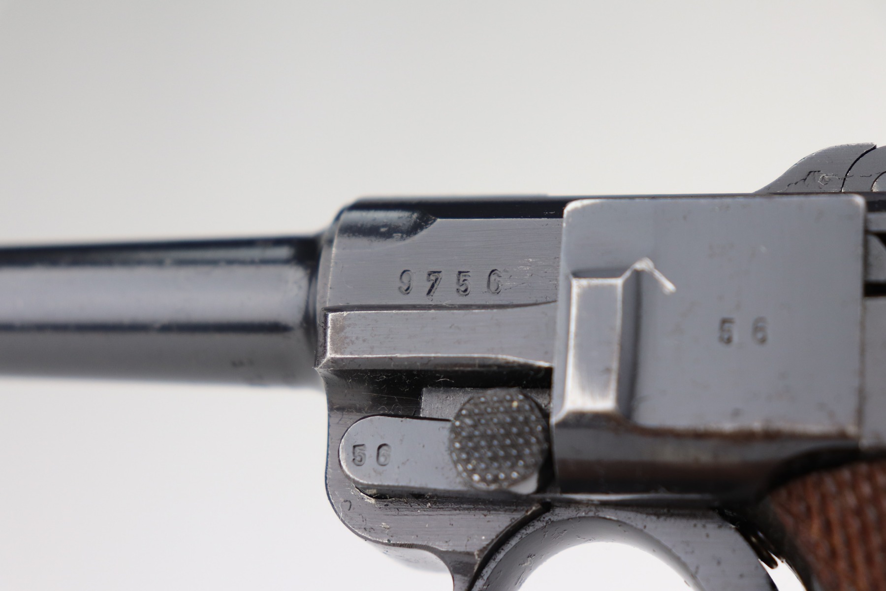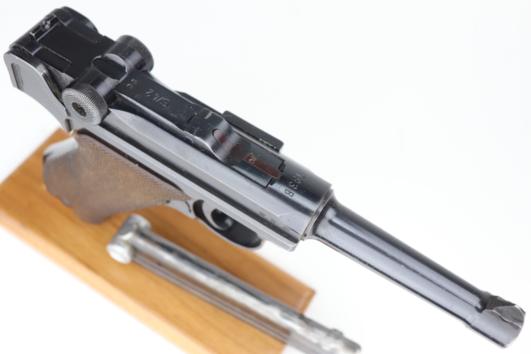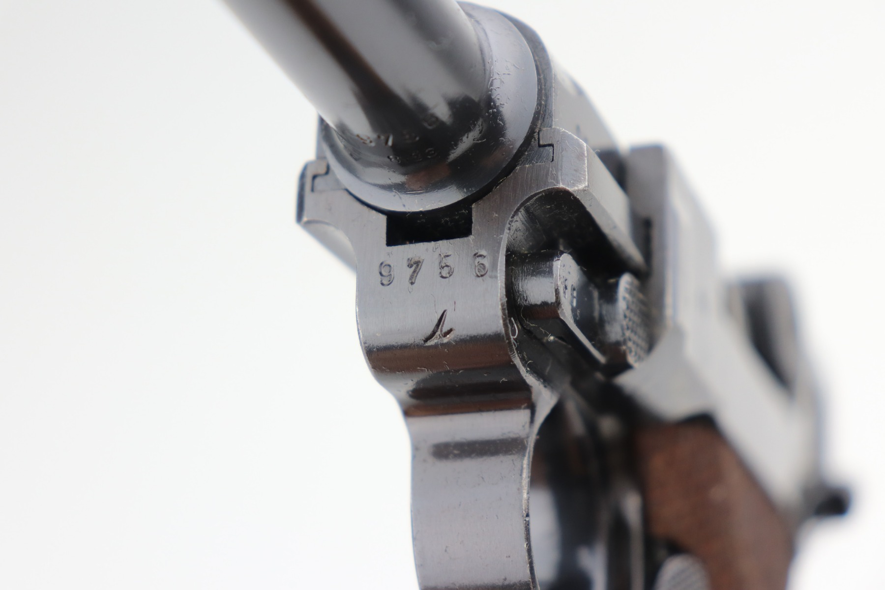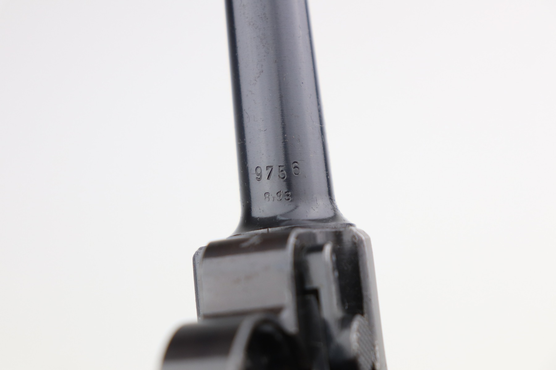 2/24/21 – This is an excellent example of a Mauser Luger issued to the Nazi military in 1938. It is all matching and has the proper “Eagle 63” military proofs. It has retained about 96% of its original finish. There is very minor wear on the side plate, around the muzzle, and the high edges of the frame. There are a couple of small areas of wear on the barrel. There are two small dings on the front strap. It comes with excellent matching grips and a period-correct magazine. The magazine is mismatched but very close in serial number. The bore is excellent – shiny with strong rifling.