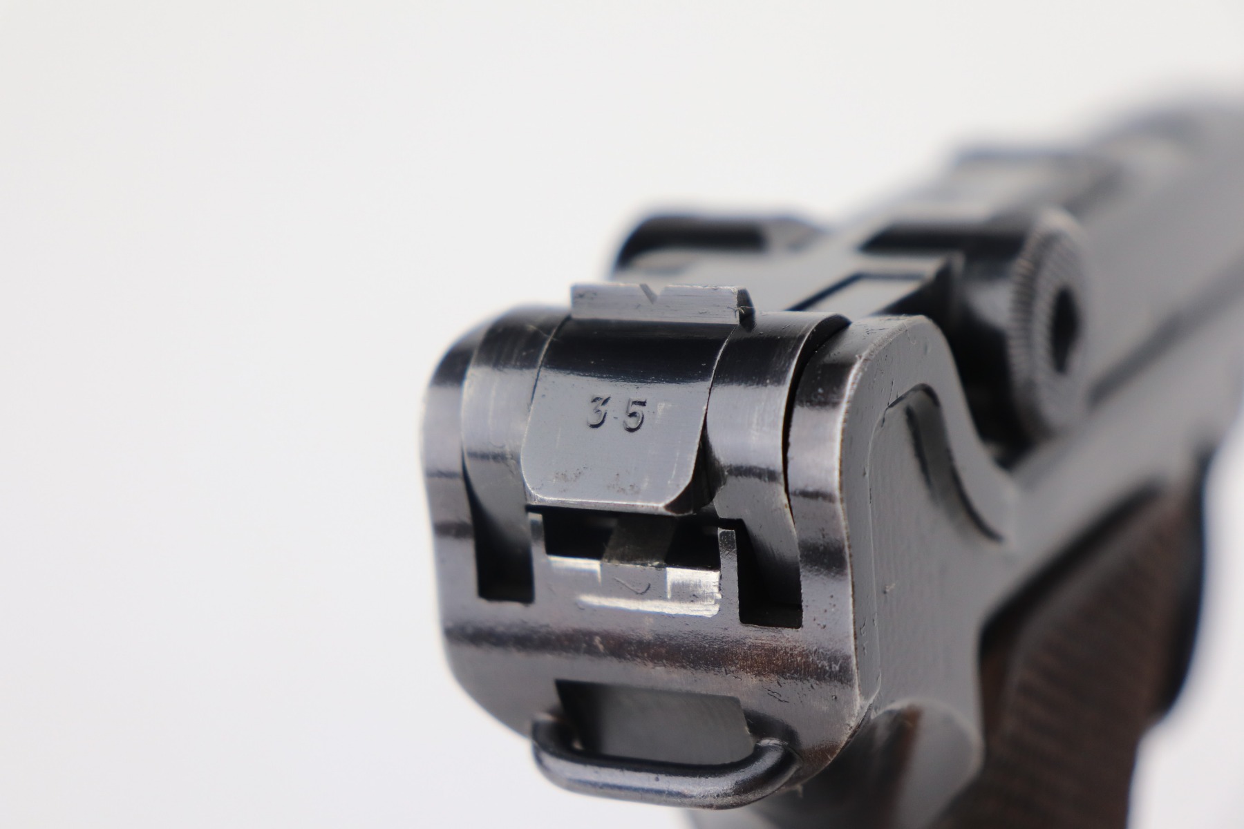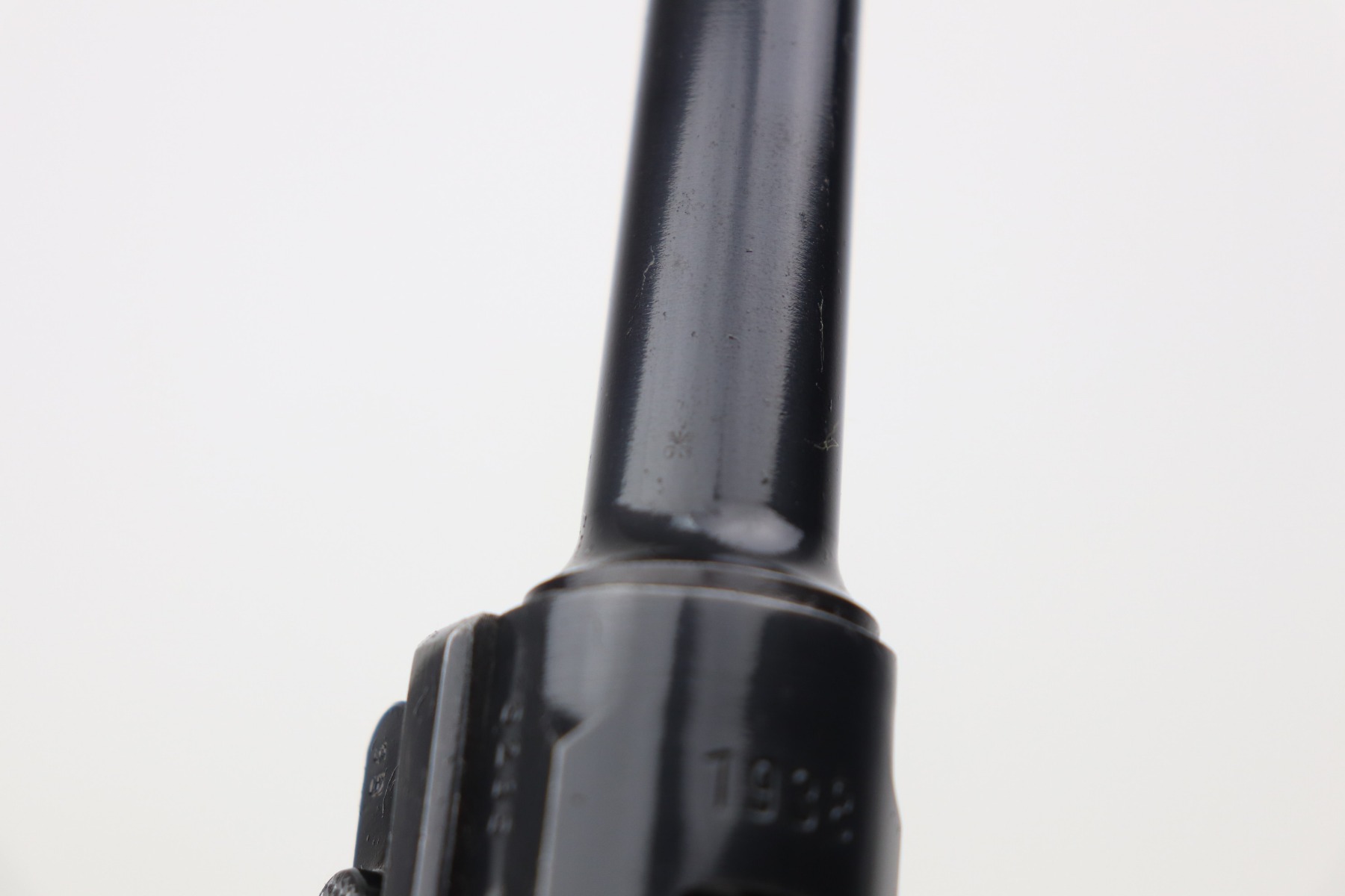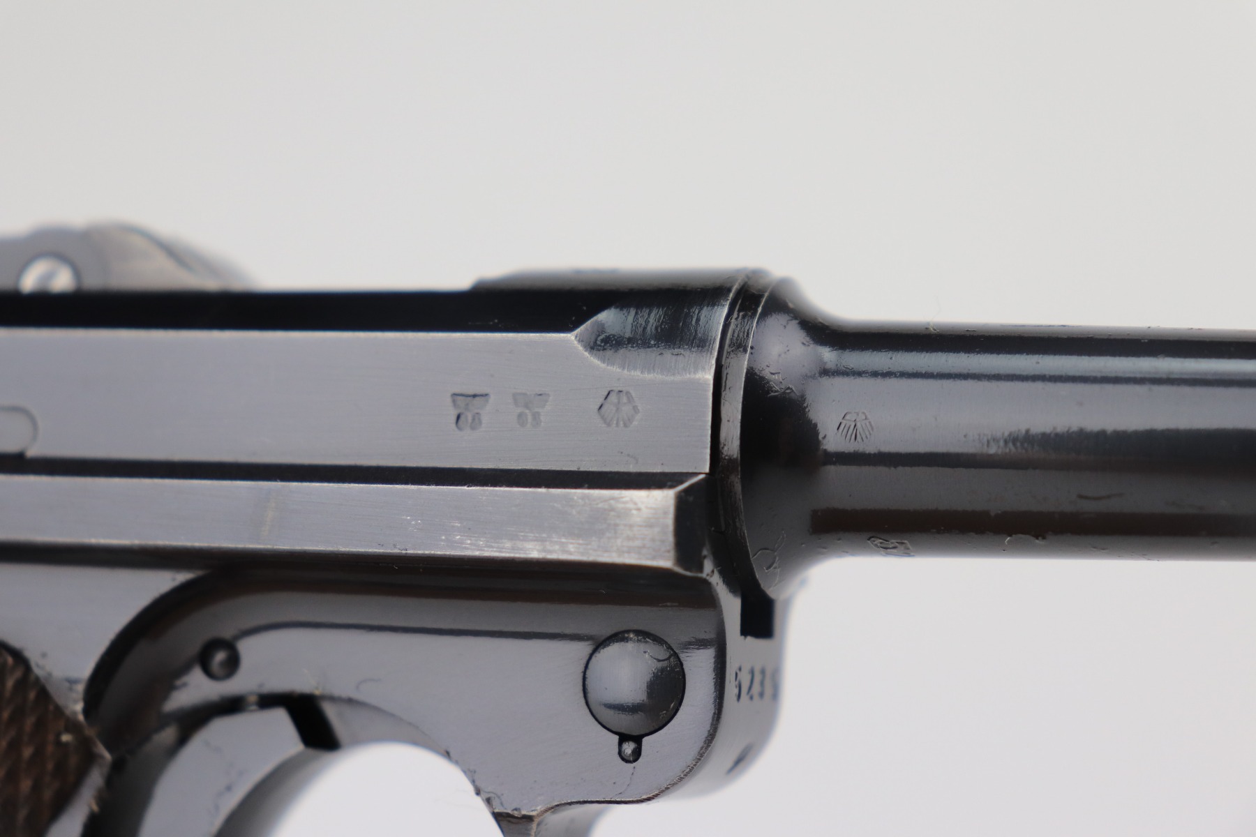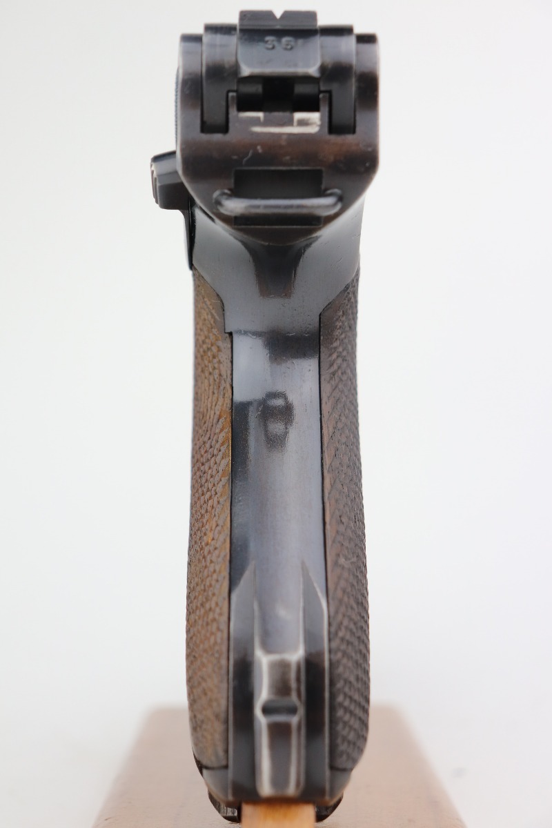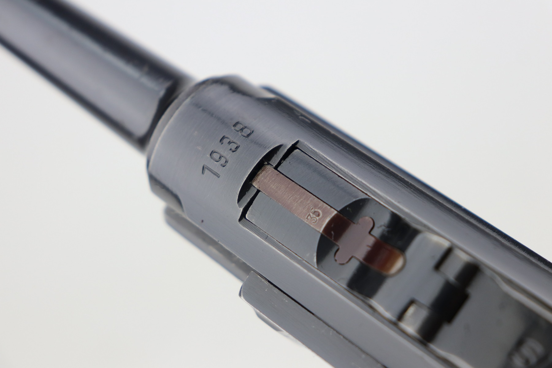 3/19/21 – This is an excellent example of a Mauser Luger rig issued to the Nazi military in 1938. The gun is all matching and has the proper “Eagle 63” military proofs. The rig comes with an excellent 1940-dated holster and two period-correct mismatched magazines. The gun has retained about 95% of its original finish. There is light spotty wear on the front strap and minor wear around the muzzle, on the side plate, and on the front edges of the frame. Comes with excellent matching grips. The bore has good rifling with minor pin-pricking throughout. The lift strap on the holster is missing.