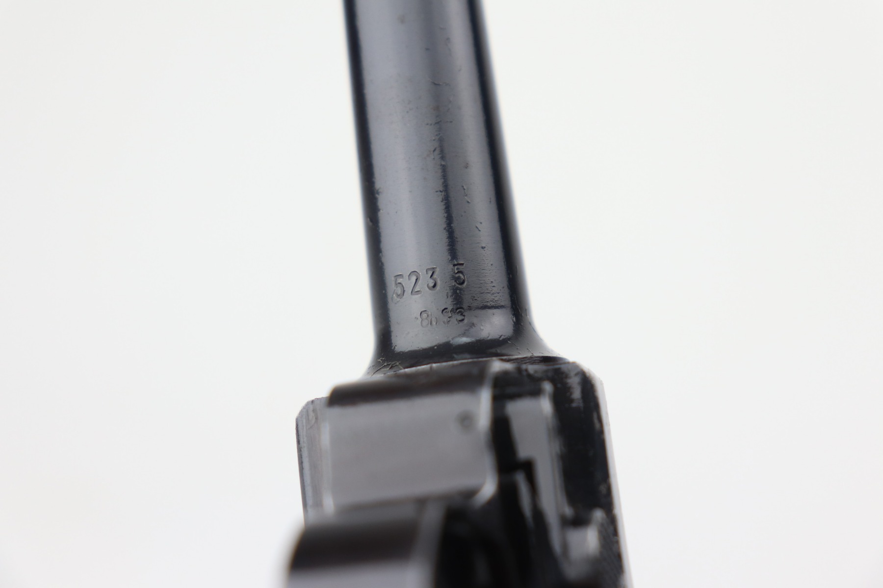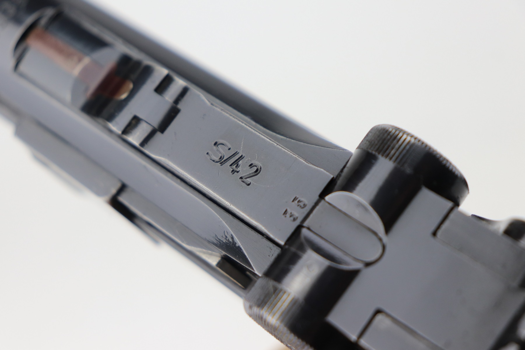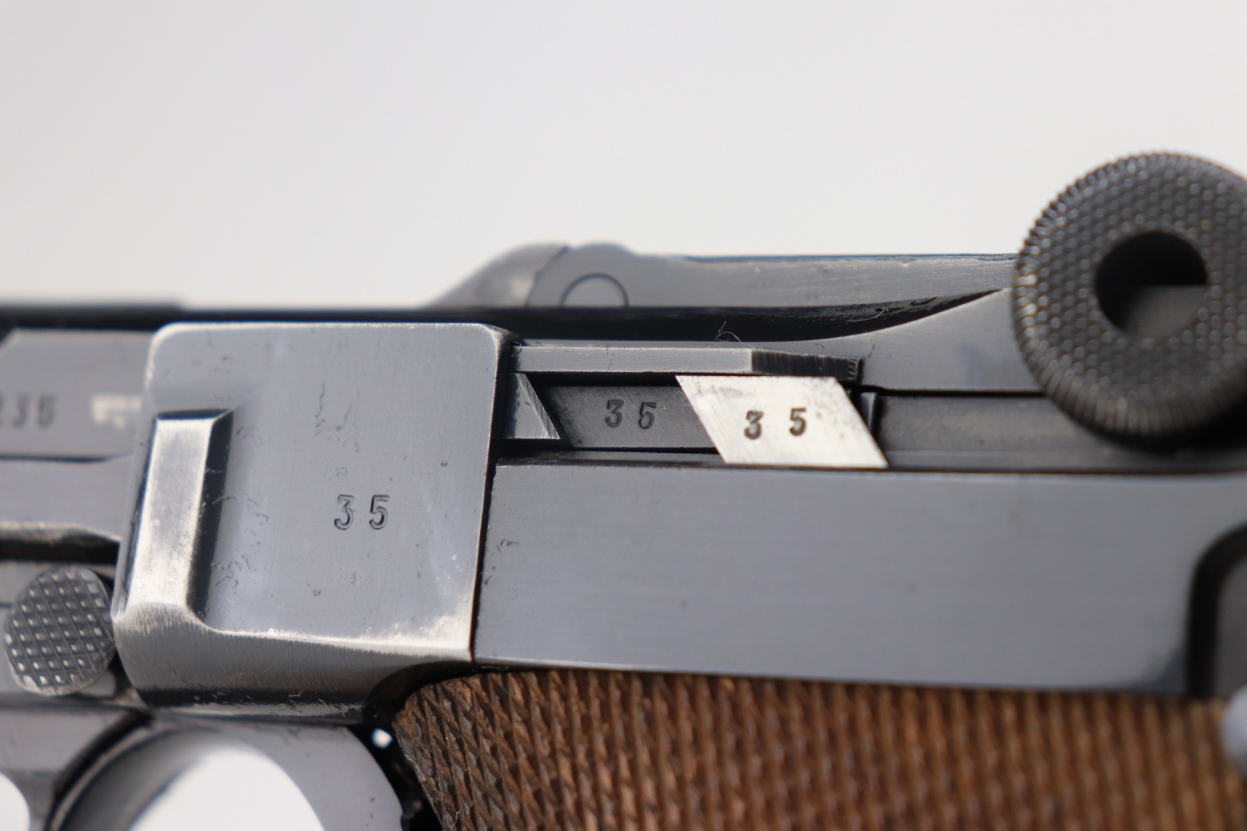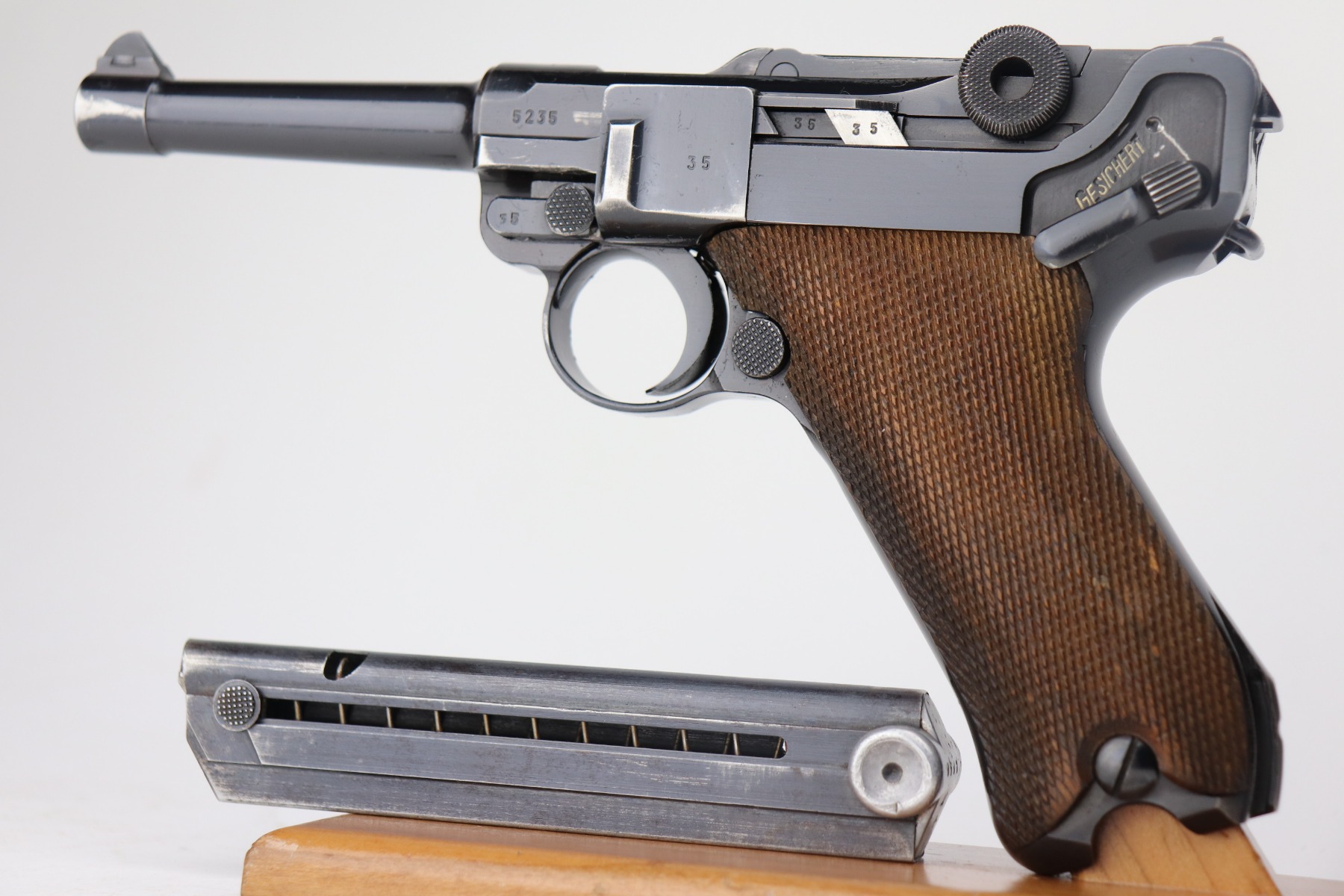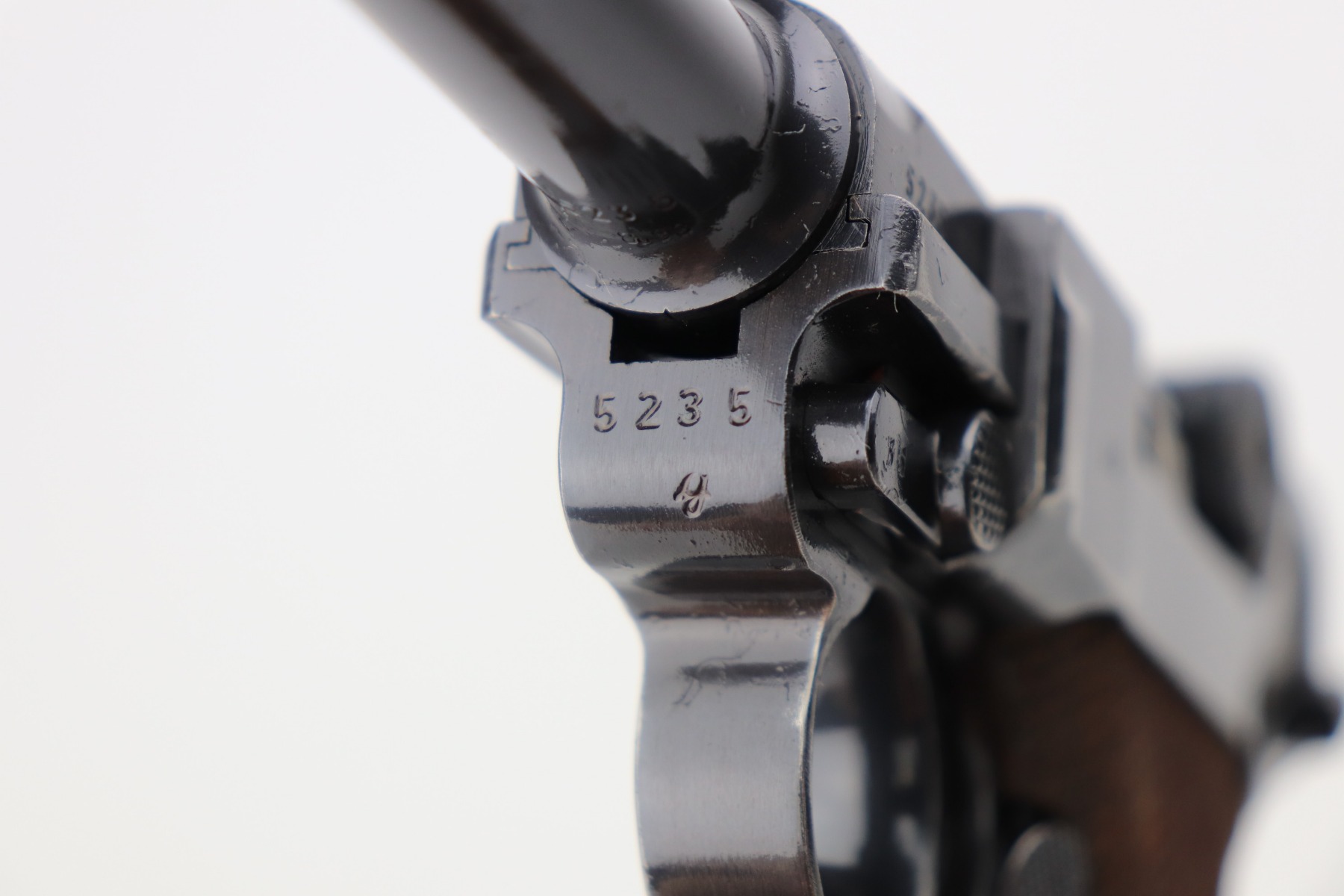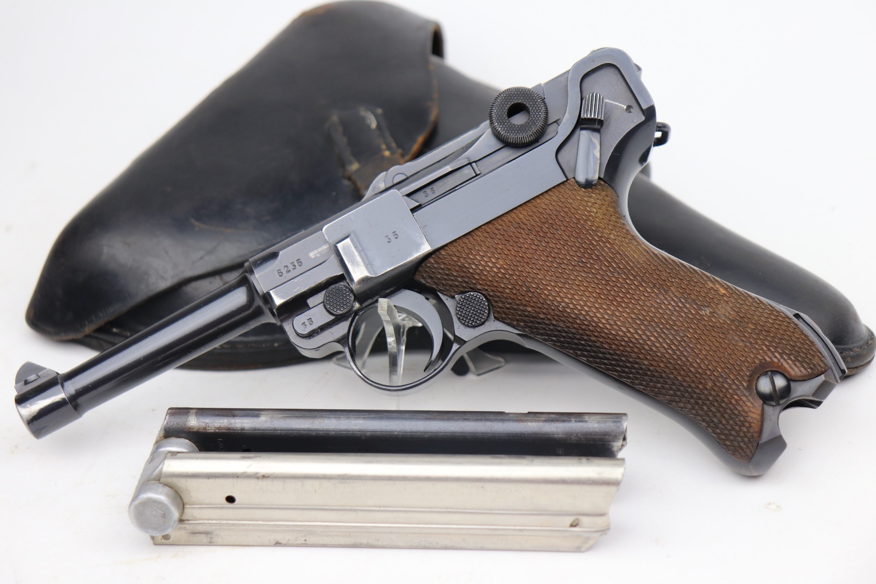3/19/21 – This is an excellent example of a Mauser Luger rig issued to the Nazi military in 1938. The gun is all matching and has the proper “Eagle 63” military proofs. The rig comes with an excellent 1940-dated holster and two period-correct mismatched magazines. The gun has retained about 95% of its original finish. There is light spotty wear on the front strap and minor wear around the muzzle, on the side plate, and on the front edges of the frame. Comes with excellent matching grips. The bore has good rifling with minor pin-pricking throughout. The lift strap on the holster is missing.