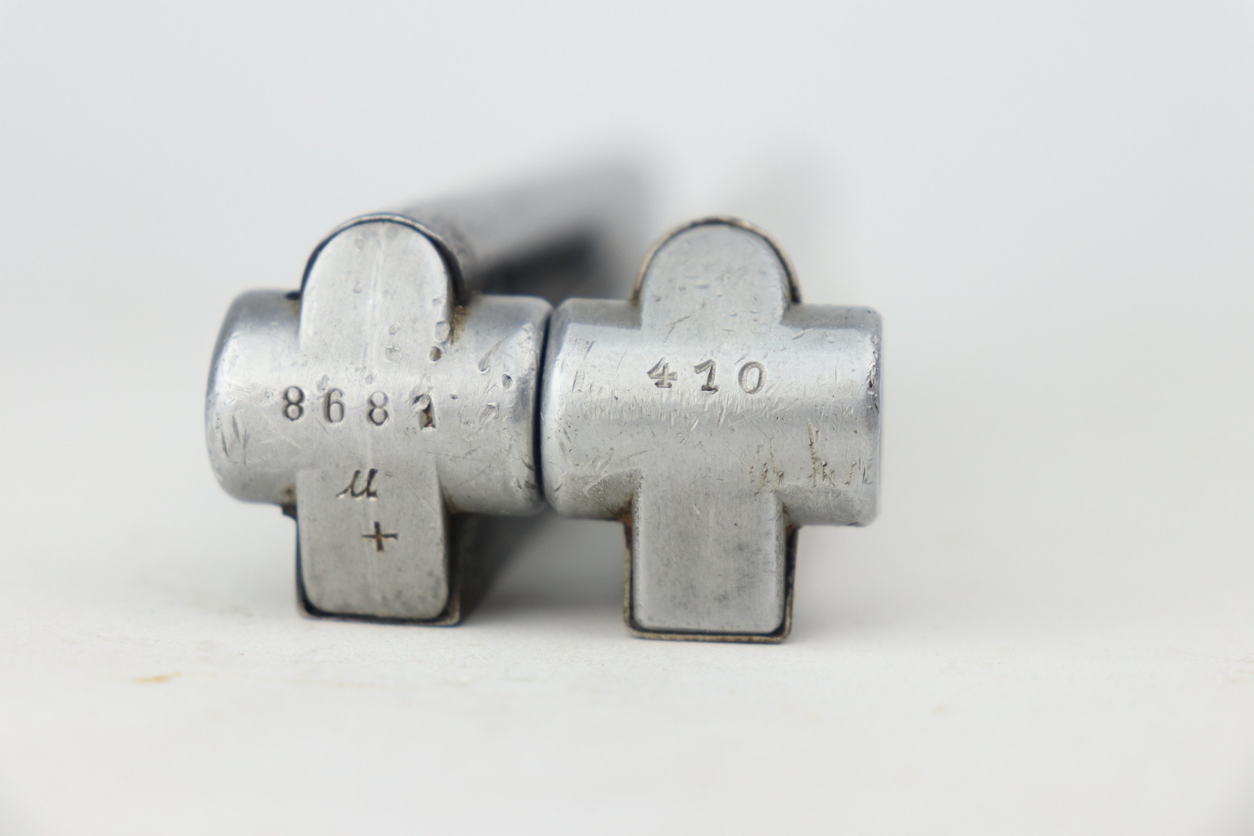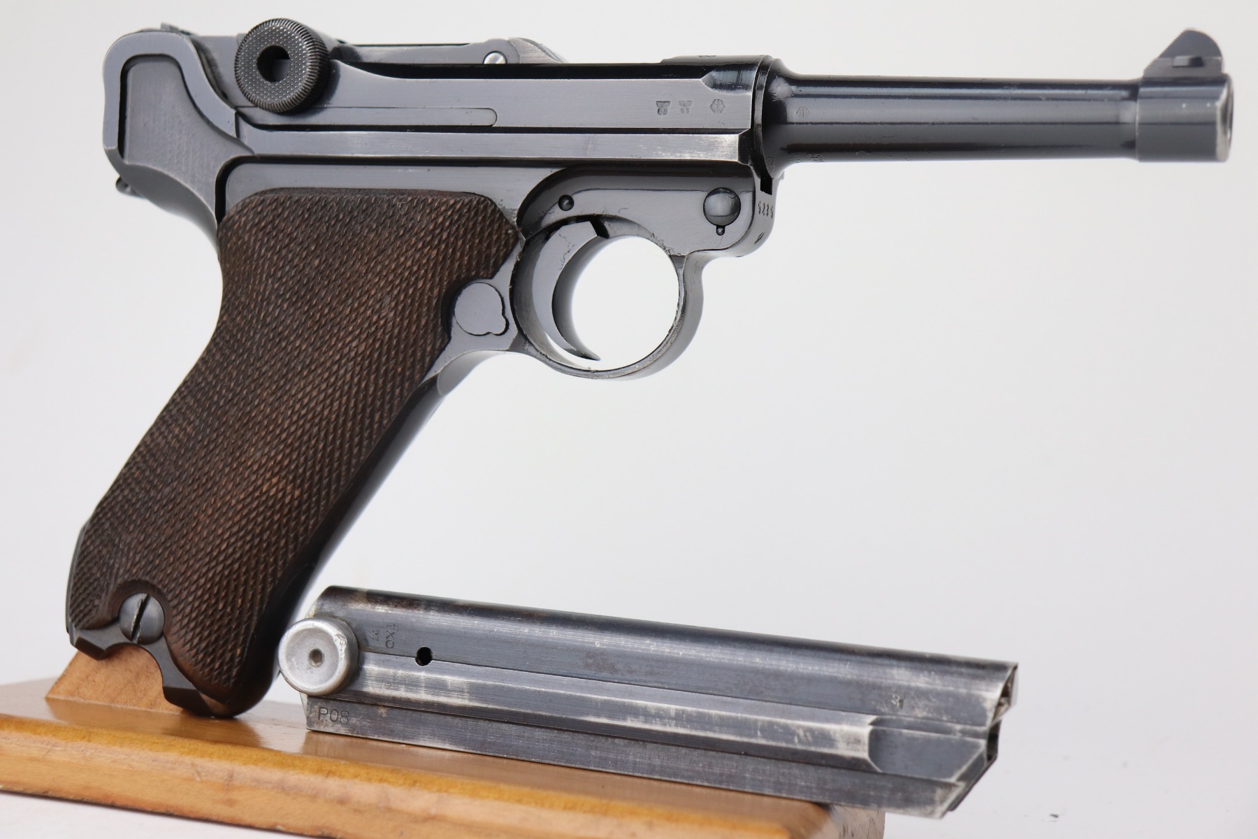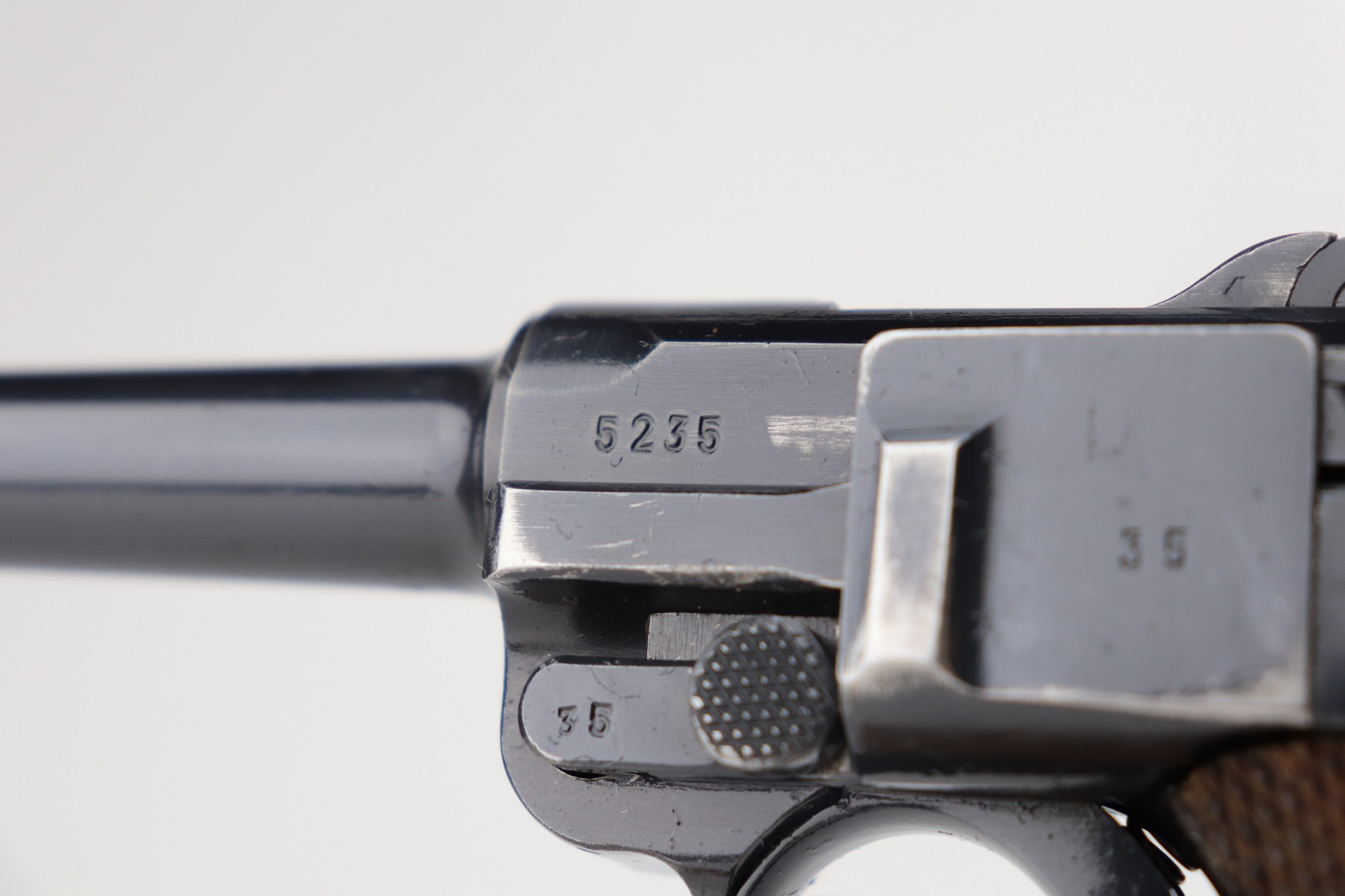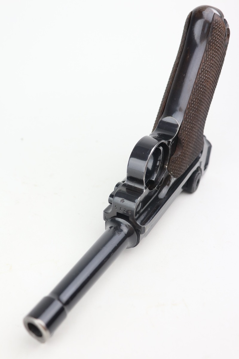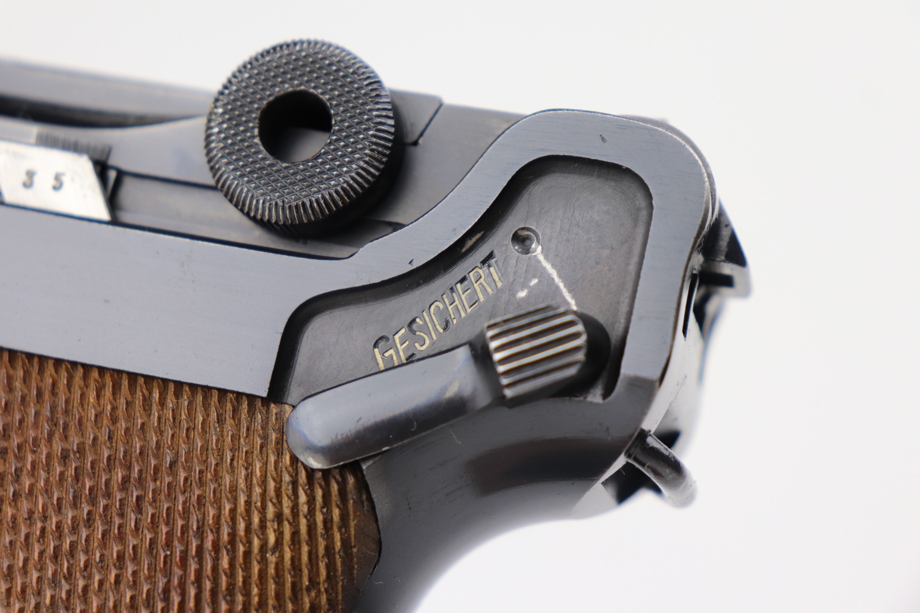 3/19/21 – This is an excellent example of a Mauser Luger rig issued to the Nazi military in 1938. The gun is all matching and has the proper “Eagle 63” military proofs. The rig comes with an excellent 1940-dated holster and two period-correct mismatched magazines. The gun has retained about 95% of its original finish. There is light spotty wear on the front strap and minor wear around the muzzle, on the side plate, and on the front edges of the frame. Comes with excellent matching grips. The bore has good rifling with minor pin-pricking throughout. The lift strap on the holster is missing.