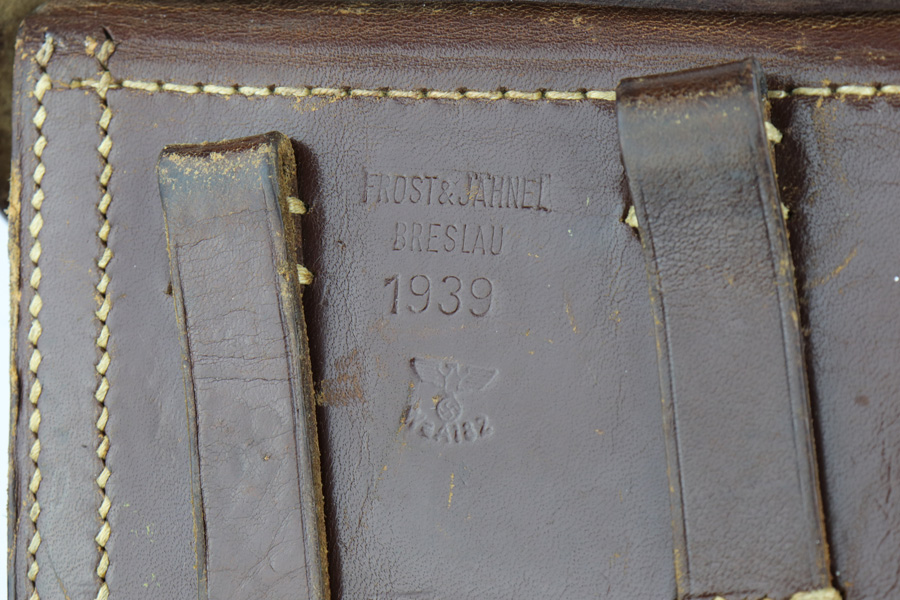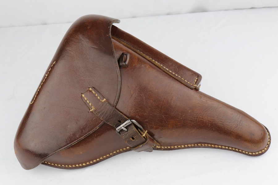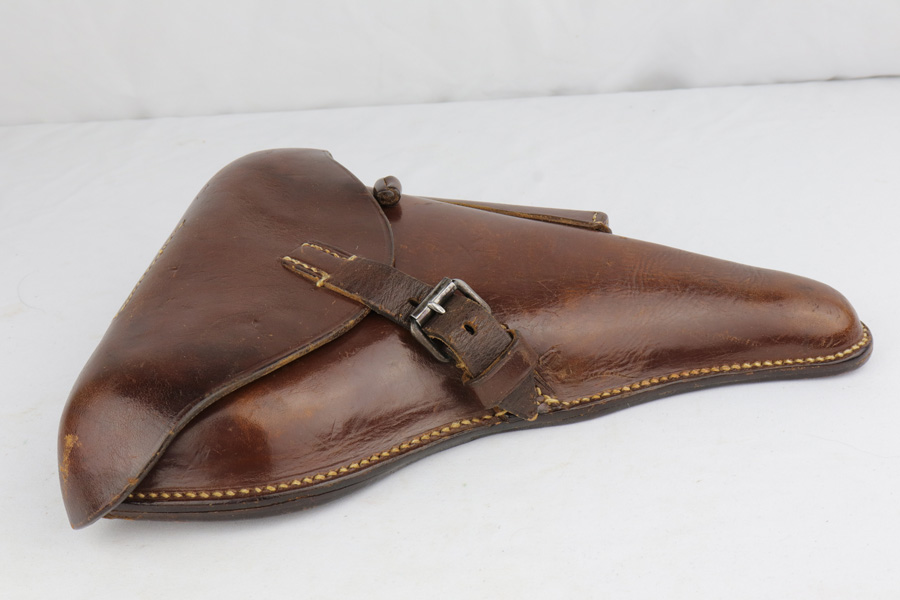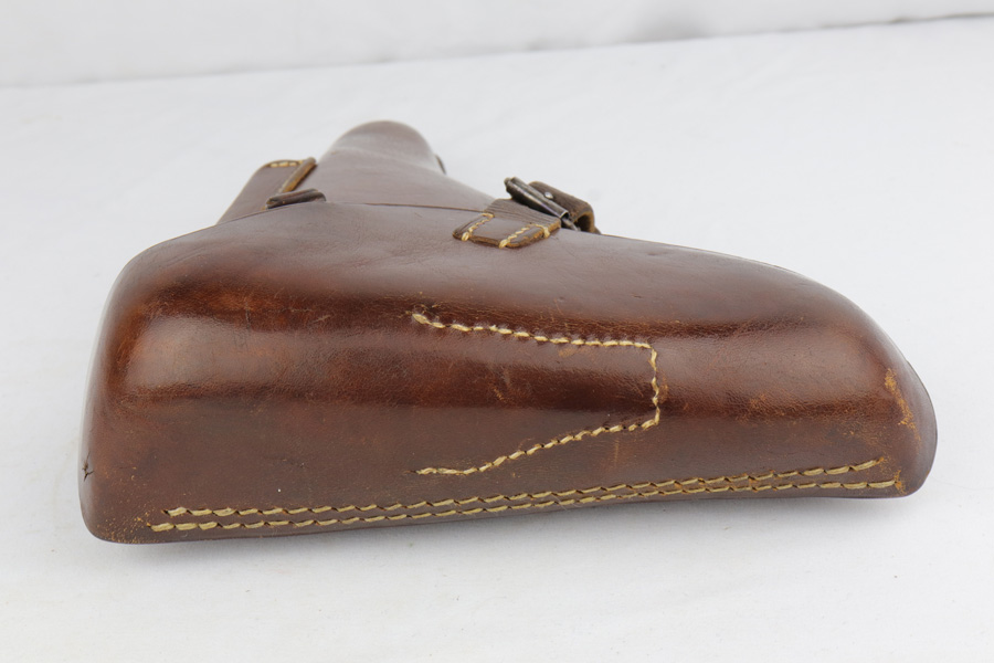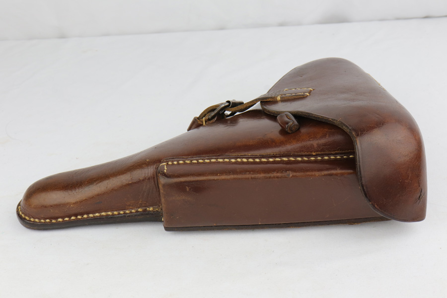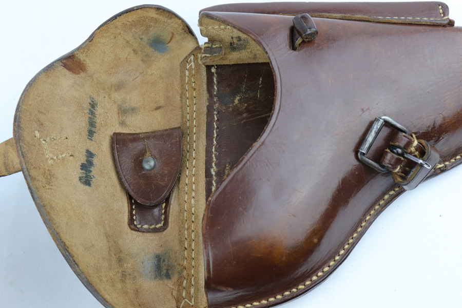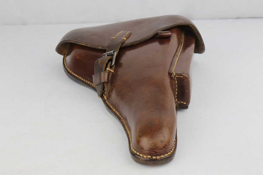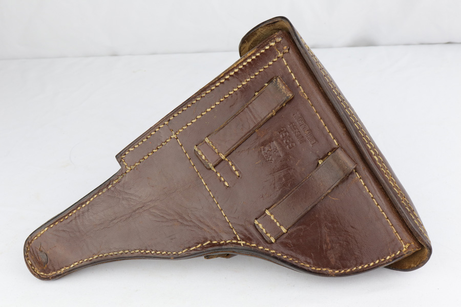 3/25/19 – This is a beautiful 1939 dated brown Luger holster from WW2. The holster is stamped on the back leather with a date and maker stamp along with a waffen proof. These are all crisp, original stamps. The leather is strong and clean – there’s a line of writing that’s been crossed out on the interior but this is relatively small. Excellent, all original stitching is in tact. Very nice collectible holster.