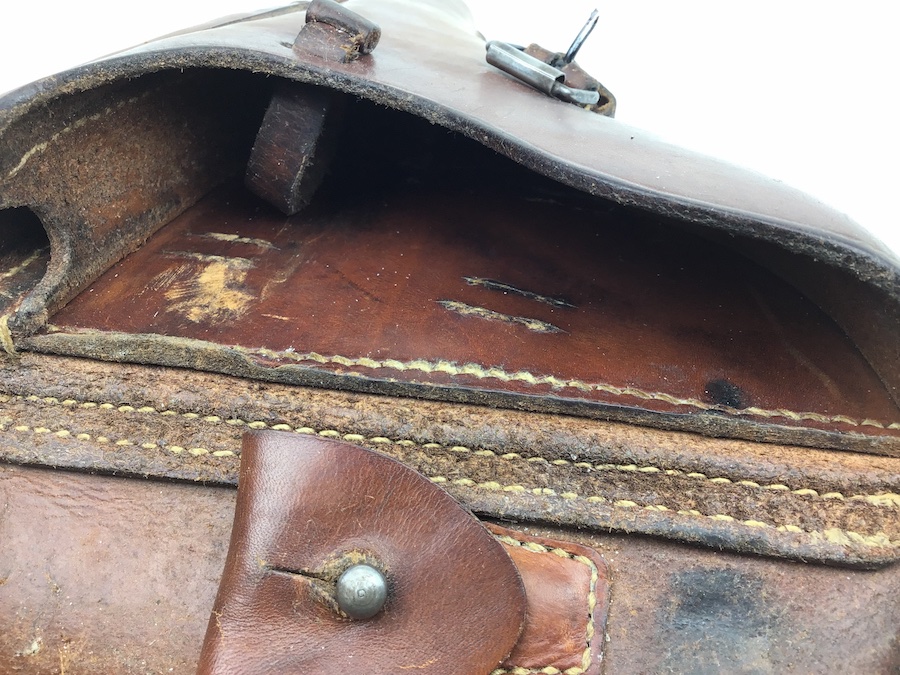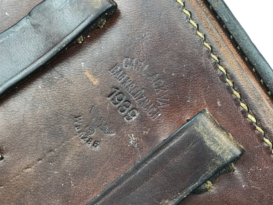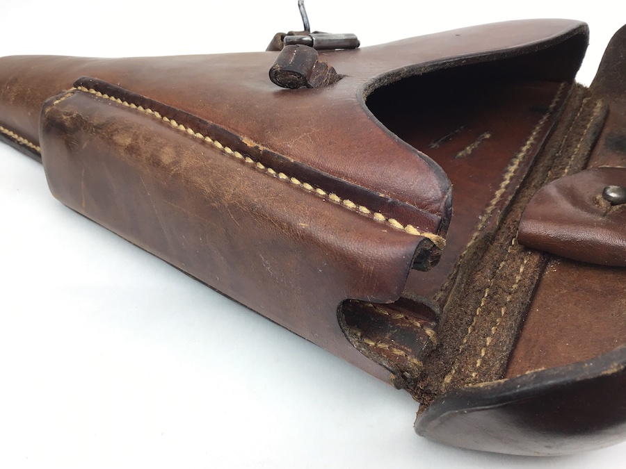3/5/20 – This is a beautiful, brown, 1939 dated Luger holster from WW2. The holster is stamped on the back leather with a date and “CARL ACKVA” maker stamp along with a waffen proof. These are all crisp, original stamps. The leather is strong and clean – there’s a name stamped into the inside of the closure flap but it is relatively not noticeable. Excellent, all original stitching is in tact. Very nice collectible holster.