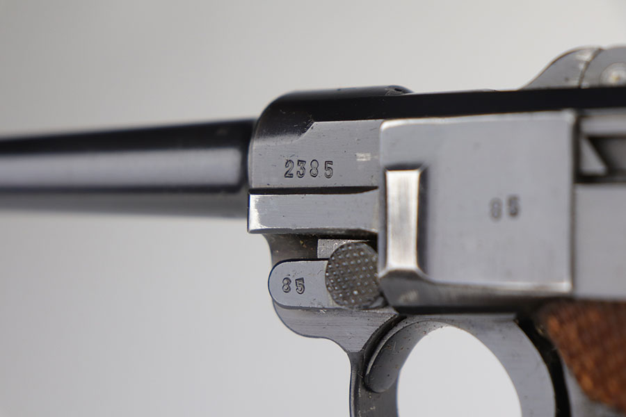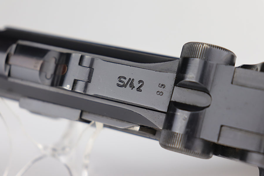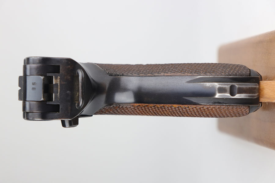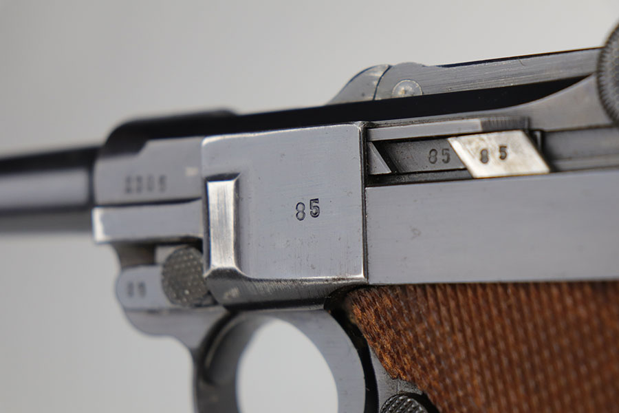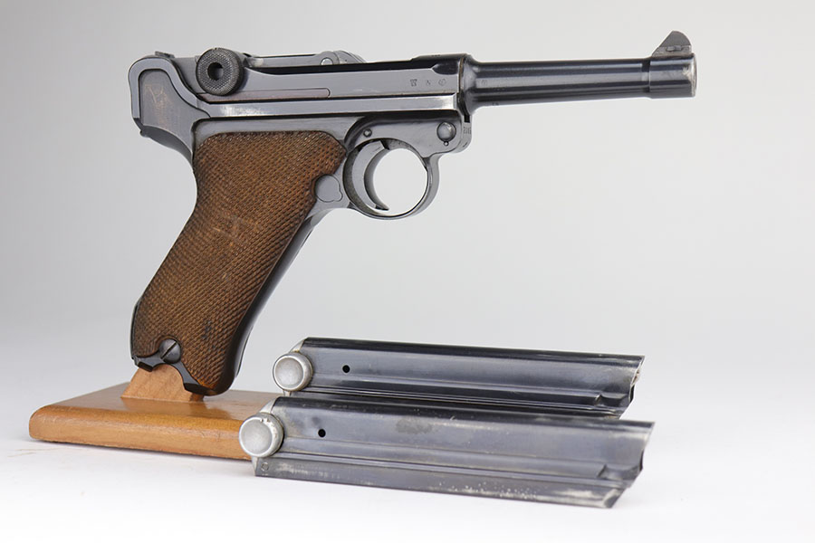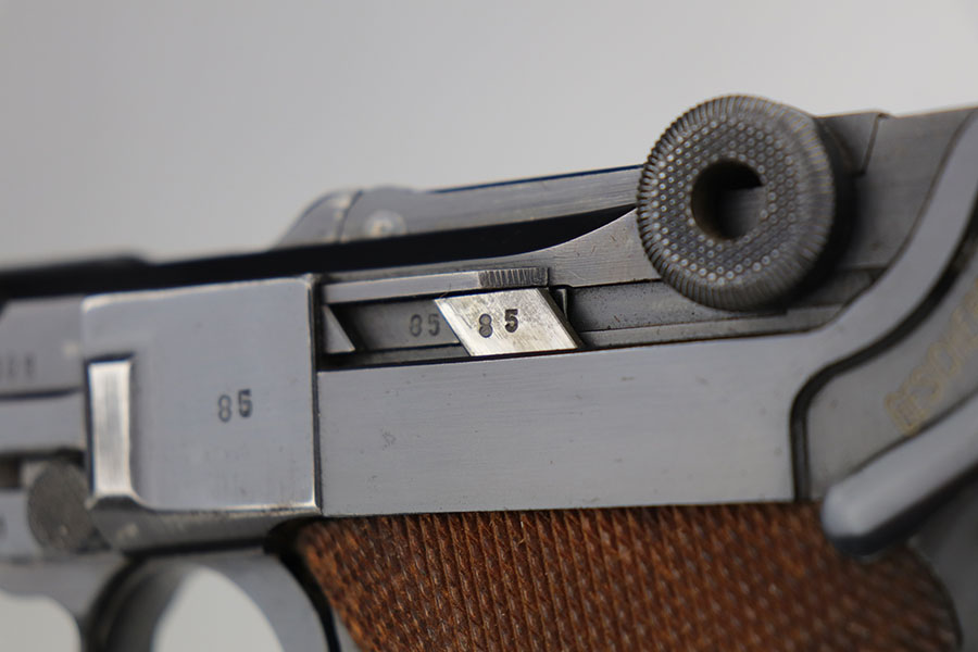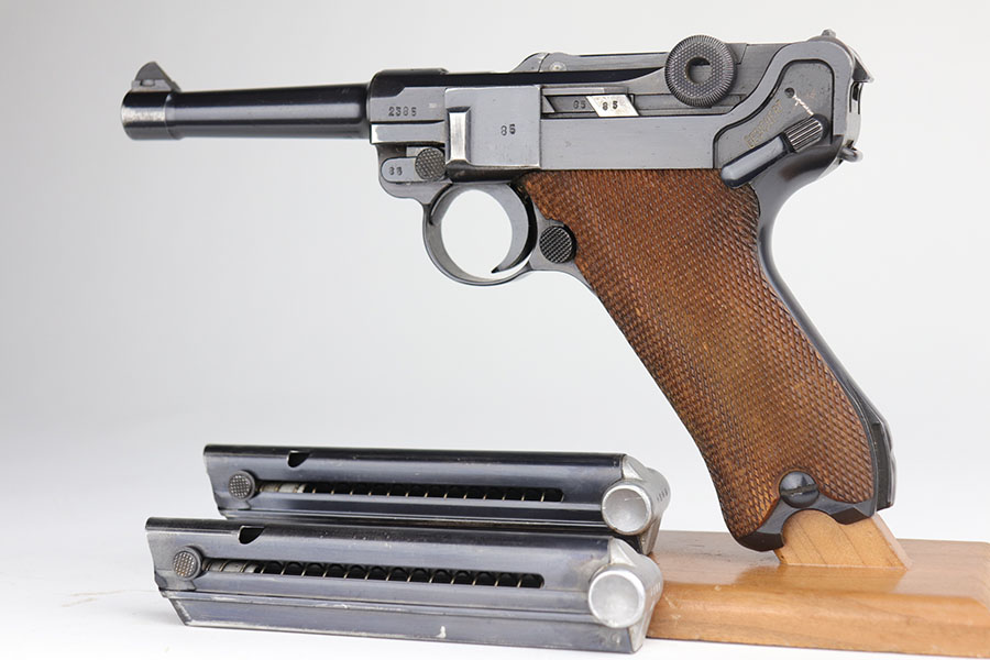 9/9/20 – This is an excellent 1939 Nazi Mauser Luger with about 95+% of the original blue remaining. It’s all matching, including the original grips. Magazine is period original but mismatched. There’s standard high edge wear on muzzle, sideplate and bottom of front strap. Otherwise, all in excellent condition. Terrific bore. Grips are minty except the letter ‘H’ was scratched into the right panel. NOTE: The listing only comes with the one magazine, numbered 6309.