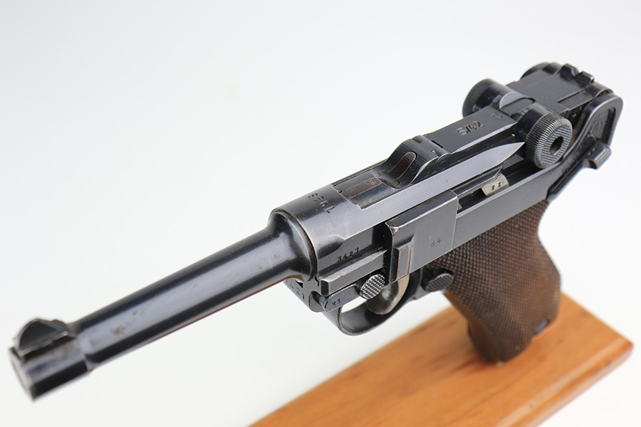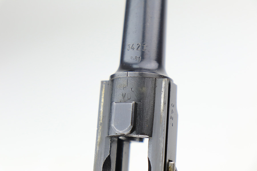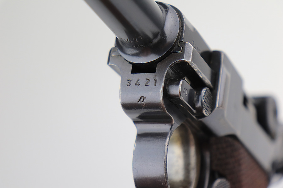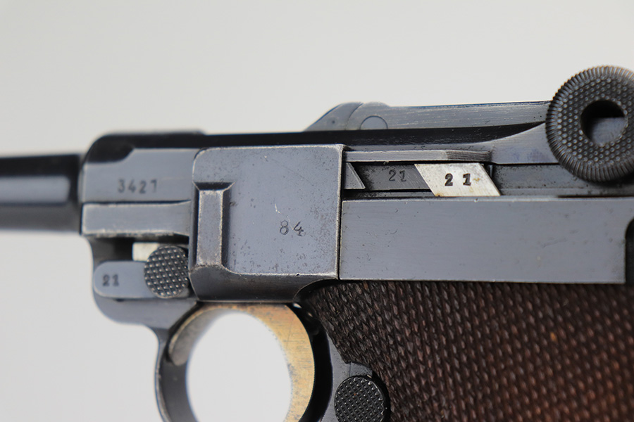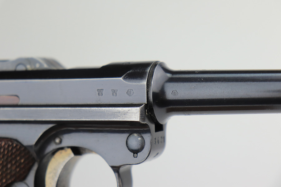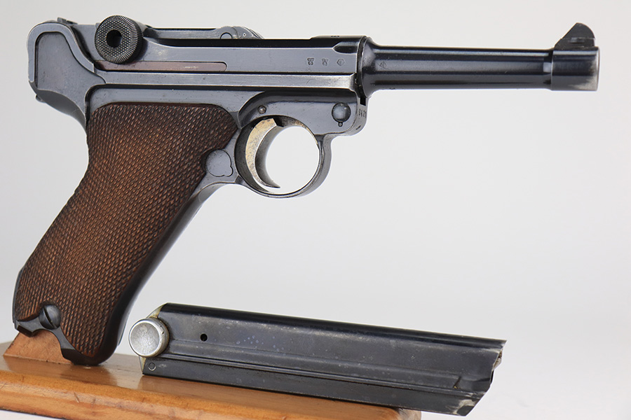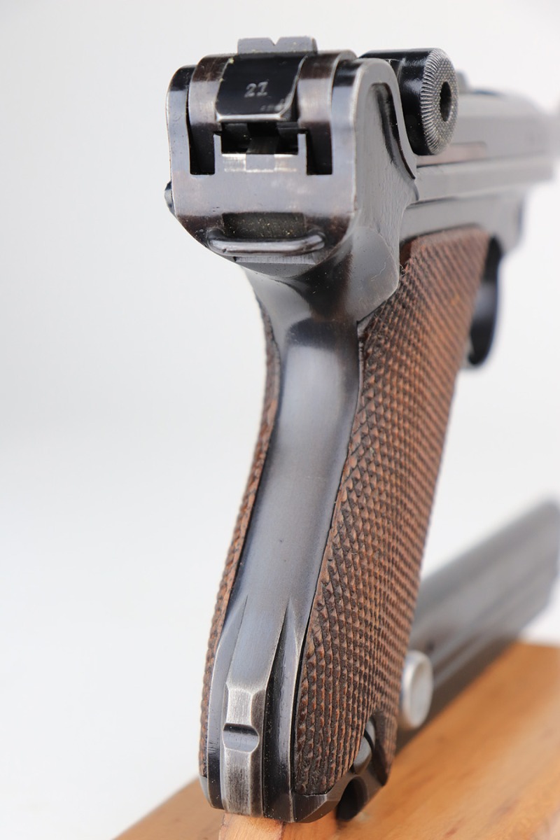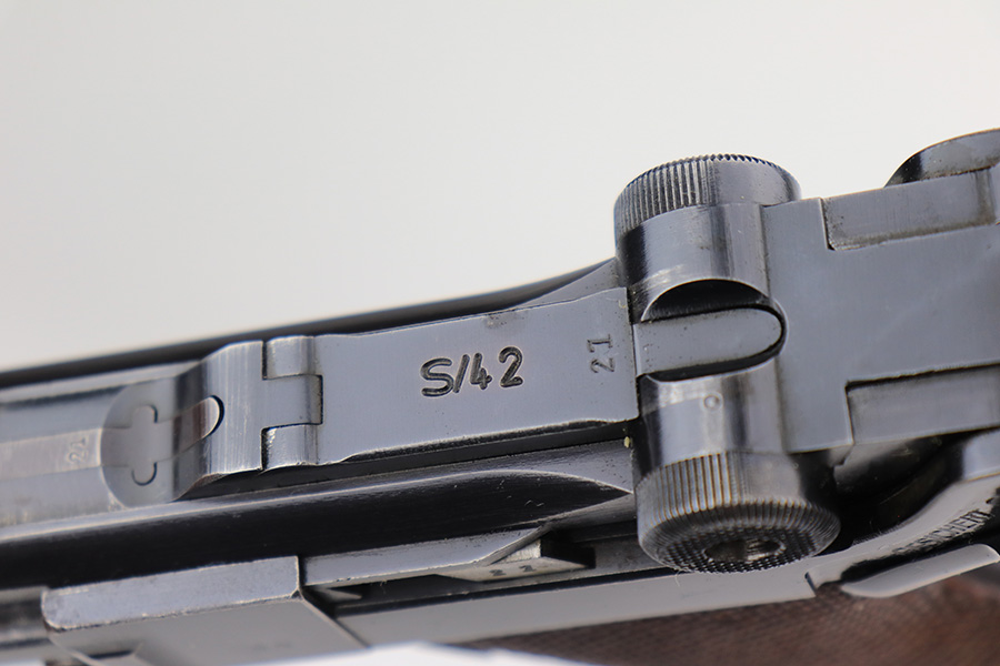 4/15/22 – This is an excellent example of a Mauser Luger issued to the Nazi military in 1939. The gun is all matching except for the side plate and trigger. You’ll notice the trigger is too early for this gun, as it has a straw-colored finish. In any case, the gun has the proper “S/42” factory code on the toggle and the proper “Eagle 63” Nazi military acceptance proofs. It has retained about 96-97% of its original finish. There are just hints of thinning on the grip straps and areas of very minor wear on the side plate, side rails, and around the muzzle. A couple of tiny dots of oxidation on the barrel. Comes with an excellent set of un-numbered wood grips and a period-correct “Eagle 83” proofed magazine that is not matching to the gun. The bore has good rifling, but there is pin-pricking throughout.
