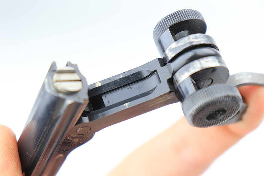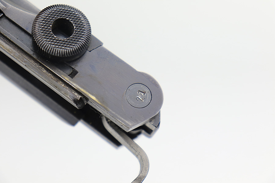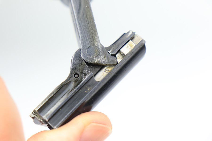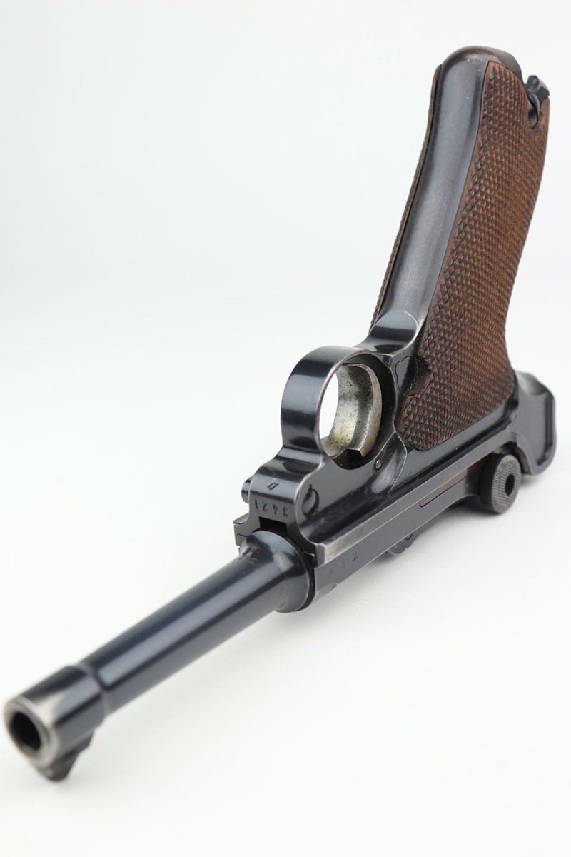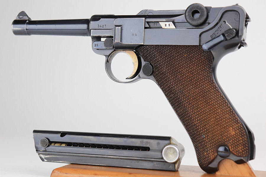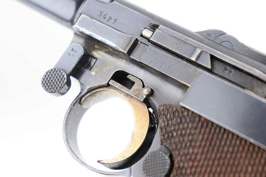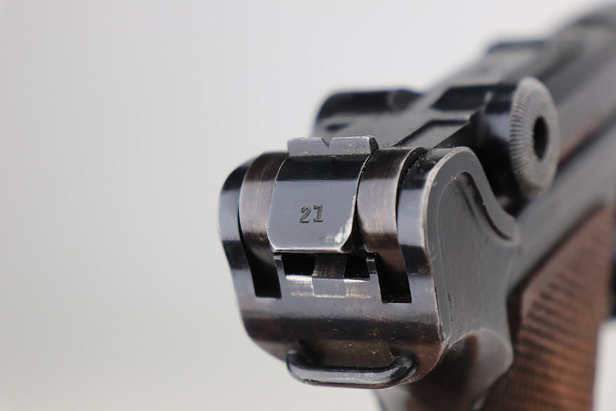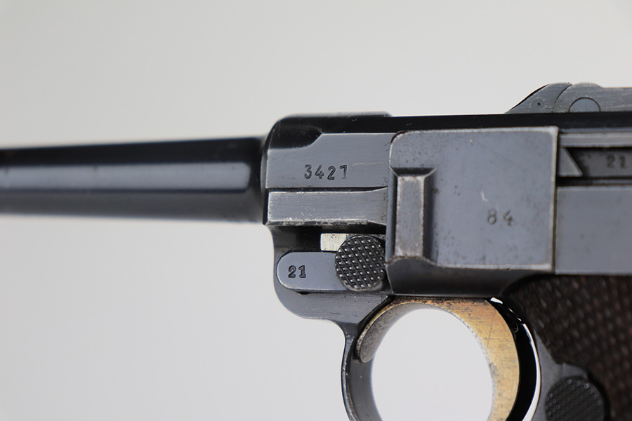 4/15/22 – This is an excellent example of a Mauser Luger issued to the Nazi military in 1939. The gun is all matching except for the side plate and trigger. You’ll notice the trigger is too early for this gun, as it has a straw-colored finish. In any case, the gun has the proper “S/42” factory code on the toggle and the proper “Eagle 63” Nazi military acceptance proofs. It has retained about 96-97% of its original finish. There are just hints of thinning on the grip straps and areas of very minor wear on the side plate, side rails, and around the muzzle. A couple of tiny dots of oxidation on the barrel. Comes with an excellent set of un-numbered wood grips and a period-correct “Eagle 83” proofed magazine that is not matching to the gun. The bore has good rifling, but there is pin-pricking throughout.