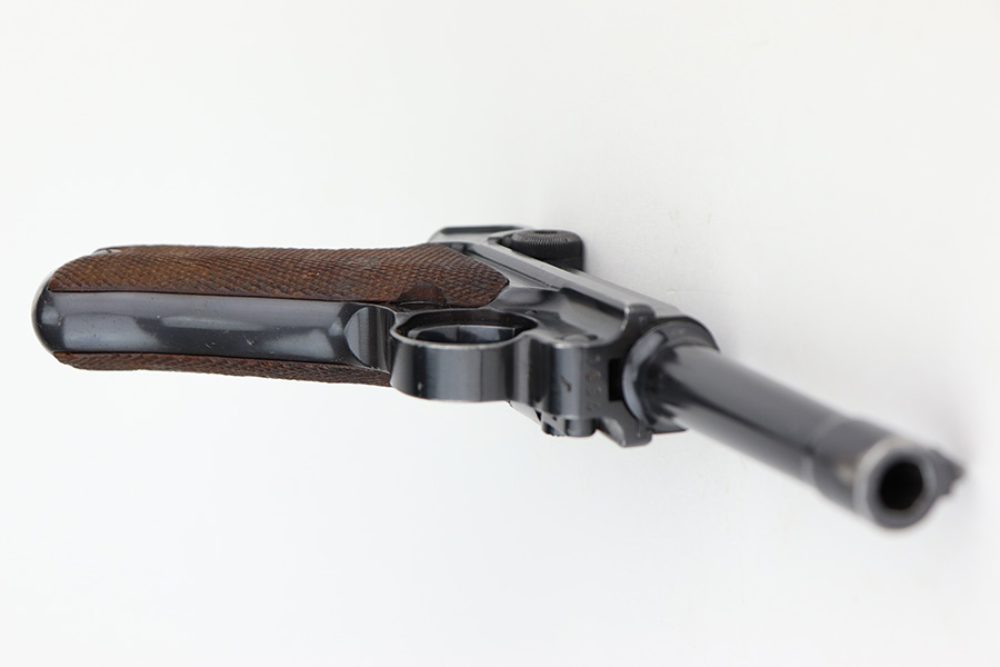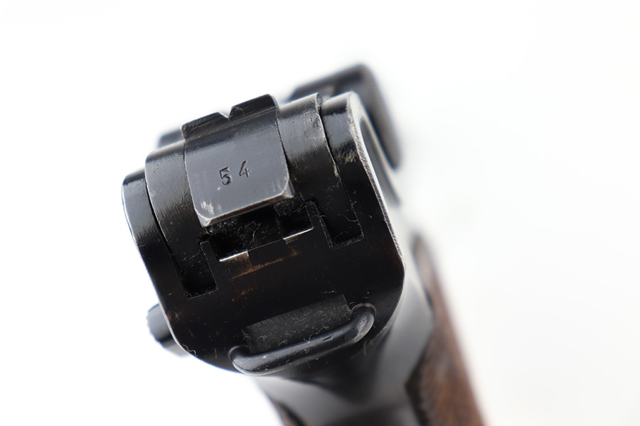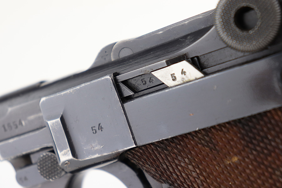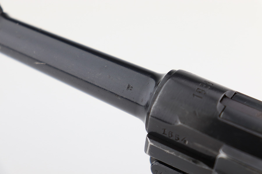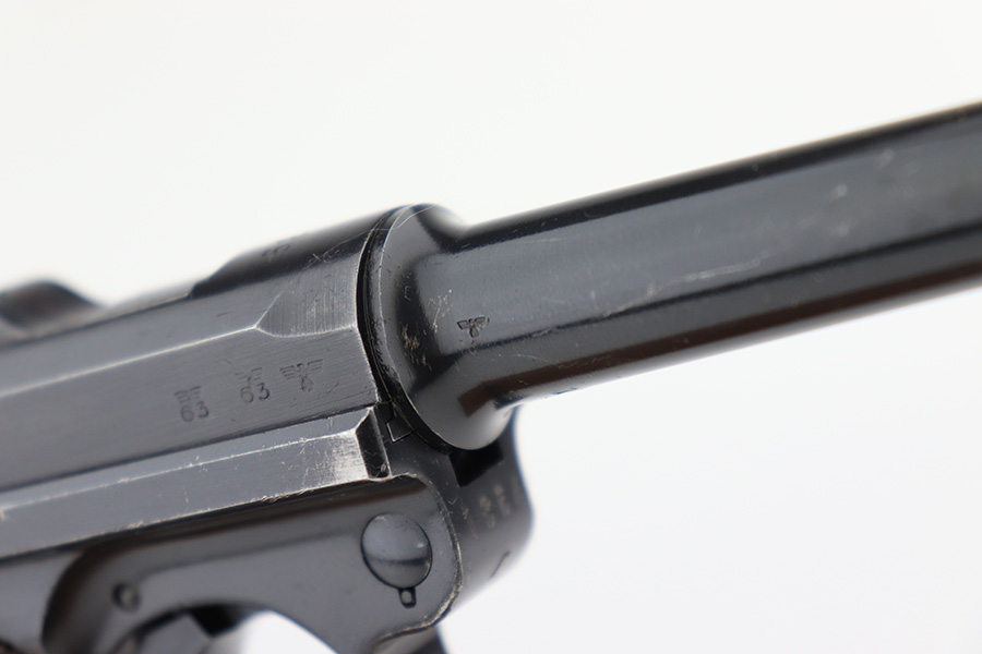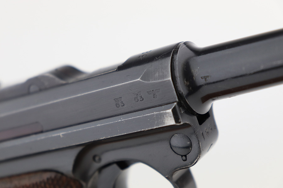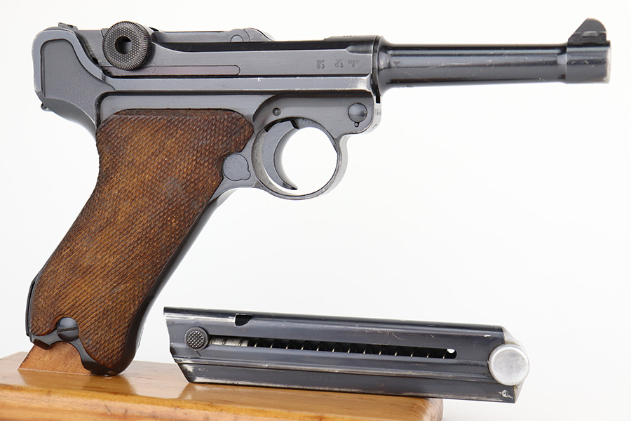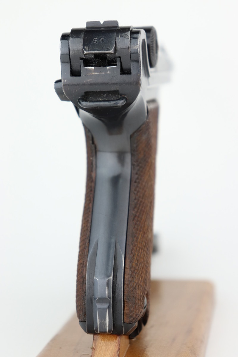 8/15/22 – This is an excellent example of a Mauser Luger issued to the Nazi military in1939. It is all matching and has the proper “Eagle 63” Nazi military acceptance proofs. It has retained about 96% of its original bluing. There is wear on the side plate, front edges of the side rails, and around the muzzle. A couple of tiny dings on the side plate and some tiny scratches along the barrel and on the front strap. Comes with very nice un-numbered wood grips with a couple of small bruises here and there. Comes with a period-correct but mismatched “Eagle 83” proofed magazine. The bore has strong rifling, but there is light freckling throughout.