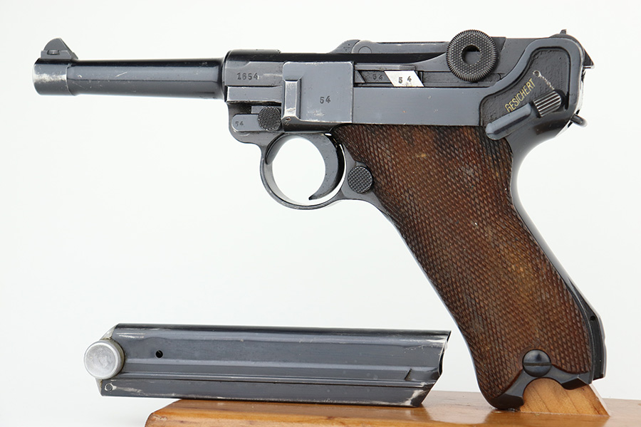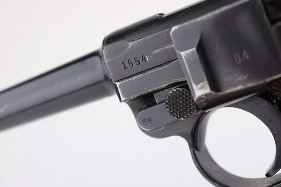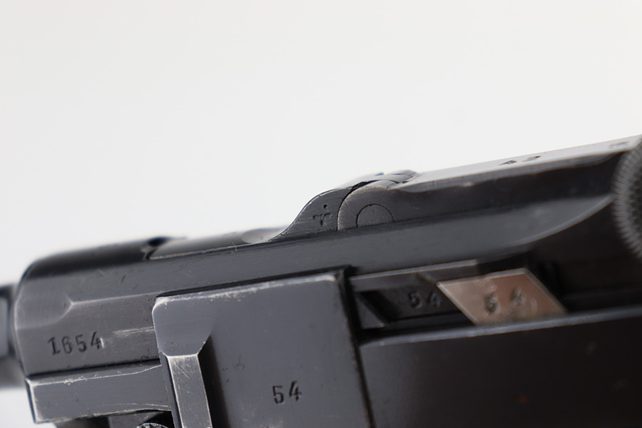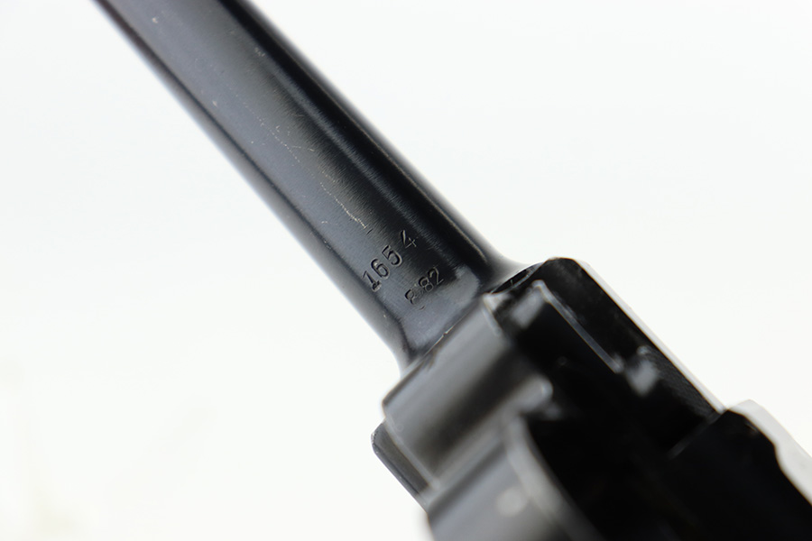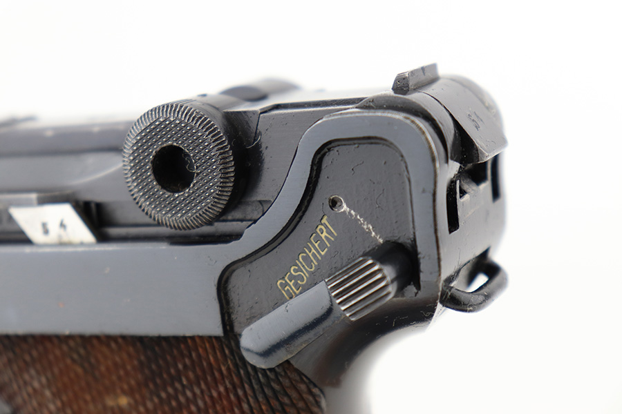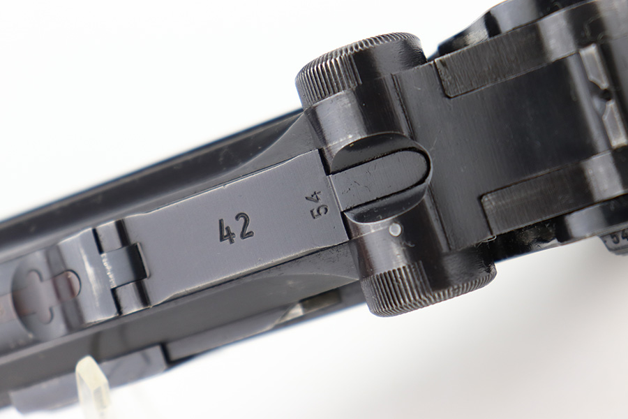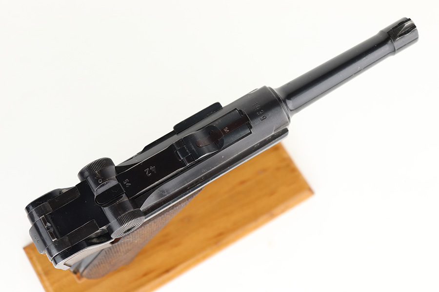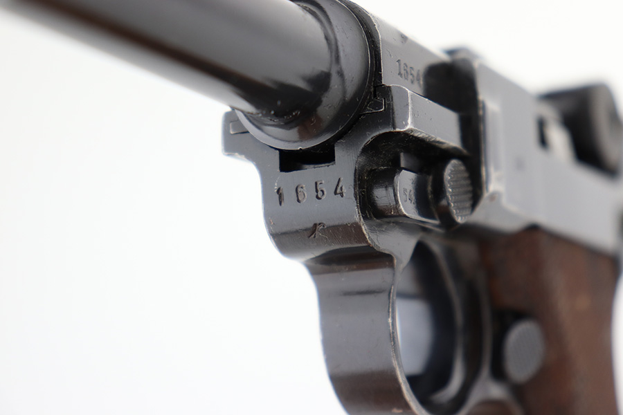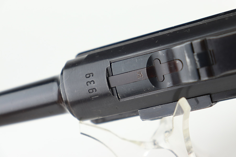 8/15/22 – This is an excellent example of a Mauser Luger issued to the Nazi military in1939. It is all matching and has the proper “Eagle 63” Nazi military acceptance proofs. It has retained about 96% of its original bluing. There is wear on the side plate, front edges of the side rails, and around the muzzle. A couple of tiny dings on the side plate and some tiny scratches along the barrel and on the front strap. Comes with very nice un-numbered wood grips with a couple of small bruises here and there. Comes with a period-correct but mismatched “Eagle 83” proofed magazine. The bore has strong rifling, but there is light freckling throughout.