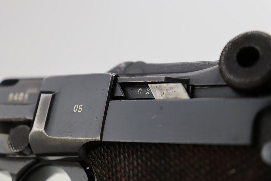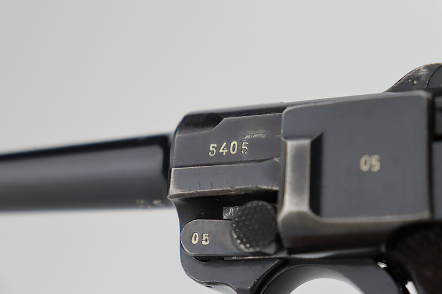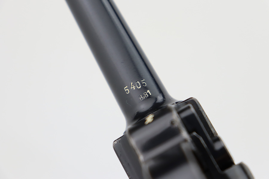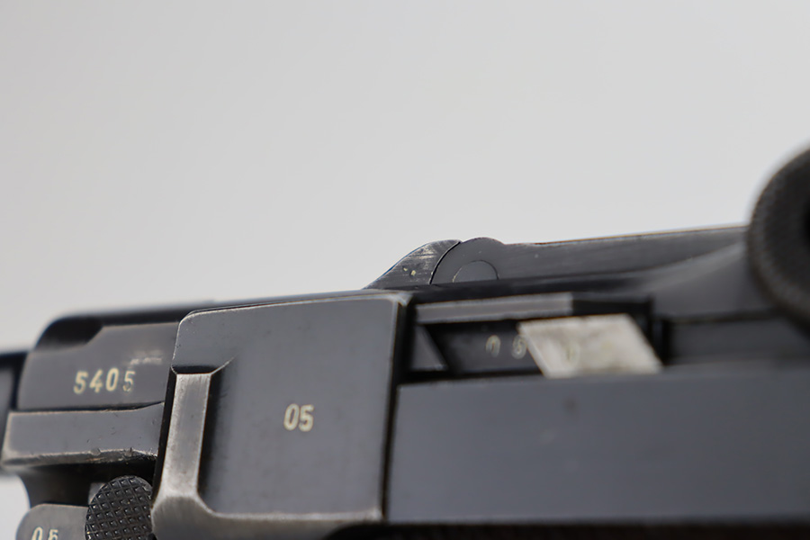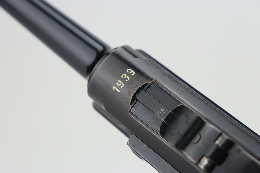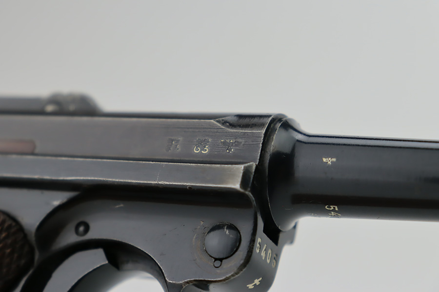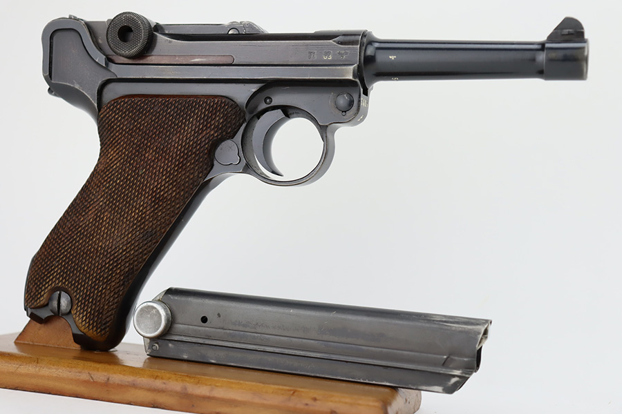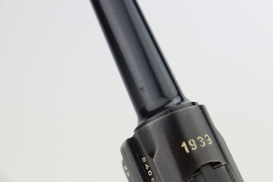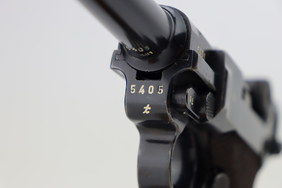 10/10/23 – This is an excellent example of a Mauser Luger issued to the Nazi military in 1939. All matching with the proper “Eagle 63” military acceptance proofs. The bluing rates about 95% with general high edge wear, wear around the muzzle, and some very light brown patina on the straps. Fitted with un-numbered wood grips and comes with a mismatched “Eagle 63” magazine. The bore has good rifling, but there is pin-pricking throughout.