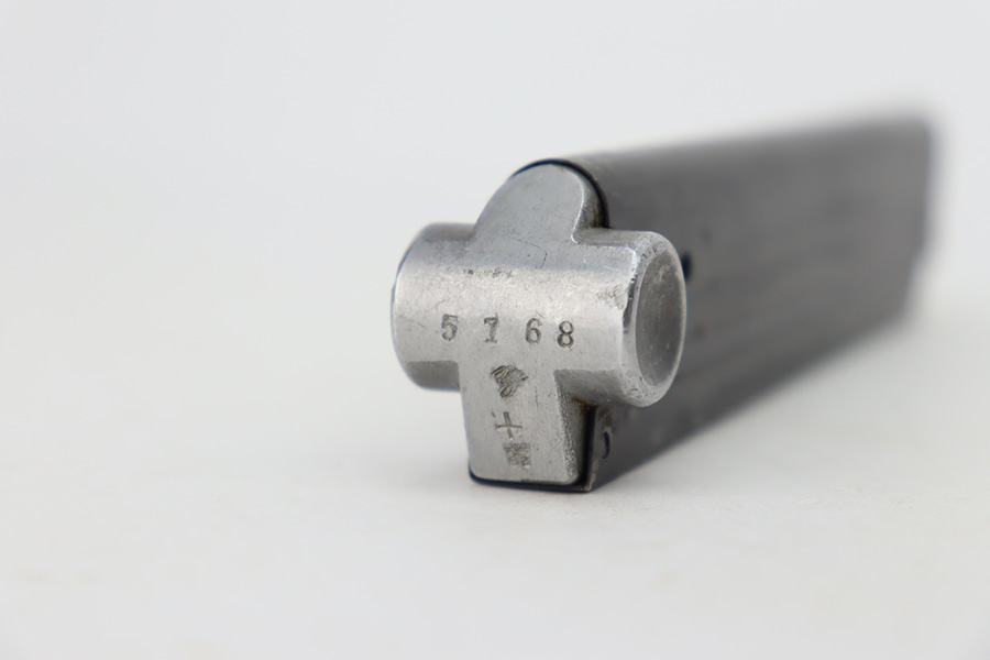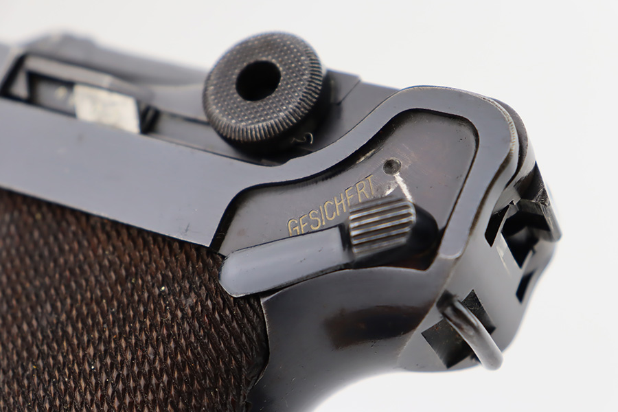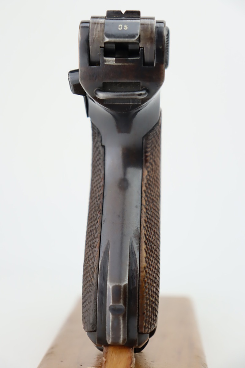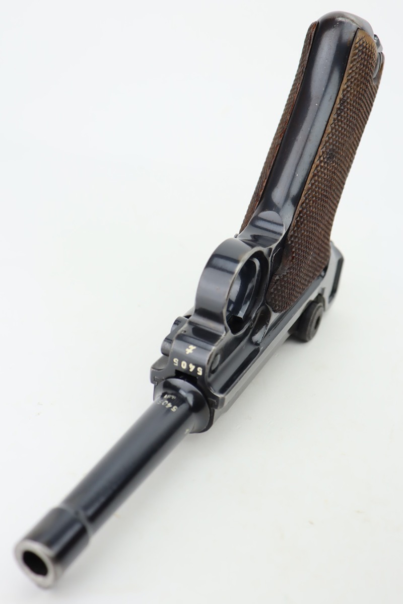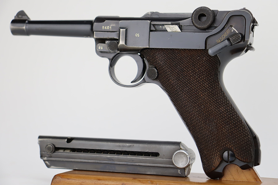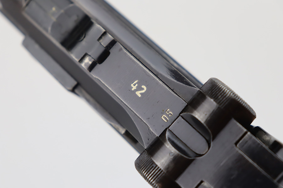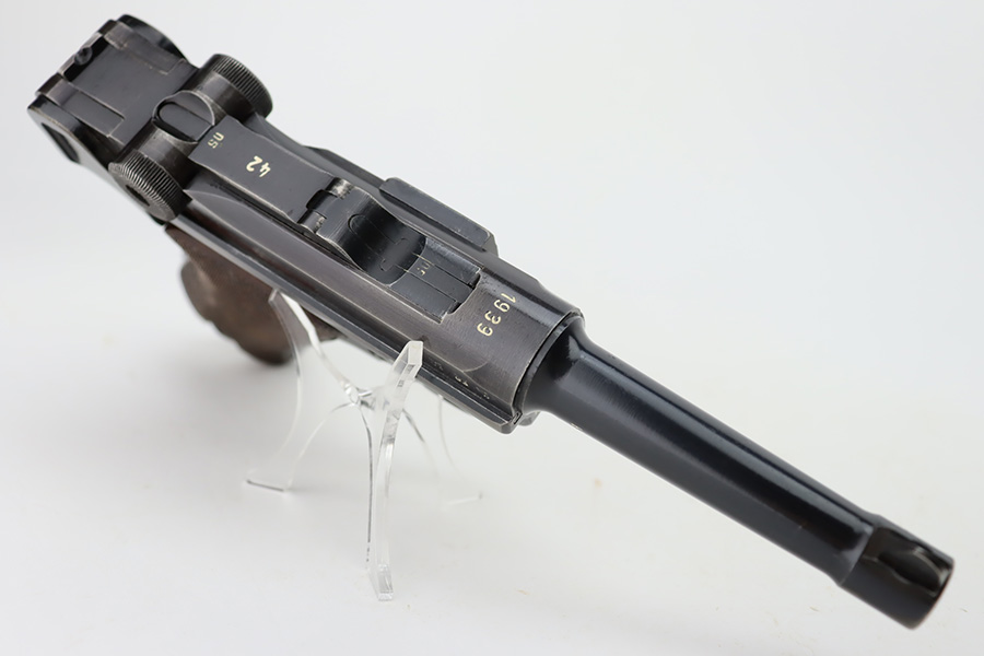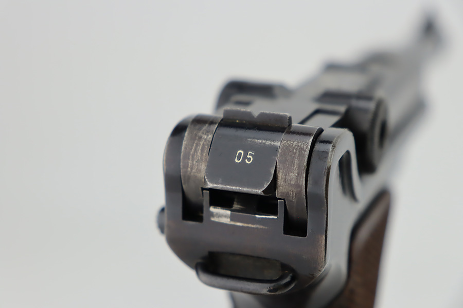 10/10/23 – This is an excellent example of a Mauser Luger issued to the Nazi military in 1939. All matching with the proper “Eagle 63” military acceptance proofs. The bluing rates about 95% with general high edge wear, wear around the muzzle, and some very light brown patina on the straps. Fitted with un-numbered wood grips and comes with a mismatched “Eagle 63” magazine. The bore has good rifling, but there is pin-pricking throughout.