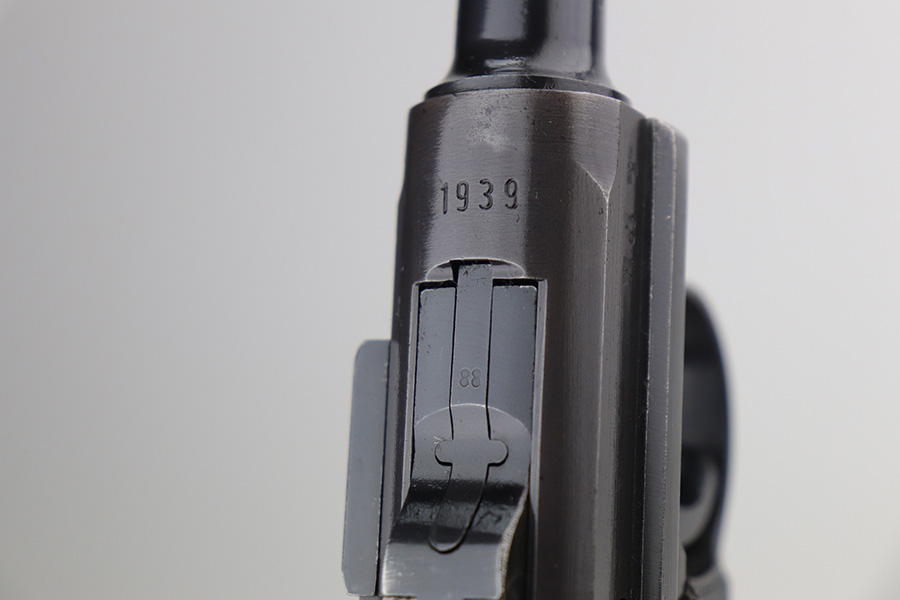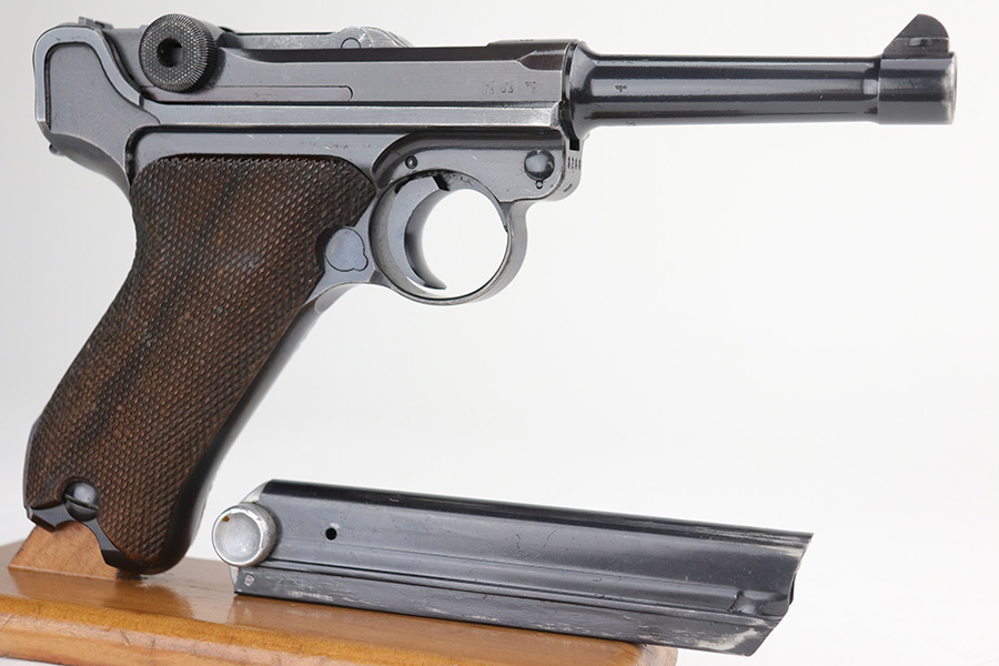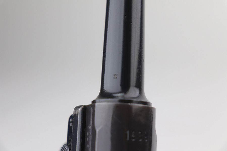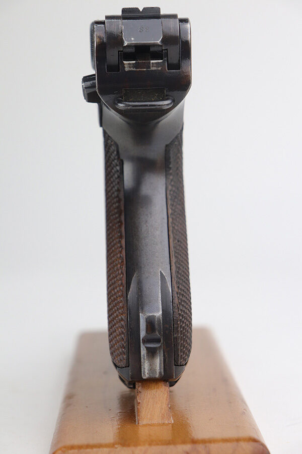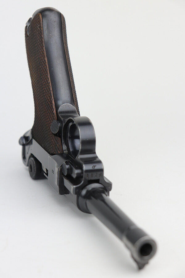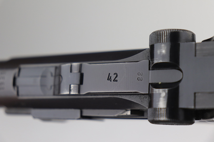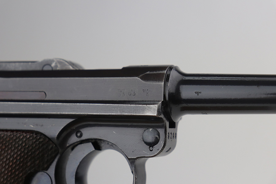 11/5/21 – This is an excellent example of a Mauser Luger issued to the Nazi military in 1939. It is all matching, has the proper “Eagle 63” Nazi military acceptance proofs, and has the proper “42” Mauser factory code on the toggle. It also comes with one original matching-numbered magazine. The gun has retained about 96-97% of its original finish. There is minor wear on the side plate, side rails, and around the muzzle. There is just a hint of thinning on the back strap, a few tiny scratches on the front strap, and tiny dots of oxidation on both straps. A few tiny handling marks on the right side of the frame. Comes with excellent un-numbered wood grips. The bore has good rifling with freckling throughout.
