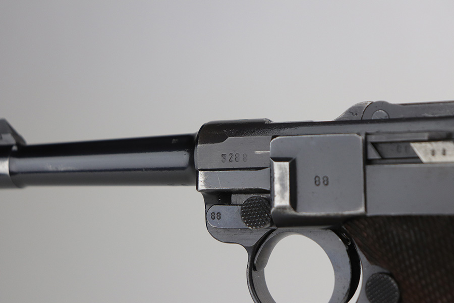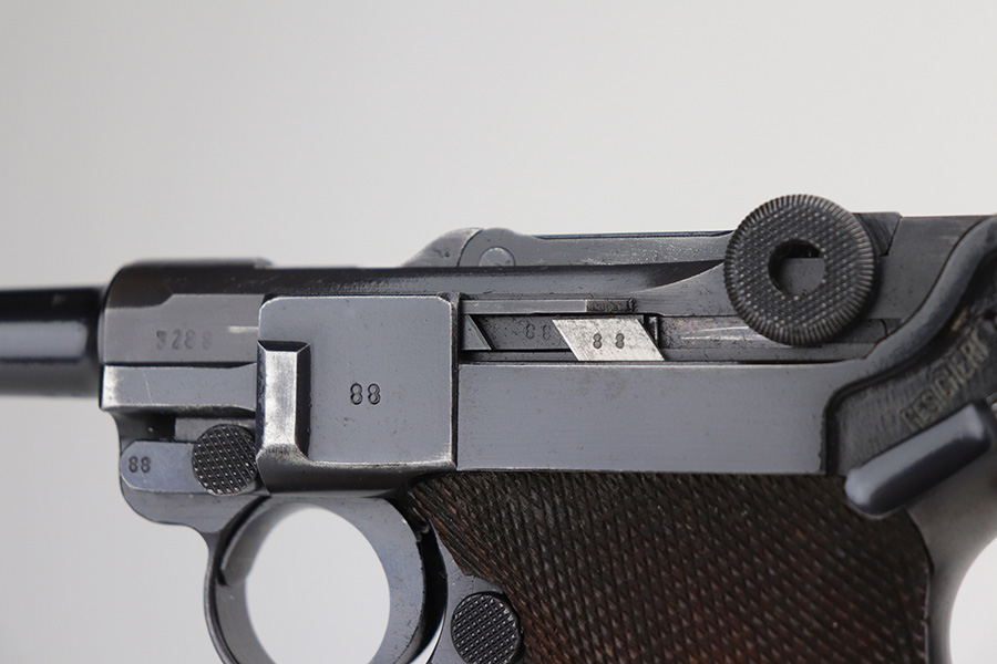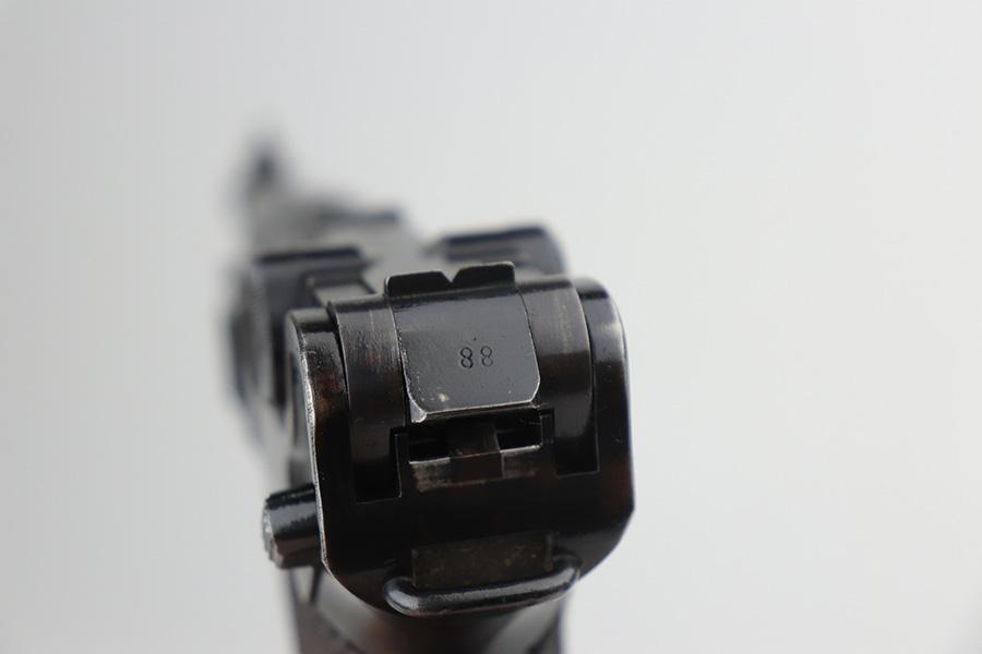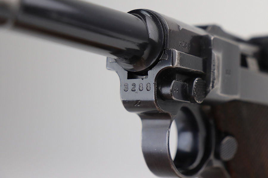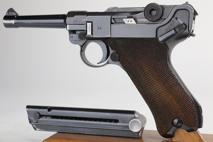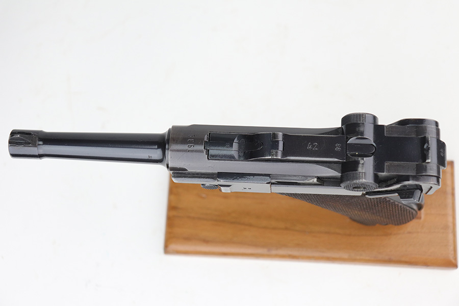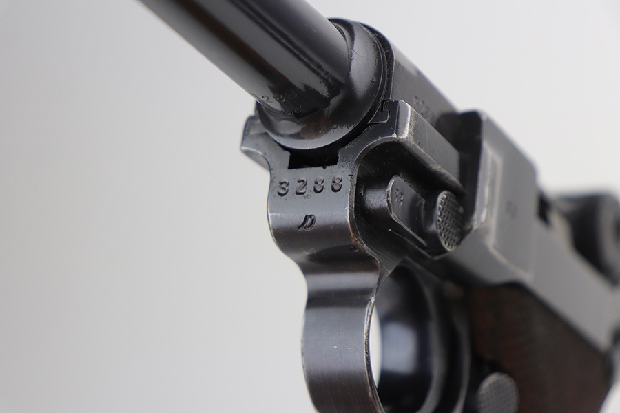 11/5/21 – This is an excellent example of a Mauser Luger issued to the Nazi military in 1939. It is all matching, has the proper “Eagle 63” Nazi military acceptance proofs, and has the proper “42” Mauser factory code on the toggle. It also comes with one original matching-numbered magazine. The gun has retained about 96-97% of its original finish. There is minor wear on the side plate, side rails, and around the muzzle. There is just a hint of thinning on the back strap, a few tiny scratches on the front strap, and tiny dots of oxidation on both straps. A few tiny handling marks on the right side of the frame. Comes with excellent un-numbered wood grips. The bore has good rifling with freckling throughout.