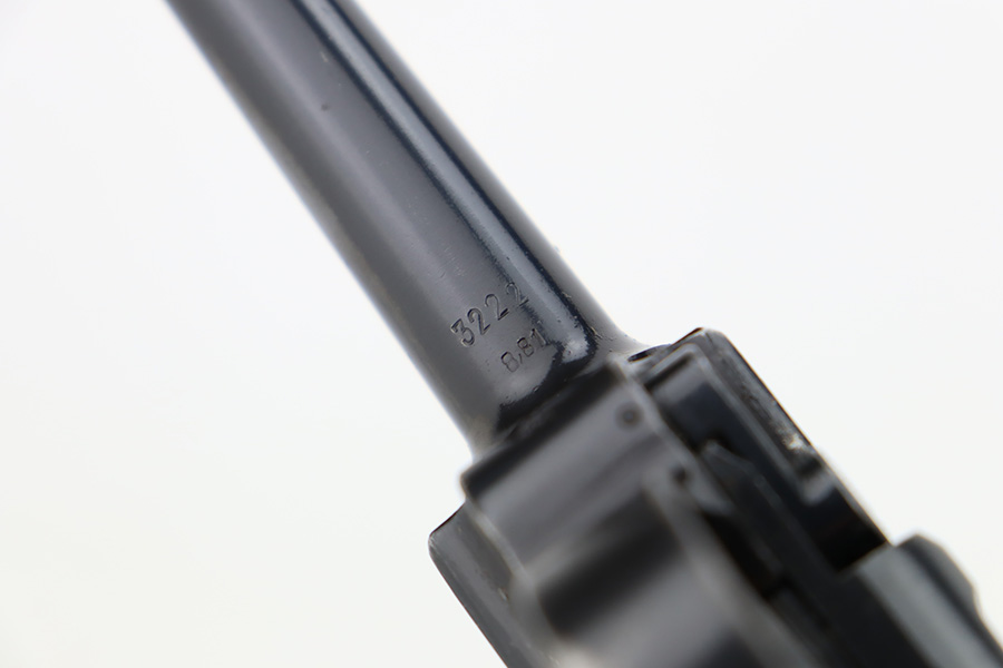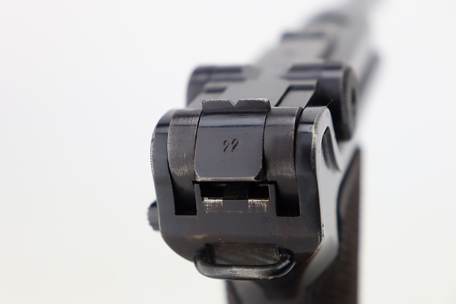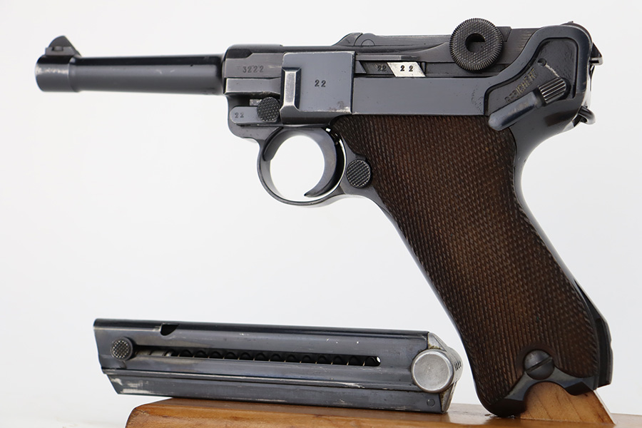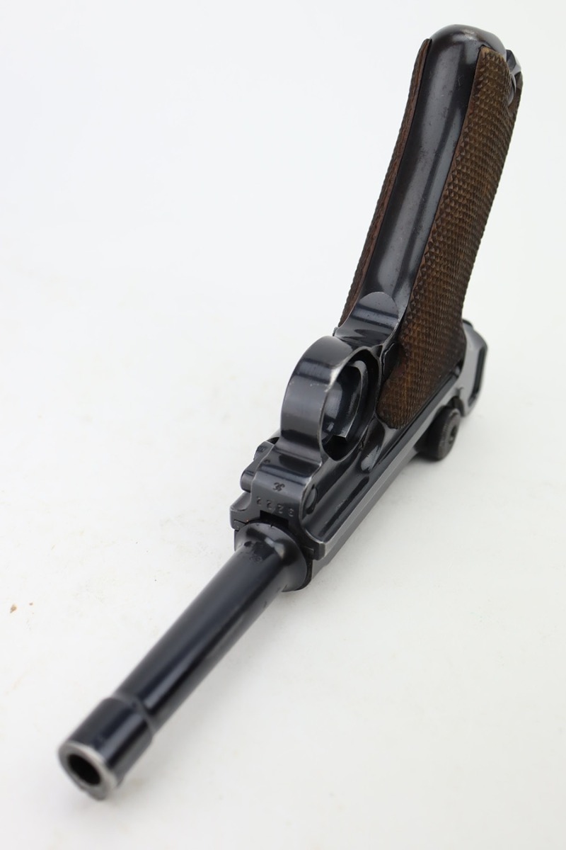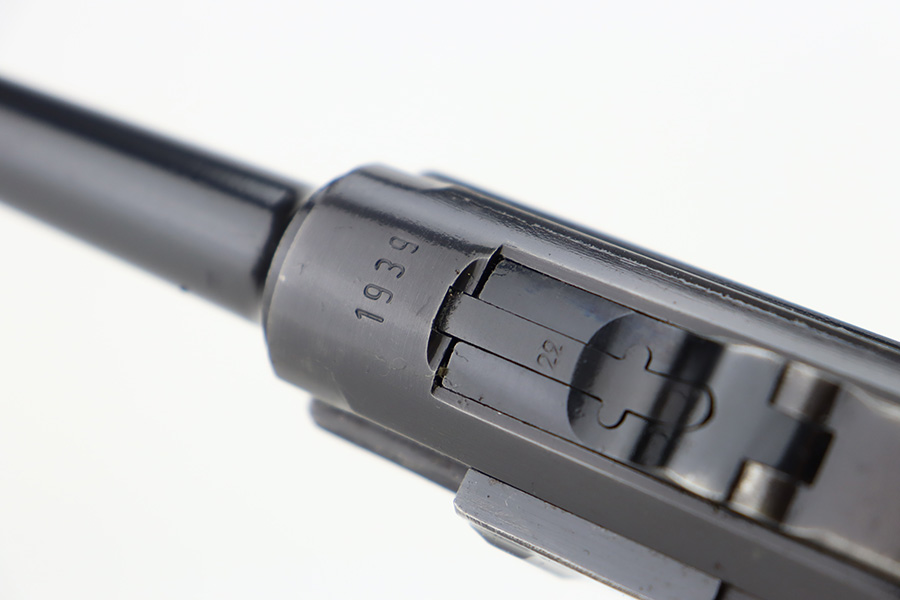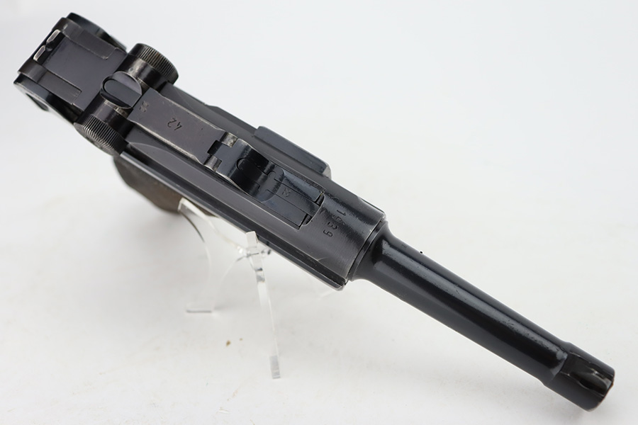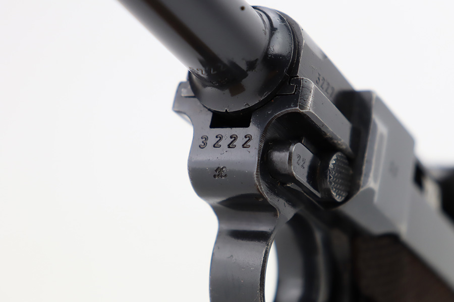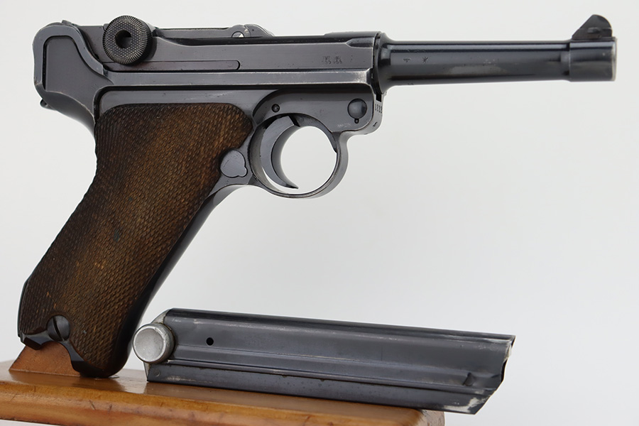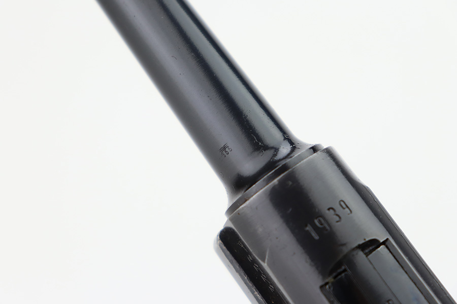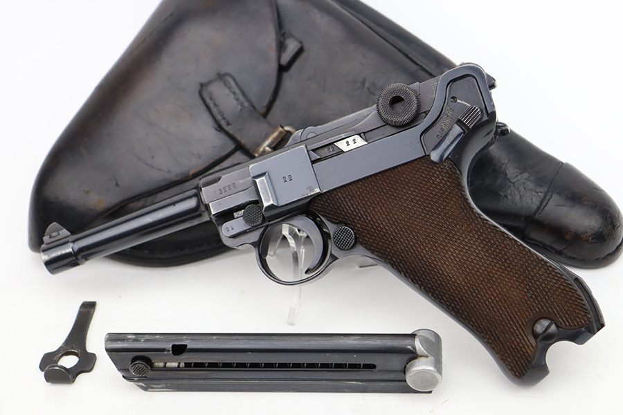 12/5/23 – This is an excellent Mauser Luger issued to the German military in 1939. All matching with the proper “Eagle 655” military acceptance proofs. It comes as a rig with a 1939-dated holster (repair on the toe), one original matching-numbered magazine, and an “Eagle 655” tool. The gun itself has retained about 95-96% of its original finish. Minor wear around the muzzle, on the side plate, and on the side rails. Light spotty oxidation on the grip straps. Fitted with excellent wood grips – the right is un-numbered, the left is mismatched. Excellent bore.