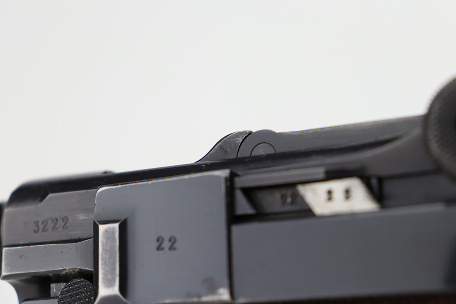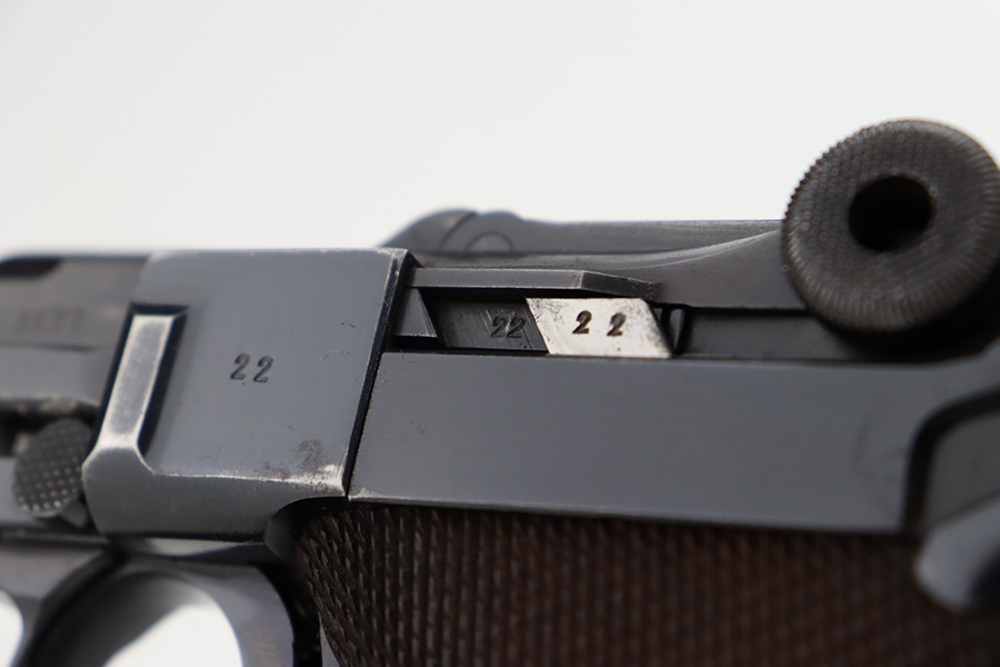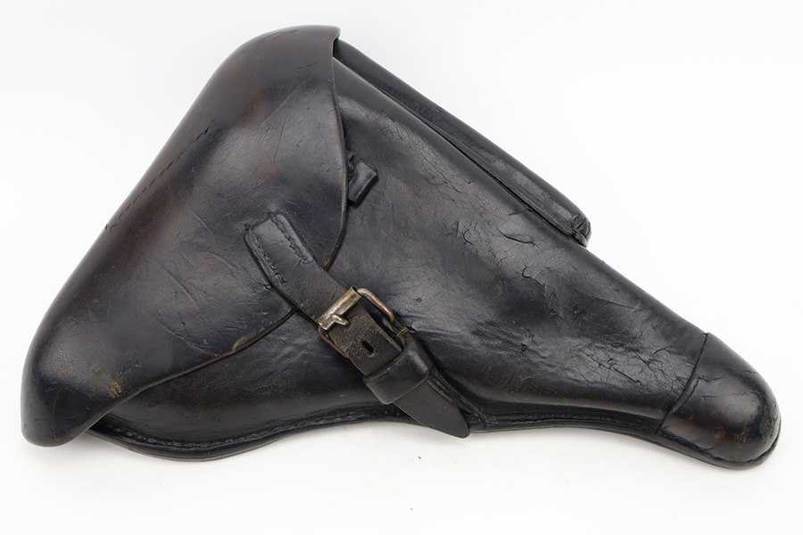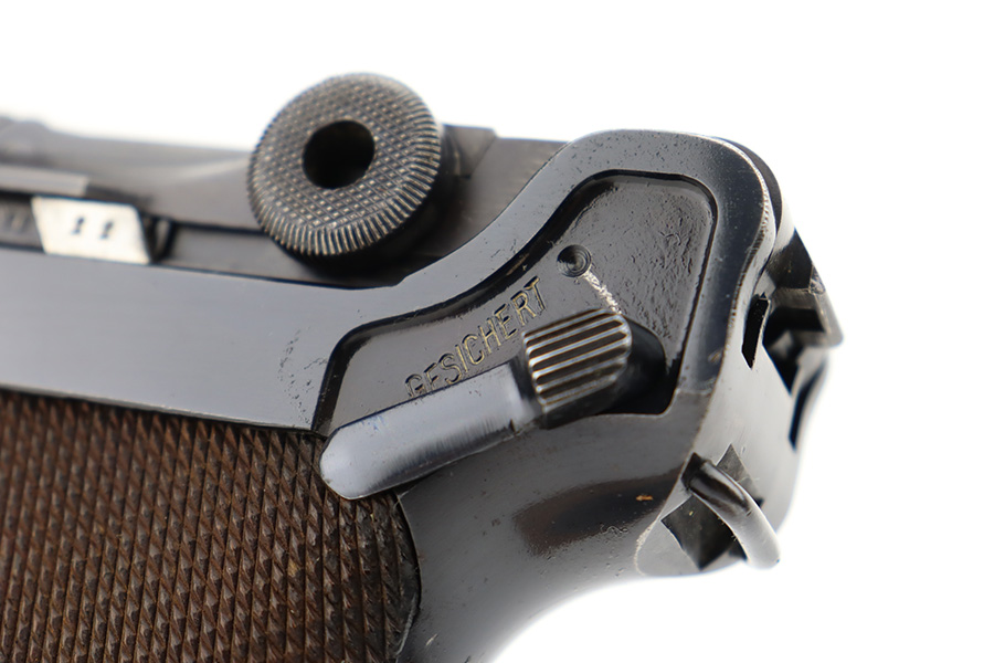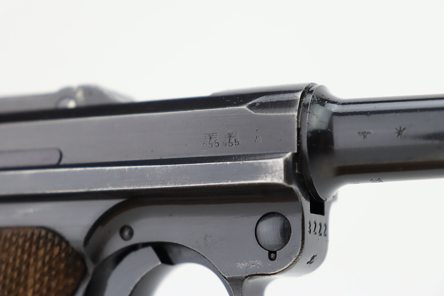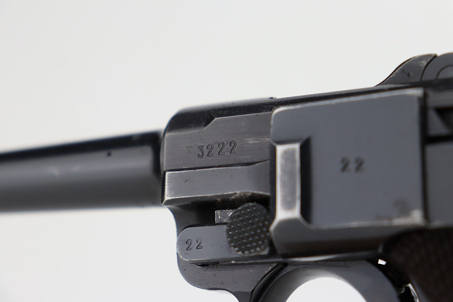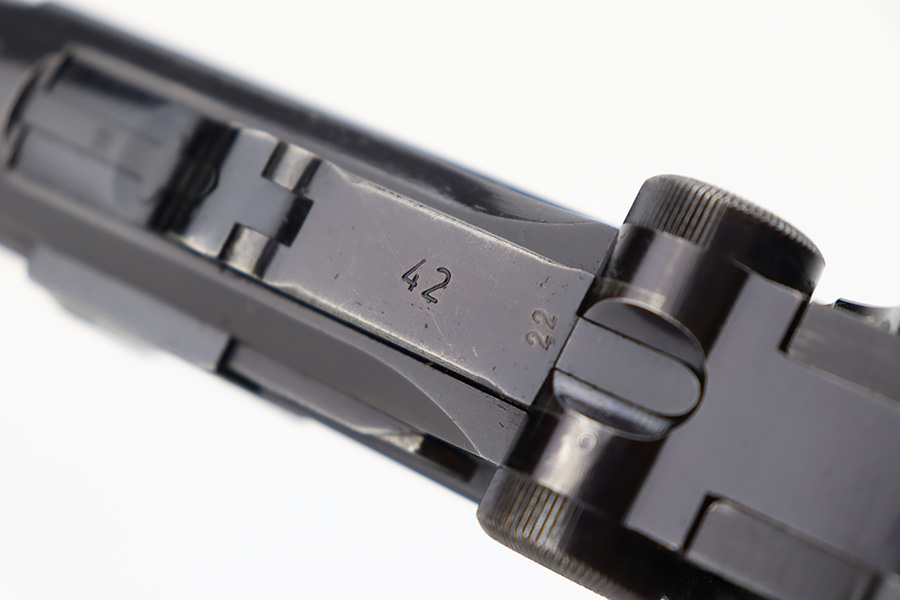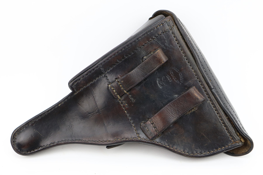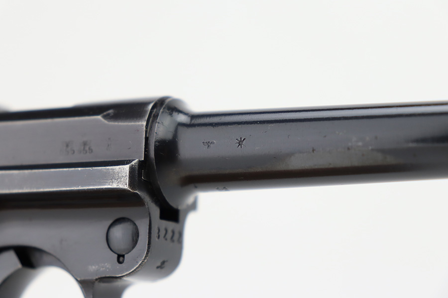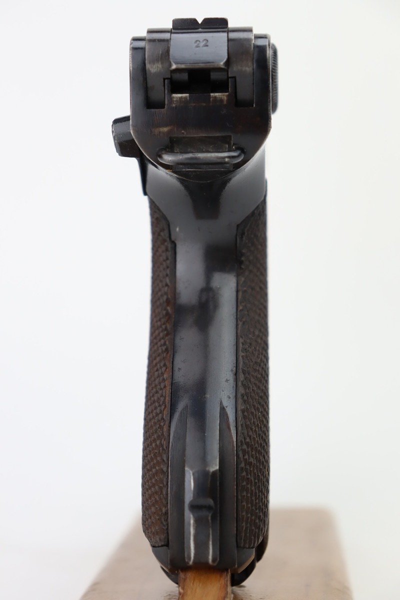 12/5/23 – This is an excellent Mauser Luger issued to the German military in 1939. All matching with the proper “Eagle 655” military acceptance proofs. It comes as a rig with a 1939-dated holster (repair on the toe), one original matching-numbered magazine, and an “Eagle 655” tool. The gun itself has retained about 95-96% of its original finish. Minor wear around the muzzle, on the side plate, and on the side rails. Light spotty oxidation on the grip straps. Fitted with excellent wood grips – the right is un-numbered, the left is mismatched. Excellent bore.
