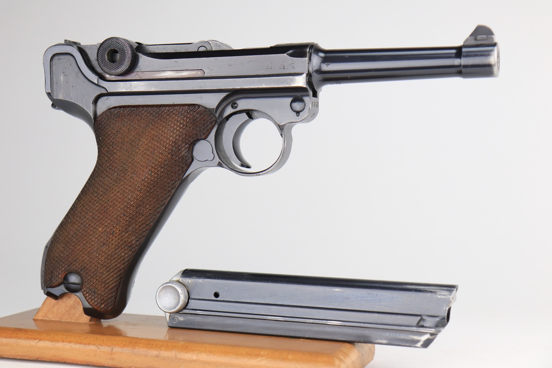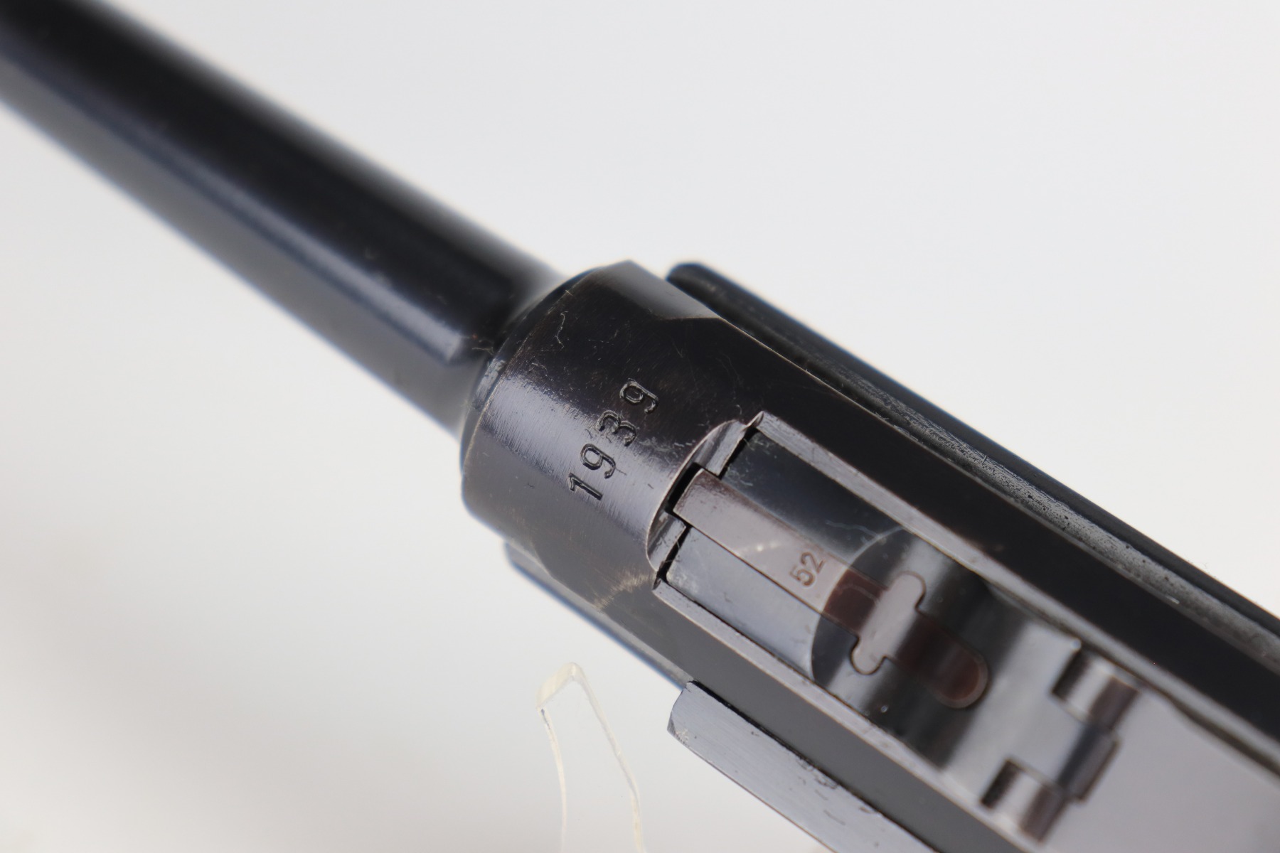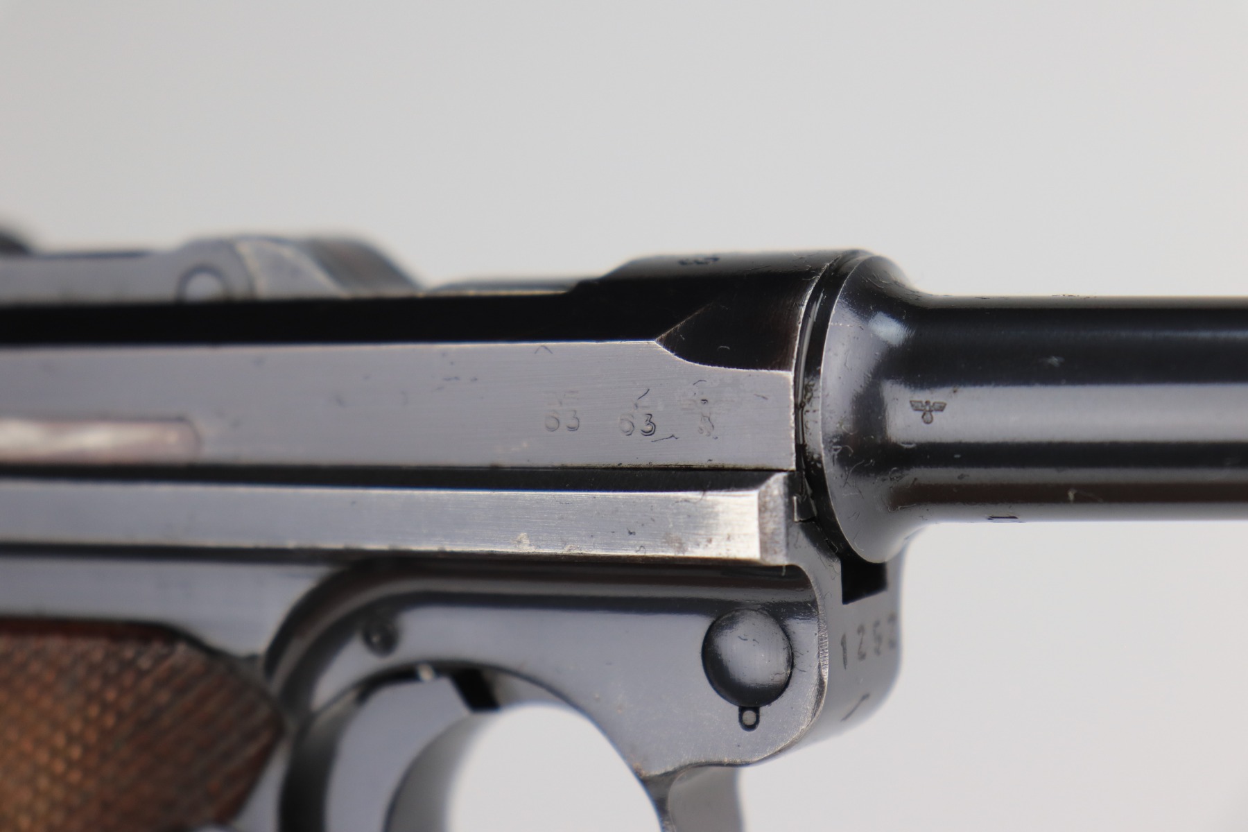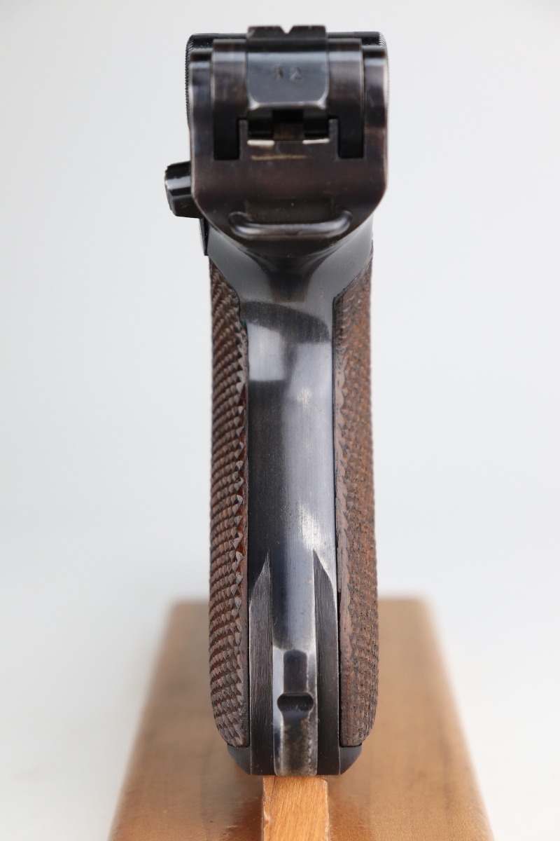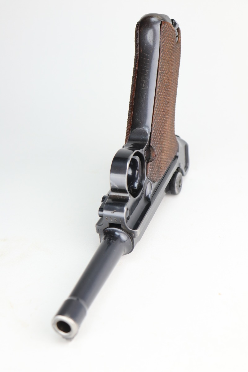 1/11/21 – This is an excellent example of a Mauser Luger issued to the Nazi military in 1939. This one is all matching and has the proper “Eagle 63” military proofs. It has retained about 95-96% of its original finish. There is minor wear around the muzzle, side plate, and high edges of the slide. There are a few small spots of wear and very minor thinning on the back strap. Unfortunately, someone scratched their name into the front strap. It comes with excellent un-numbered grips and a mismatched period-correct magazine. The bore is very nice – shiny with strong rifling and areas of minor freckling.