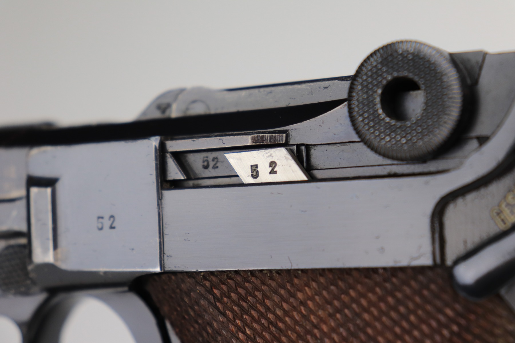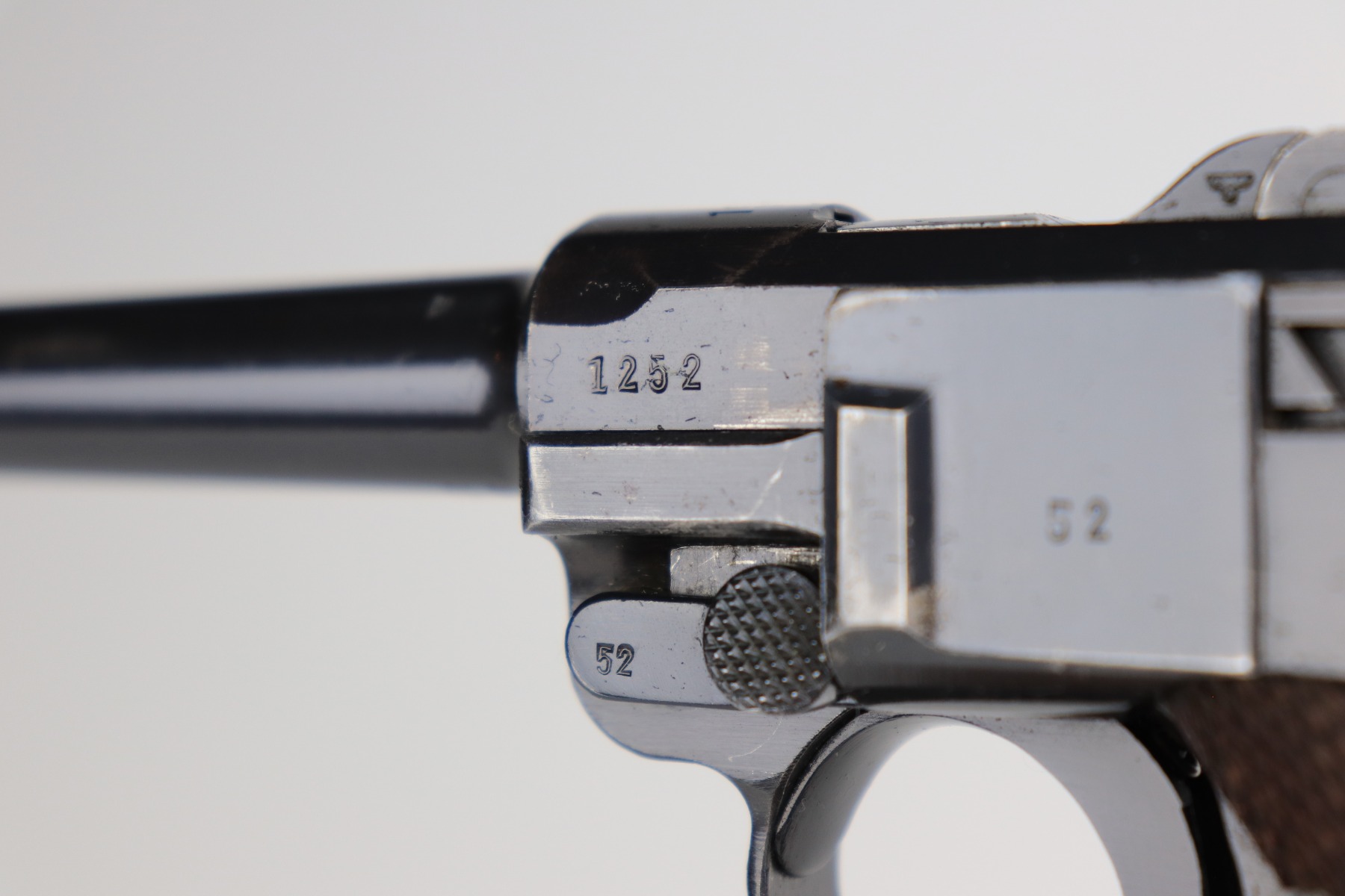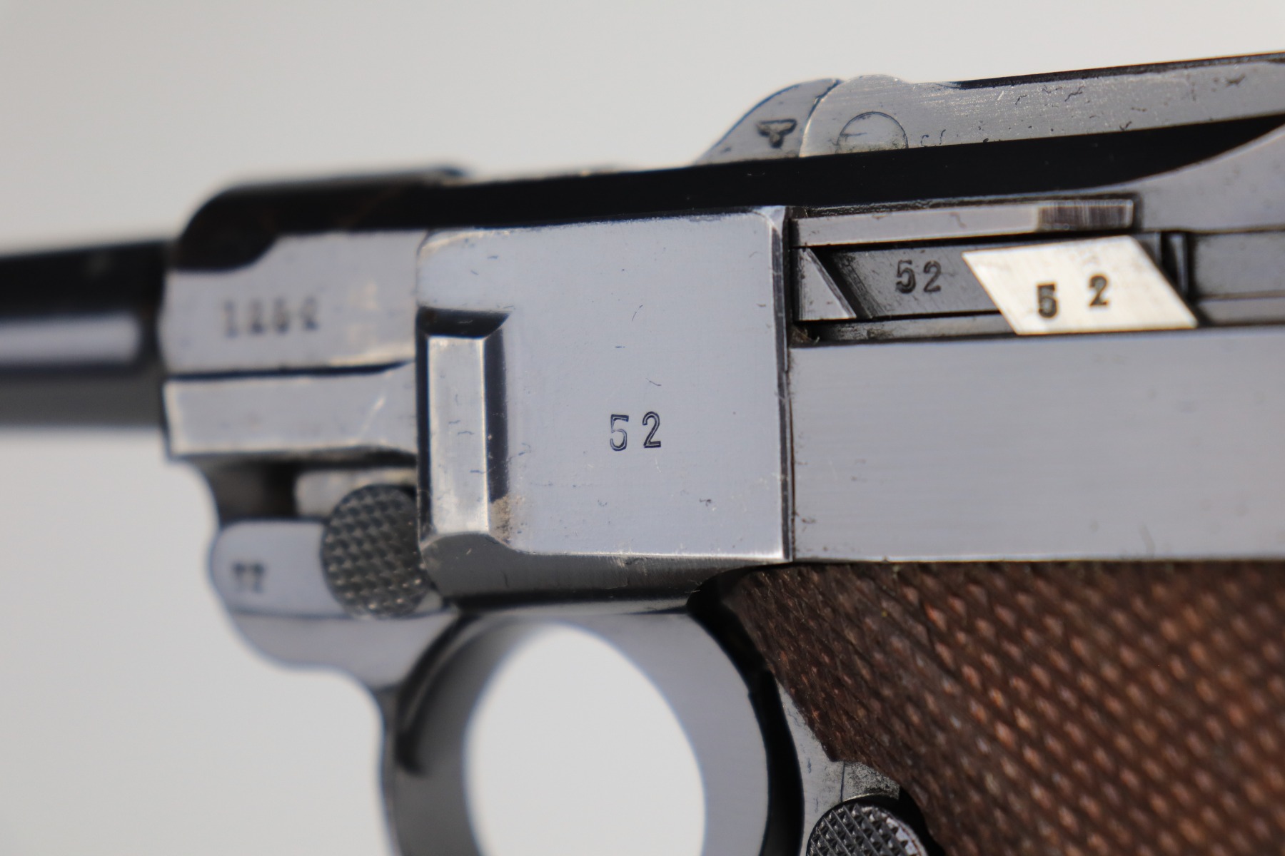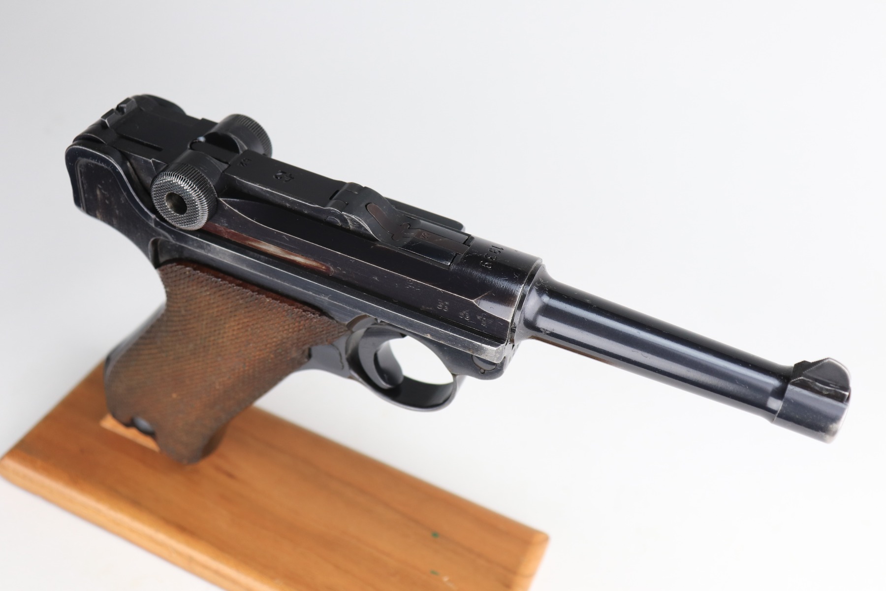 1/11/21 – This is an excellent example of a Mauser Luger issued to the Nazi military in 1939. This one is all matching and has the proper “Eagle 63” military proofs. It has retained about 95-96% of its original finish. There is minor wear around the muzzle, side plate, and high edges of the slide. There are a few small spots of wear and very minor thinning on the back strap. Unfortunately, someone scratched their name into the front strap. It comes with excellent un-numbered grips and a mismatched period-correct magazine. The bore is very nice – shiny with strong rifling and areas of minor freckling.